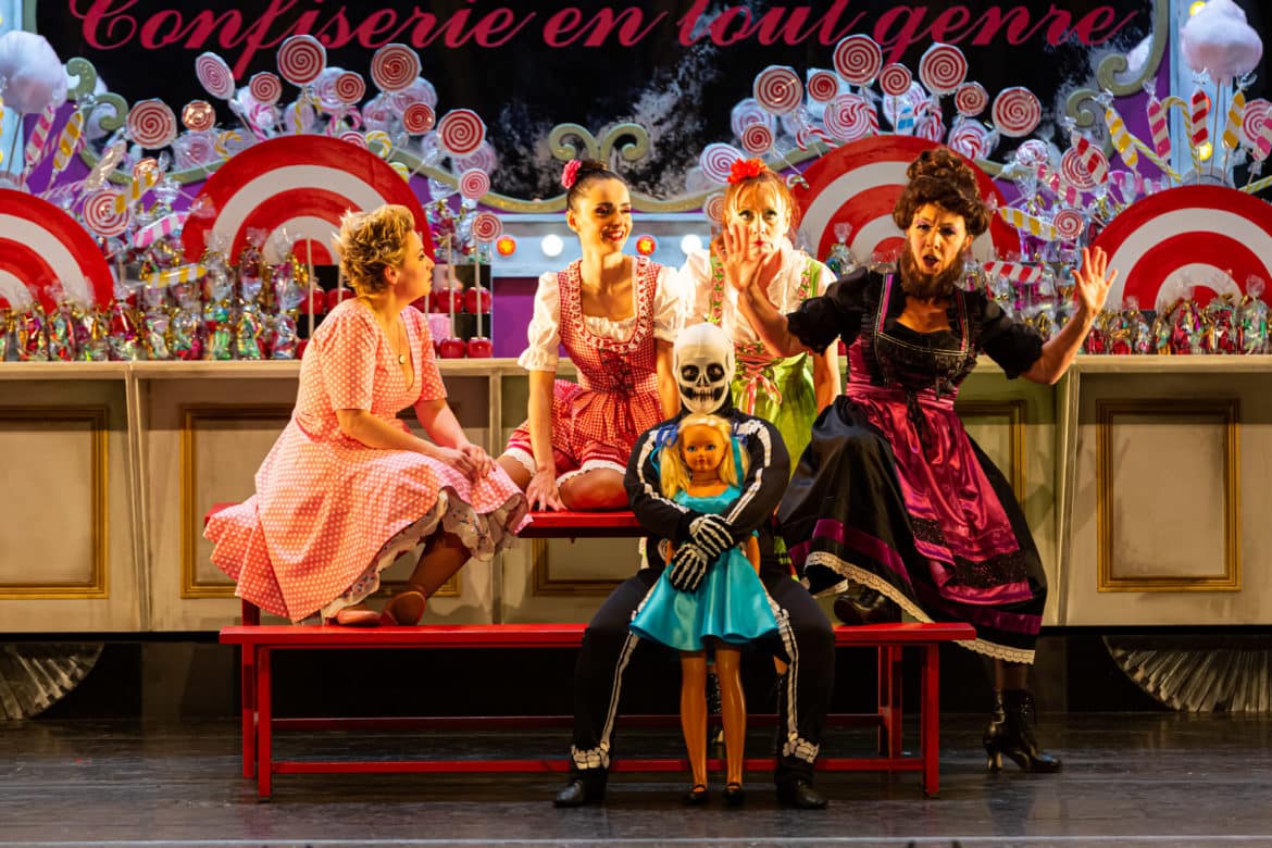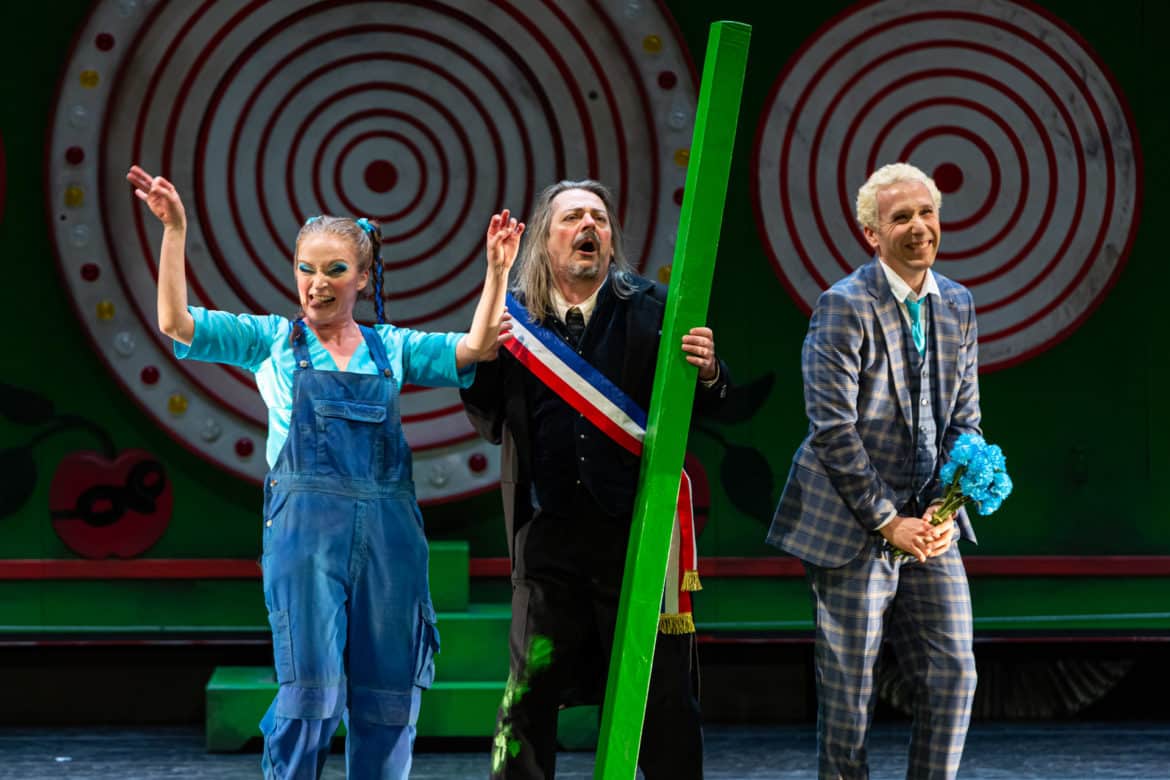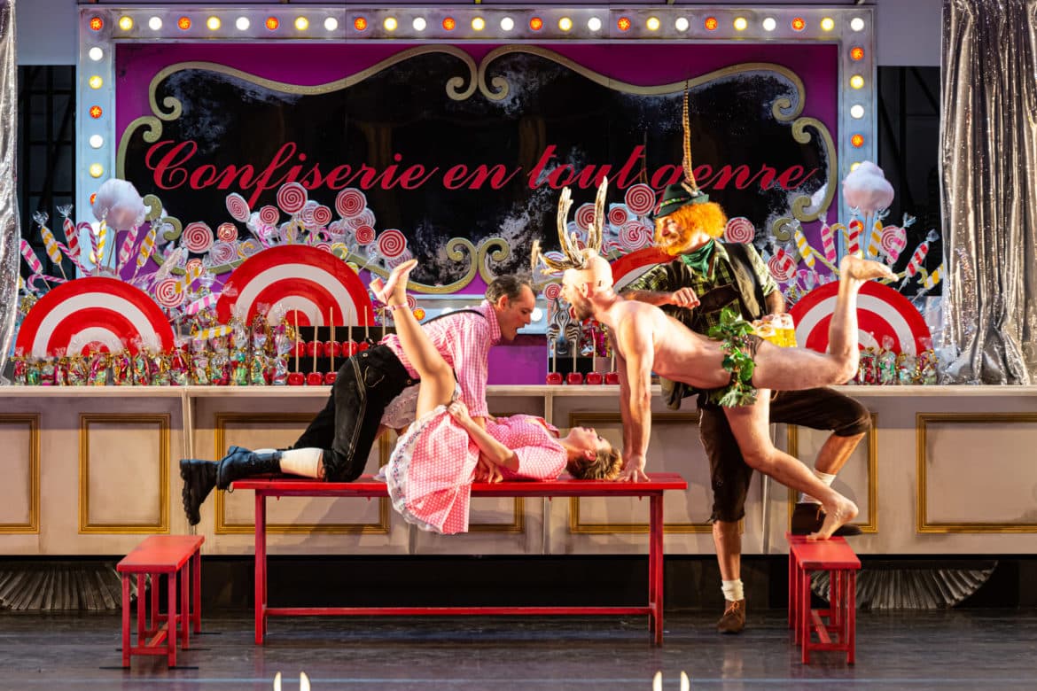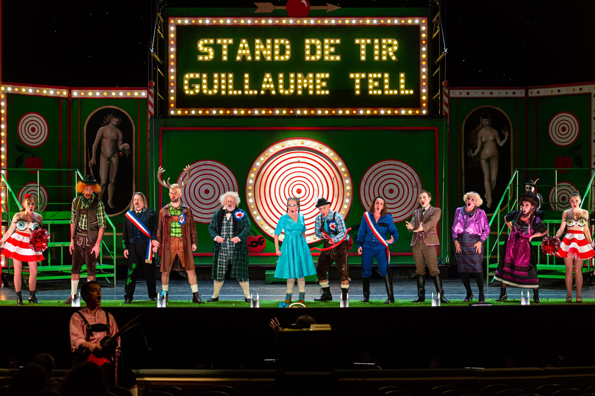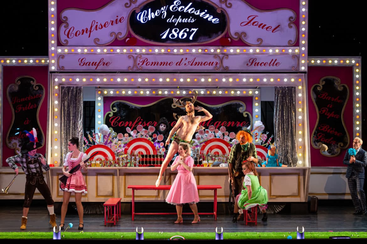 En décembre dernier, l’Opéra de Montpellier présentait à huis clos deux représentations du Voyage dans la lune, dont la tournée s’est arrêtée avant même d’avoir pu commencer. Après avoir soutenu cette féerie d’Offenbach qui conte les aventures du roi V’lan et de son fils, le Palazzetto Bru Zane est à l’initiative d’une autre histoire de V’lan : une nouvelle production de ce qui s’appelait initialement L’Œil crevé et qui, depuis quelques décennies, revient sur les scènes sous le nom de V’lan dans l’œil. Après Les Chevaliers de la table ronde et Mam’zelle Nitouche, la même équipe persiste et signe : Pierre-André Weitz signe décors, costumes et mise en scène, et se réserve même un rôle dans le spectacle. Le délire organisé qui en résulte est à la mesure de la joyeuse dinguerie du livret (on le croyait d’Hervé lui-même, mais il semblerait qu’Hector Crémieux y ait participé), qui prouve que la France avait aussi le goût du non-sens, pris à tort pour l’apanage des Anglo-Saxons. La réjouissante absurdité de l’intrigue, des couplets et même du nom des personnages trouve un écho dans les décors pimpants – trois stands d’une fête foraine – et les costumes foutraques, mi-bavarois, mi-1900, mi-n’importe quoi, sans oublier le jeu systématiquement outré auquel sont désormais habitués les spectateurs ayant vu les précédents opus susmentionnés.