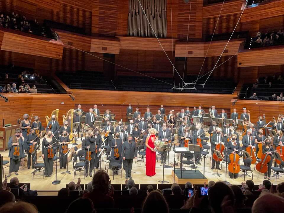 La prestation de Karita Mattila fut elle aussi tout en nuances, chose que ne présageait guère son costume de scène. Mais la Mort de Moussorgski dans la « Berceuse » et la « Sérénade » qui ouvrent le cycle ressemble beaucoup à celle, séductrice, tendre et rassurante de Schubert. Pour ce que l’on peut considérer comme sa prise de rôle, Karita Mattila, hiératique alors, toute d’intensité contenue, a été parfois à la limite de l’audible dans ses nuances pianissimo, toujours maîtrisées, jamais détimbrées, sans graves exagérément poitrinés. Elle a réservé ses coups d’éclats et ses aigus claironnants et fermes au « Trépak » où elle enlace un paysan ivre et au « Chef d’armée », la pièce qui clôt le cycle, faisant vivre ces personnages et leurs émotions : ce n’est pas pour rien qu’elle chante surtout l’opéra. En bis, la diva (son deuxième rôle ce soir-là) et l’orchestre nous ont offert « une mélodie finlandaise », Mattila dixit, au lyrisme quasi straussien, qui pourrait être une de ces mélodies de Sibélius dont elle a préparé un programme avec le chef et compositeur Jaakko Kuusisto. Là aussi elle fut parfaite.