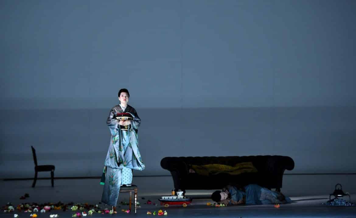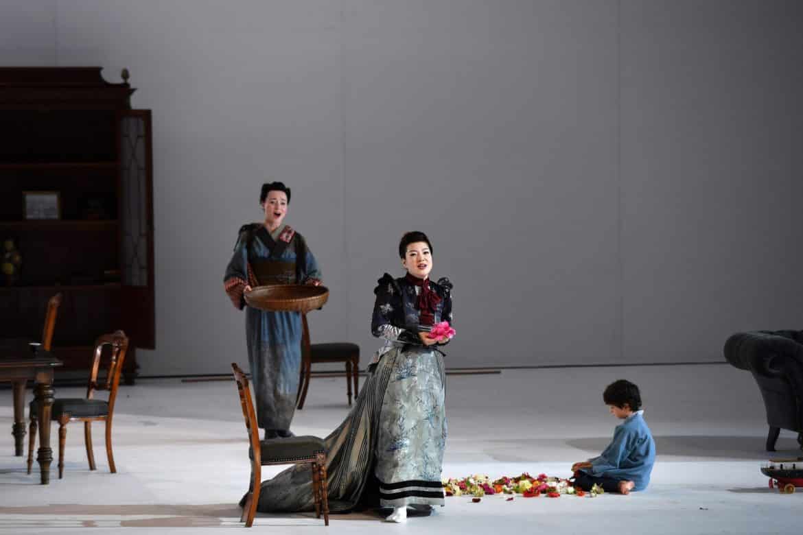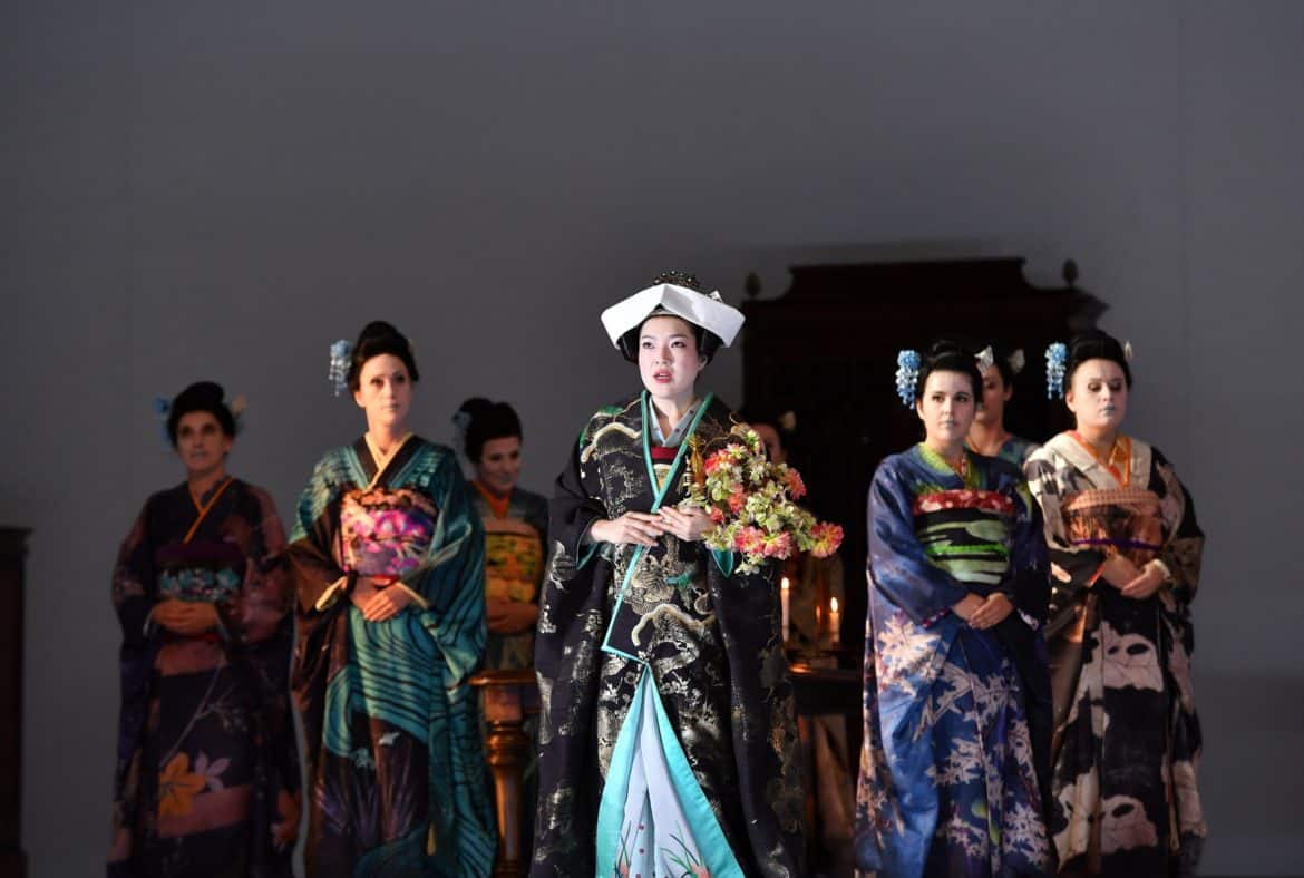 Gradation des éclairages en diagonale, immensité de l’espace blanc, cloison murale coulissante : le cadre scénique s’inspire des estampes nippones (Hiroshige), si prisées en Europe à la Belle Époque. Selon le vœu de Ted Huffman, metteur en scène en résidence à Montpellier (remarqué pour le surréalisme du Songe d’une nuit d’été, 2019), l’espace vacant permet au spectateur de « créer son propre monde, qu’il puisse réfléchir aux émotions, à la trame psychologique et ne soit pas distrait par le décorum de l’architecture exotique ». Au fil de la progression tragique, la lumière de cet espace (D. Wood) et les rares accessoires se métamorphosent toutefois. La crudité de l’éclairage et les va-et-vient incessants correspondent à l’installation du prédateur Pinkerton qui achète maison et geisha, le tout « à la mode japonaise », soit pour un bail limité. Brutalement assombri lors du reniement de la geisha par le vieil oncle, l’éclairage vire aux tons chauds tamisés pour l’ivresse de la nuit nuptiale. Après l’entracte, la continuité des 2e et 3e actes s’opère sous la subtile gradation nuit/aube, en cela fidèle à la version originale de Puccini (Milan, 1904), qui ramassait en un seul acte la déchéance de Butterfly.