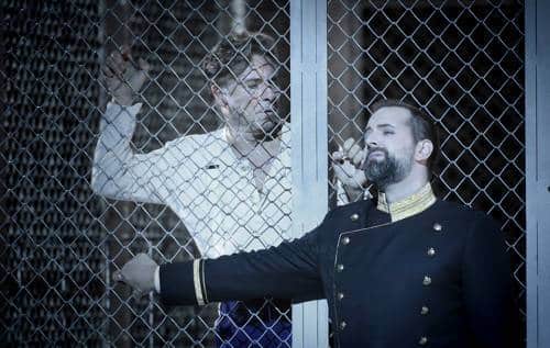 Nous avions déjà admiré cette mise en scène qui interprète avec efficacité le drame politique et sentimental verdien en mettant en exergue l’abîme psychologique qui corrode les protagonistes. Le metteur en scène nous propose des espaces scéniques au décor essentiel et aux boiseries sombres, qui reprennent vaguement le style décoratif des années 1940. L’Espagne de Franco qui s’y élève comme une ombre inquiétante est peut-être un choix facile, mais son mérite est de rendre avec efficacité l’austérité d’un pouvoir corrompu par le fanatisme religieux. Les scènes sont souvent animées par des projections en noir et blanc qui font l’effet de vieilles bobines salies par le temps. Ces images devraient nous transmettre le déchirement intérieur des quatre personnages principaux, et si leur fonction didascalique nous agace un peu, elles confèrent cependant une certaine force visuelle à l’action. Les relations entre les personnages sont étudiées sous plusieurs angles de vue et en particulier celle entre Don Carlo et Rodrigue dont le lien d’amour et d’amitié est centré avec force et efficacité dramatique. C’est en réalité cet amour-là qui est jalousé par l’attachement possessif de Philippe envers le jeune marquis. Par conséquent le thème de l’amour entre Don Carlo et Elisabetta et le scandale qui en découle passent presque au second plan, nous touchant moins que ce triangle masculin qui est au centre du drame et qui se termine par le sacrifice de l’élément perturbateur.