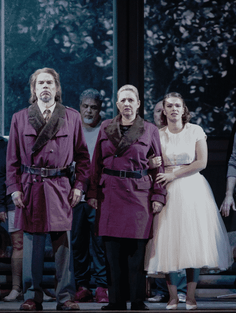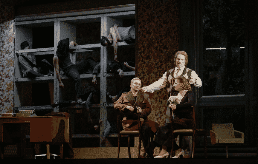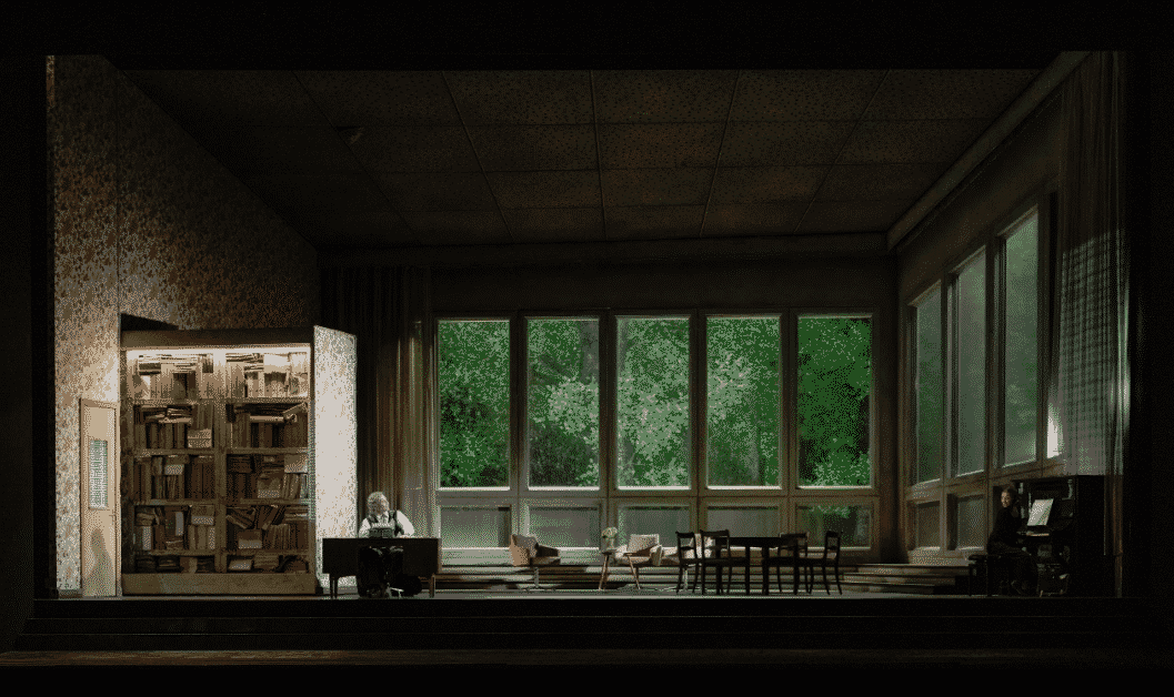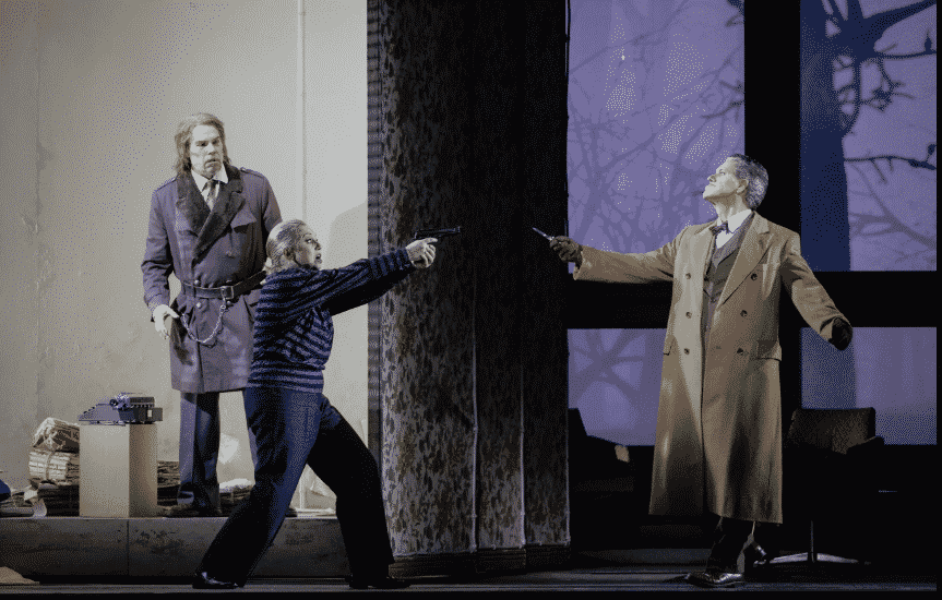 Comment comprendre l’omniprésence d’une nature sauvage sur laquelle donnent les fenêtres de l’appartement ? Celle-ci s’impose particulièrement dès l’ouverture du second acte, alors que retentissent les teintes sombres de l’orchestre. La forêt s’agite, un loup paraît. Est-ce une façon de plonger le spectateur dans le Sturm und Drang d’une époque désormais sensible à la nature, alors même qu’il découvre Florestan reclus, passant de la souffrance à l’enthousiasme ? Le ténor Erin Caves, qui fut Parsifal et sera bientôt Siegfried, nous fait définitivement quitter les rivages mozartiens du premier acte pour des territoires pré-wagnériens.