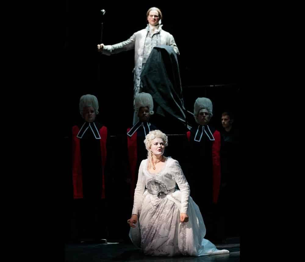 Le rideau s’ouvre par une célèbre chanson en cette fin de XVIIIe siècle : « Mon coursier hors d’haleine ». C’est d’ailleurs le seul moment chanté en français. Le début de l’action nous place dans un lieu post-mortem où des aristocrates emperruqués, rassemblés autour de feu Louis XVI et défunte Marie-Antoinette, s’ennuient. Un premier climax orchestral (il y en eut beaucoup) déchire l’atmosphère. Le souvenir de l’acier, du sang et des piques trouble la sinistre compagnie. S’il est chanté que « sourire est un devoir », comment sourire lorsque l’on n’a plus la tête sur les épaules et que l’on est mort depuis deux cents ans ? Le premier air de MarieAntoinette, « Let me forget », évoque le charme des oiseaux d’or et des arbres d’argent d’avant 89. Mais elle revit aussi, terrifiée, son exécution dans un maelström de sons fortissimo.
