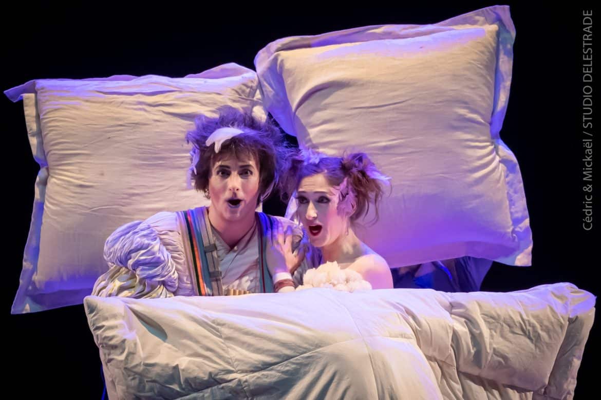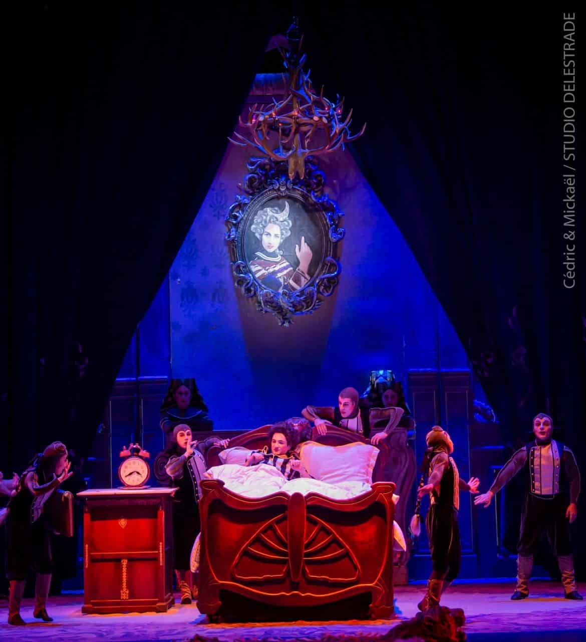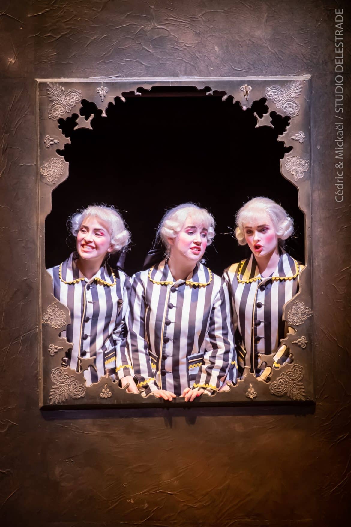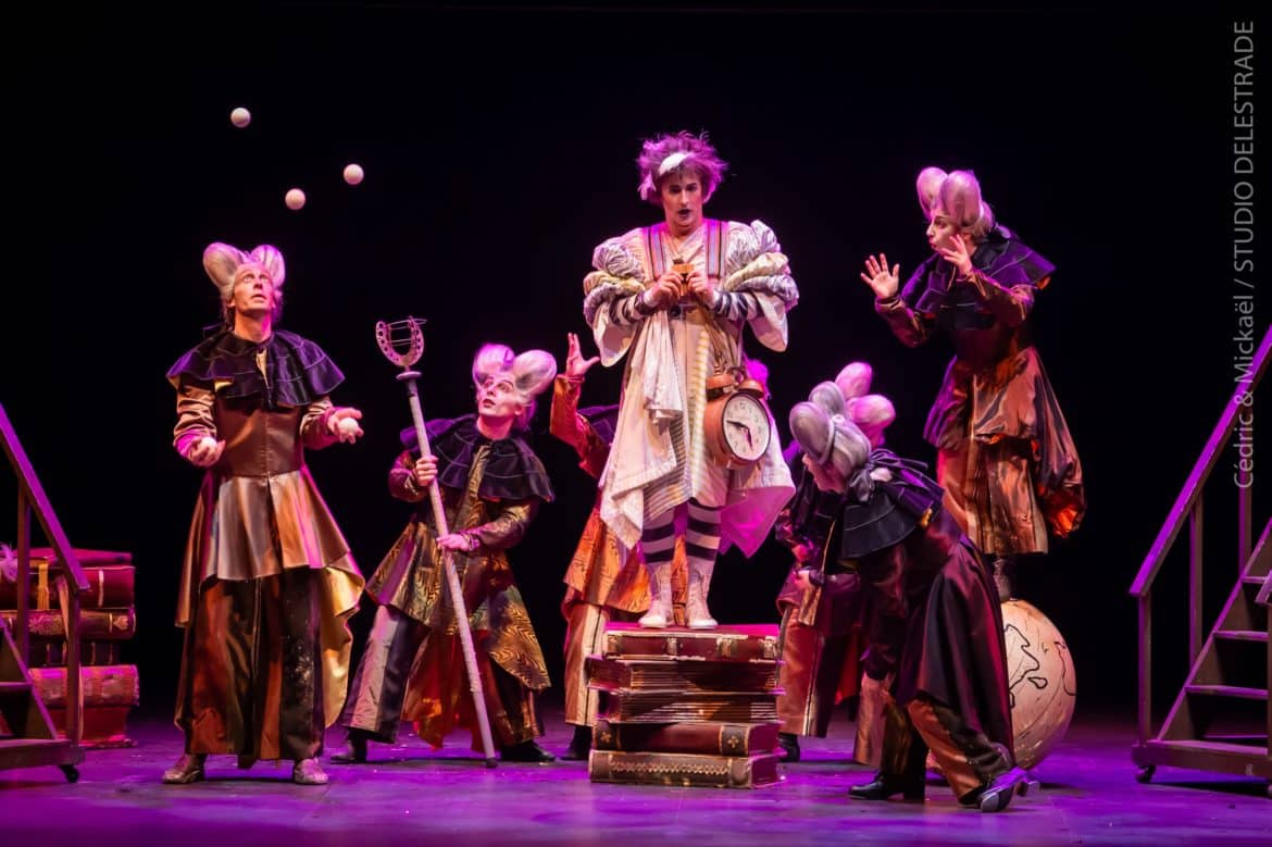 La scénographie de Cécile Roussat et Julien Lubek était à ce propos vraiment remarquable, et nécessite que l’on s’y attarde. On note de nombreuses influences hétéroclites qui enrichissent significativement l’expérience sonore. Nous avons d’abord l’impression d’assister à un dessin animé, où des personnages en modèles réduits par rapport aux décors se meuvent le plus souvent en synchronisation avec la musique : c’est du mickeymousing. Mais la plus grande inspiration pioche des éléments propres au cirque, avec une troupe d’acrobates qui réalise en parallèle de l’histoire une deuxième trame. Ainsi, nous les voyons emprunter tout autant d’accessoires au cirque qu’il est possible : monocycle, quille de jonglage, colombes (vraies!), corde de funambule, et claquettes (ce numéro étant réalisé sur le glockenspiel – association aussi insolite qu’intéressante) et même… pole dance ! Les épreuves de Tamino sont donc assurées par une doublure dont les acrobaties témoignent de la difficulté du personnage à triompher. Sur ce point, les « chanteurs modèles-réduits » sont parfois réduits au rôle de fond sonore accompagnant le visuel très riche de la scène – mais la mise en scène l’avait annoncé dès le départ, lorsque l’orchestre commence l’ouverture après qu’un acrobate a allumé un phonographe. Nous avons ainsi l’impression d’assister à ces célèbres spectacles viennois de marionnettes qui se servent des musiques de Mozart pour donner vie à leurs pantins. D’autres éléments subtils gagent de la qualité de lecture des metteurs en scène : ombres chinoises, arbre mobile tout en acrobates lorsque Papageno veut se pendre, traditionnelle grande robe de la reine de la nuit réservée pour le final. Mais ce qui dépasse l’ensemble est probablement, au-delà de la forme, le fond de ce qui est raconté. Nous sommes au premier acte dans une chambre où Tamino est endormi. Tous les personnages vont sortir d’un endroit du décor (Papageno du lit, Monostatos de la cheminée, la Reine de la nuit d’un portrait…). Le temple de Sarastro est quant à lui symbolisé par une immense bibliothèque, gage du savoir et de la connaissance. Le deuxième acte se passe, précisément, à l’intérieur de cette bibliothèque, où des livres immenses servent de points d’entrée et de sortie aux personnages. La traduction française se permet même une mise en abyme lorsque Pamina et les trois enfants chantent devant une page du livret original. Les successions de scènes se font ainsi au gré des successions de pages. À la fin, tout s’éclaire : l’histoire était en fait racontée par Sarastro, père d’un tout petit Tamino endormi, avec autour, un exemplaire de chaque personnage. La chambre, les livres : tout cela n’était qu’une féérie, un conte animé de Noël.