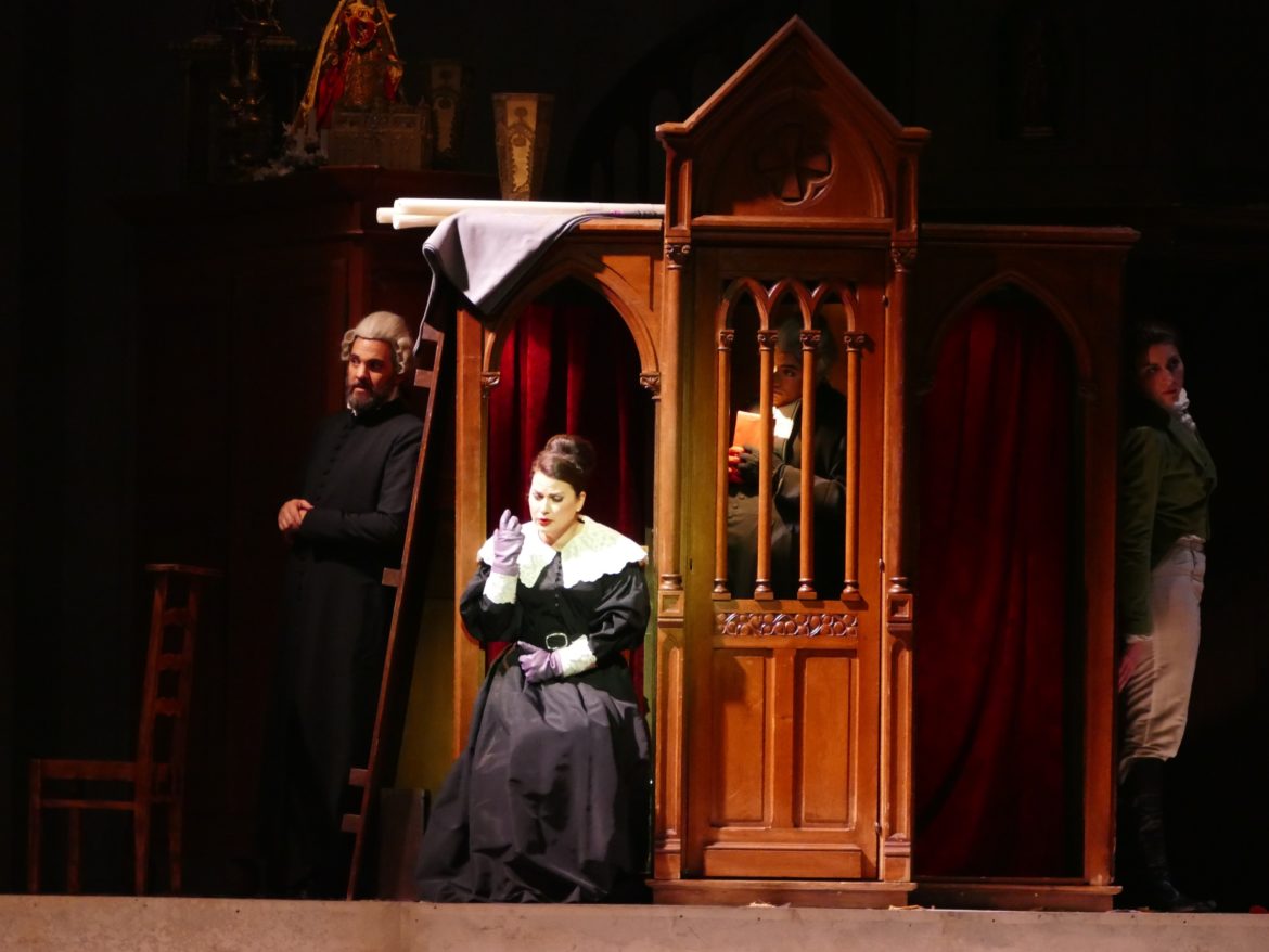 Ève-Maud Hubeaux, simple Ragonde à l’Opéra-Comique promue ici Isolier, remporte elle aussi un succès mérité. On est avant tout impressionné par la facilité de la projection, qui n’empêche nullement cependant les nuances ni le respect du style – à deux points d’orgue près, un peu trop longtemps tenus dans le duo avec Ory. La chanteuse est, de surcroît, extrêmement crédible scéniquement. Armando Noguera s’amuse beaucoup en Raimbaud. Il porte aussi bien le costume et le chapeau haut de forme que la robe de bure, et manie avec la même aisance le chapelet et le litron de rouge ! Il ne fait qu’une bouchée de son air du II, faisant preuve de son habituel respect du style rossinien, d’une belle maîtrise du souffle, d’un goût très sûr (le second couplet de la cabalette est orné avec sobriété et délicatesse), et d’une totale intelligibilité – ce qui ne surprend guère chez ce chanteur d’origine argentine mais parfaitement francophone.