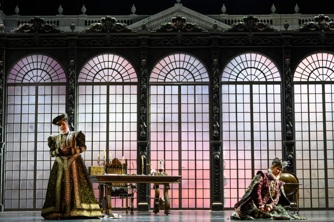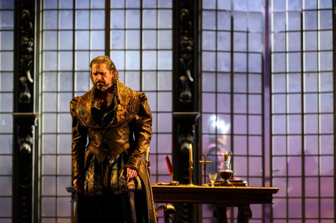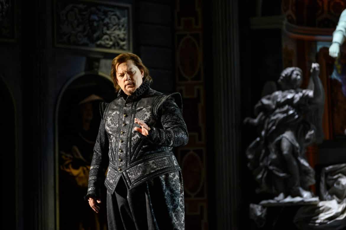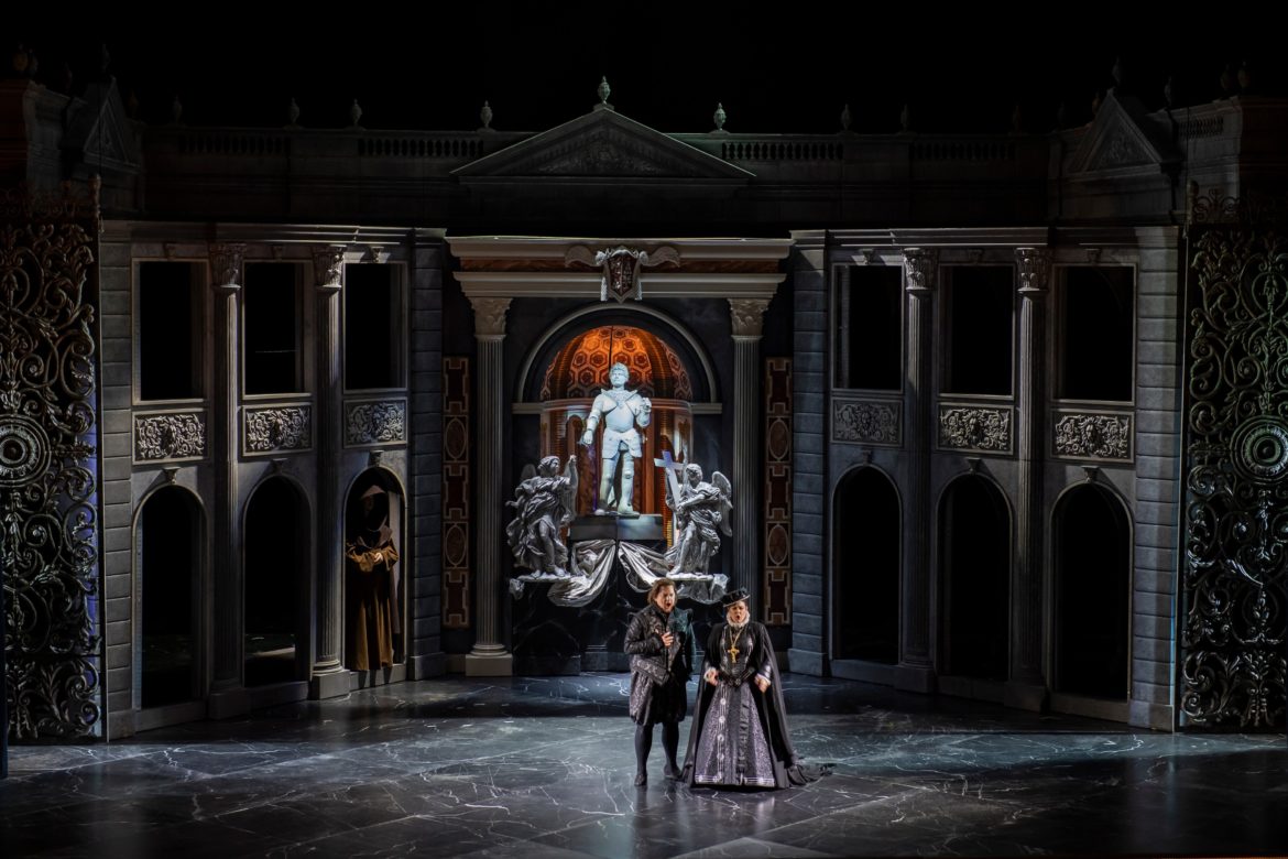 L’Opéra Royal de Wallonie a la réputation de présenter des spectacles aux mises en scène plutôt sages, à quelques exceptions près (le Faust signé Stefano Poda la saison passée en est une notable). Ce Don Carlos, mis en scène par Stefano Mazzonis di Pralafera, n’échappe pas à la règle : nous ne sommes ni sur la Lune, ni dans un camp de réfugiés, ni dans les bureaux administratifs d’une entreprise , mais bel et bien à Fontainebleau puis à la cour de Philippe II, en Espagne, en 1559 – ce dont témoignent les très beaux décors de Gary Mc Cann  (superbement éclairés par Franco Marri) et les costumes de Fernand Ruiz. Le spectacle se présente comme une simple mais belle mise en images de l’œuvre, sans relecture particulière – les détracteurs des spectacles dits « traditionnels » diraient « sans lecture » : les deux seuls aspects véritablement  originaux du spectacle résident d’une part dans l’omniprésence du Moine mystérieux, témoin impassible et (presque toujours) muet du drame qui se joue devant lui ; d’autre part dans la pantomime jouée pendant l’introduction de l’air de Philippe II : on y voit Eboli présenter à Philippe le coffret qu’elle vient de dérober à la Reine ; on y voit également une étreinte entre le Roi et la Princesse. Si cette pantomime clarifie l’action, elle nous semble cependant entrer en contradiction avec la musique, suggérant le vide et l’incommensurable solitude dans laquelle se trouve plongé le Roi…