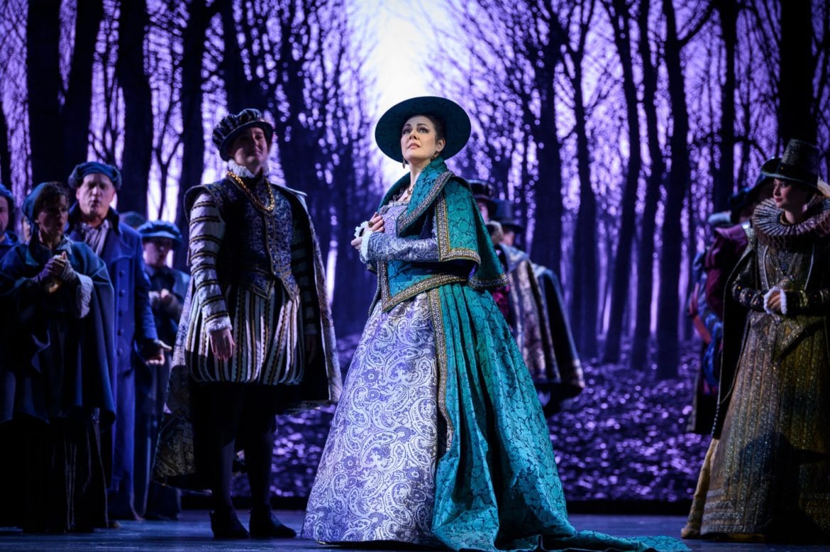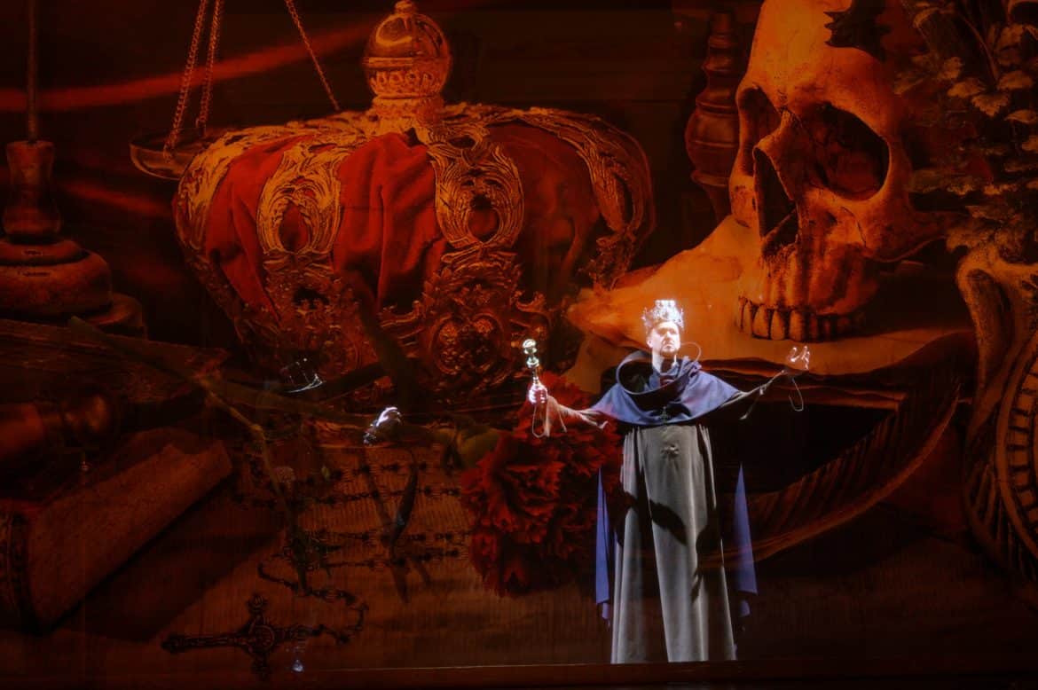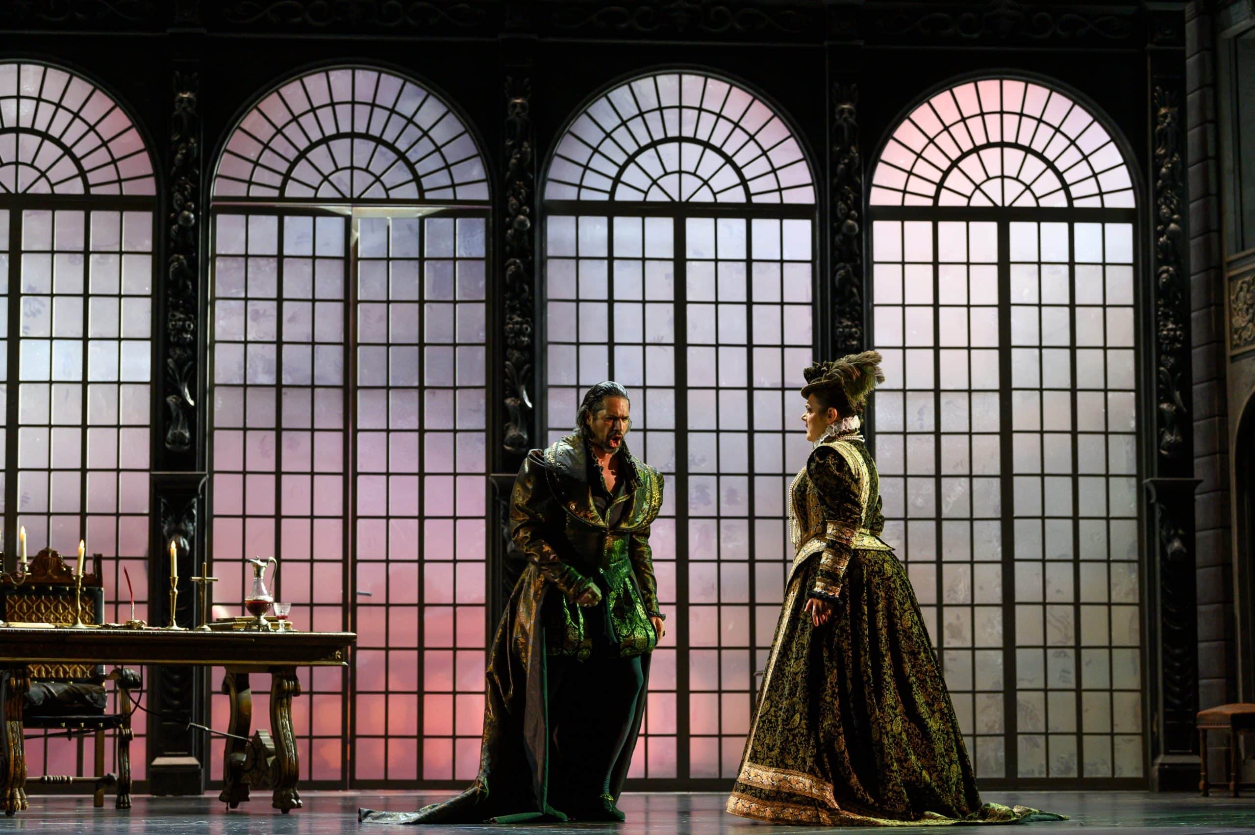 L’Opéra Royal de Wallonie a la réputation de présenter des spectacles aux mises en scène plutôt sages, à quelques exceptions près (le Faust signé Stefano Poda la saison passée en est une notable). Ce Don Carlos, mis en scène par Stefano Mazzonis di Pralafera, n’échappe pas à la règle : nous ne sommes ni sur la Lune, ni dans un camp de réfugiés, ni dans les bureaux administratifs d’une entreprise , mais bel et bien à Fontainebleau puis à la cour de Philippe II, en Espagne, en 1559 – ce dont témoignent les très beaux décors de Gary Mc Cann  (superbement éclairés par Franco Marri) et les costumes de Fernand Ruiz. Le spectacle se présente comme une simple mais belle mise en images de l’œuvre, sans relecture particulière – les détracteurs des spectacles dits « traditionnels » diraient « sans lecture » : les deux seuls aspects véritablement  originaux du spectacle résident d’une part dans l’omniprésence du Moine mystérieux, témoin impassible et (presque toujours) muet du drame qui se joue devant lui ; d’autre part dans la pantomime jouée pendant l’introduction de l’air de Philippe II : on y voit Eboli présenter à Philippe le coffret qu’elle vient de dérober à la Reine ; on y voit également une étreinte entre le Roi et la Princesse. Si cette pantomime clarifie l’action, elle nous semble cependant entrer en contradiction avec la musique, suggérant le vide et l’incommensurable solitude dans laquelle se trouve plongé le Roi…