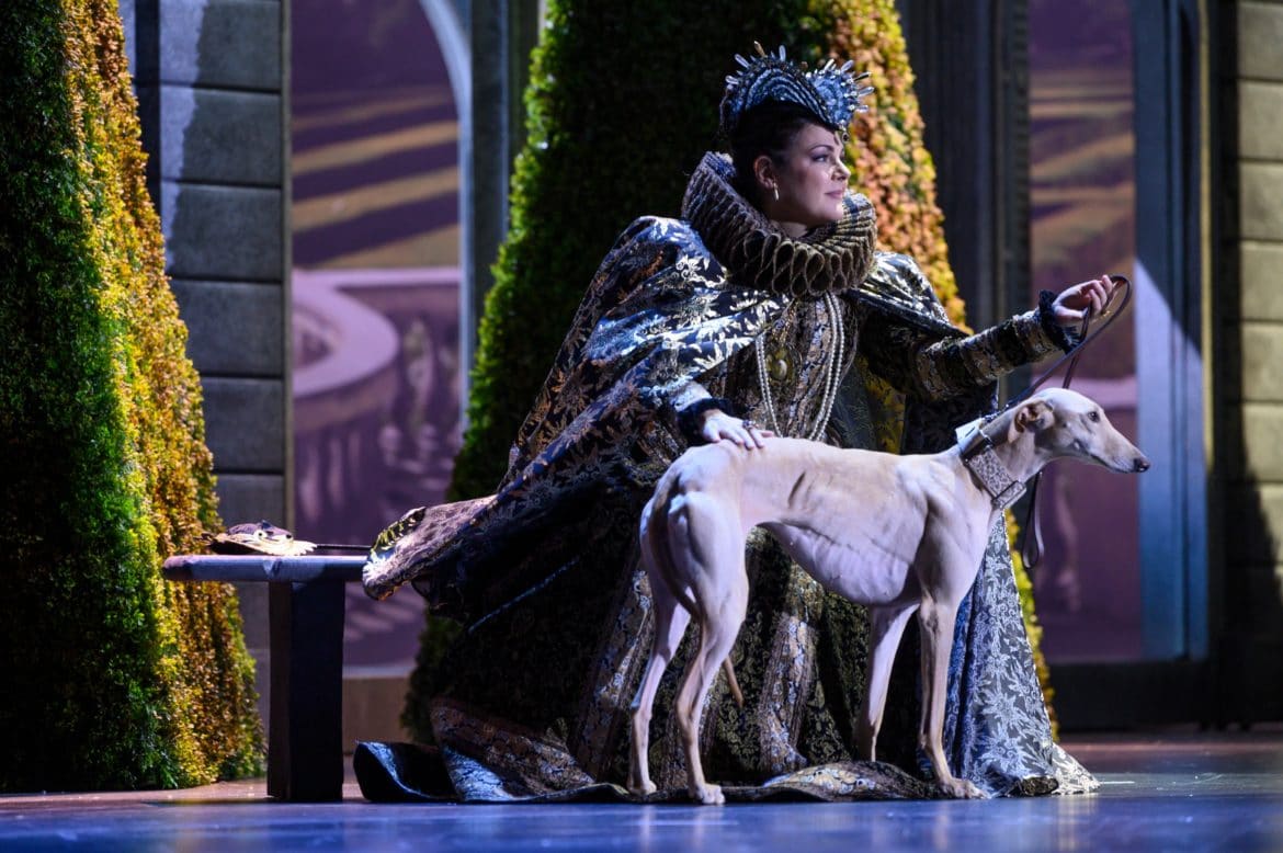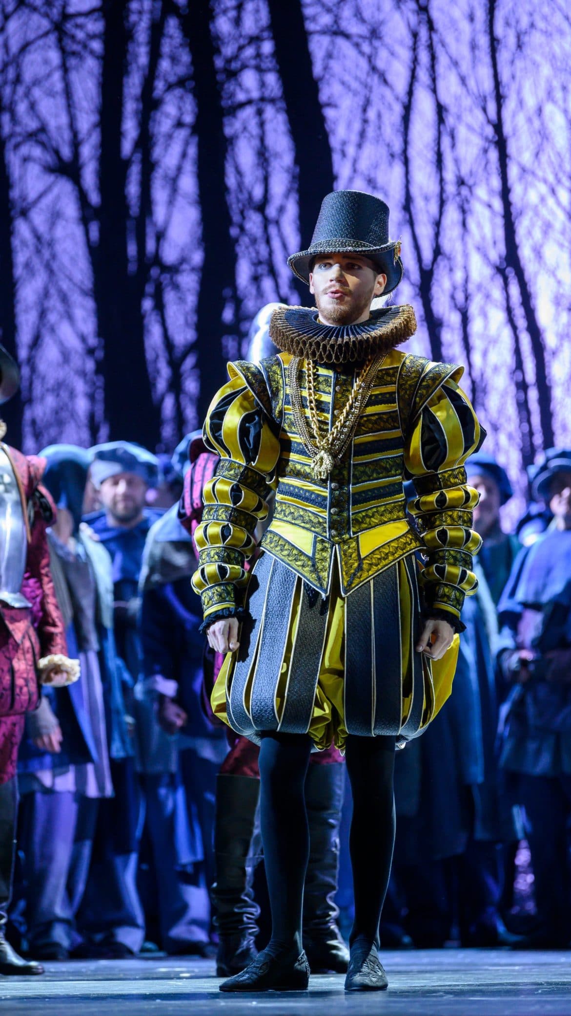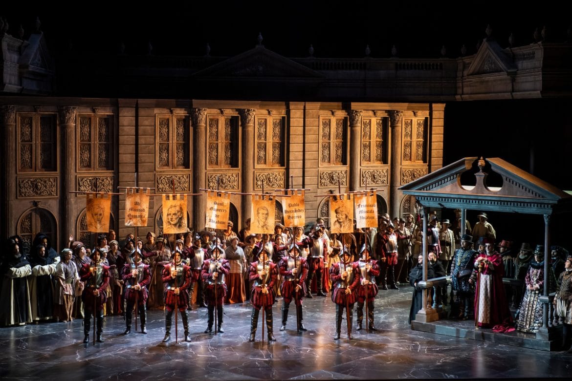 Pourtant muets (heureusement !), Clara, Actimel, Lara et Léonard convainquent pleinement par un jeu de scène très étudié – l’un de ces quatre lévriers semblant s’être particulièrement attaché à la personne Yolanda Auyanet ! Vocalement, les choses sont un peu inégales. Les timbres sombres de Patrick Bolleire et de Roberto Scandiuzzi conviennent bien aux personnages du Moine et de l’Inquisiteur – l’usure des moyens du second ne desservant pas l’incarnation du vieillard presque centenaire. Dans les tout petits rôles de Thibaud, du Comte de Lerme et du Héraut, Caroline de Mahieu et Maxime Melnik créent la surprise par la fraîcheur de leur timbre et la qualité de leur diction. Le second, dont la voix se projette avec assurance et est capable de couronner la scène de la prison d’un aigu glorieux (« Vive le Roi ! »), parvient même à donner corps à un personnage qui n’est le plus souvent qu’un simple figurant.