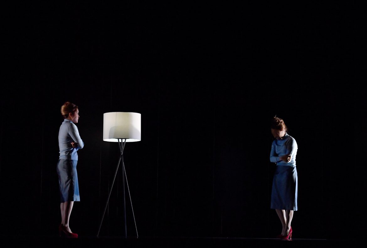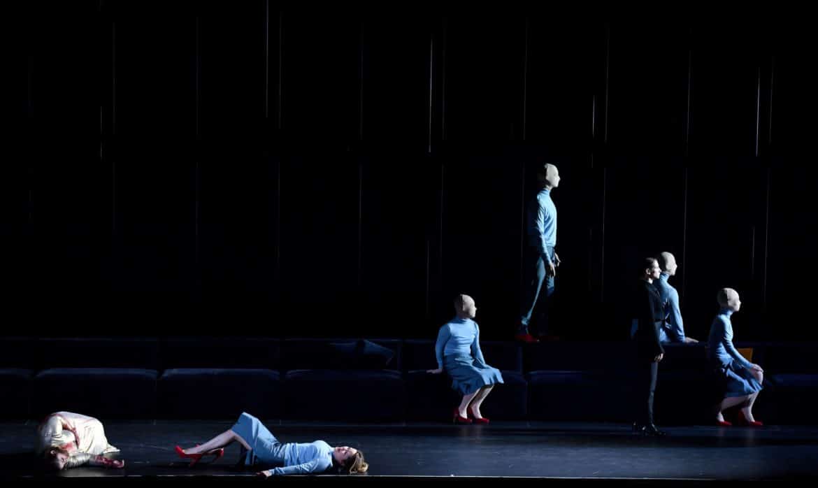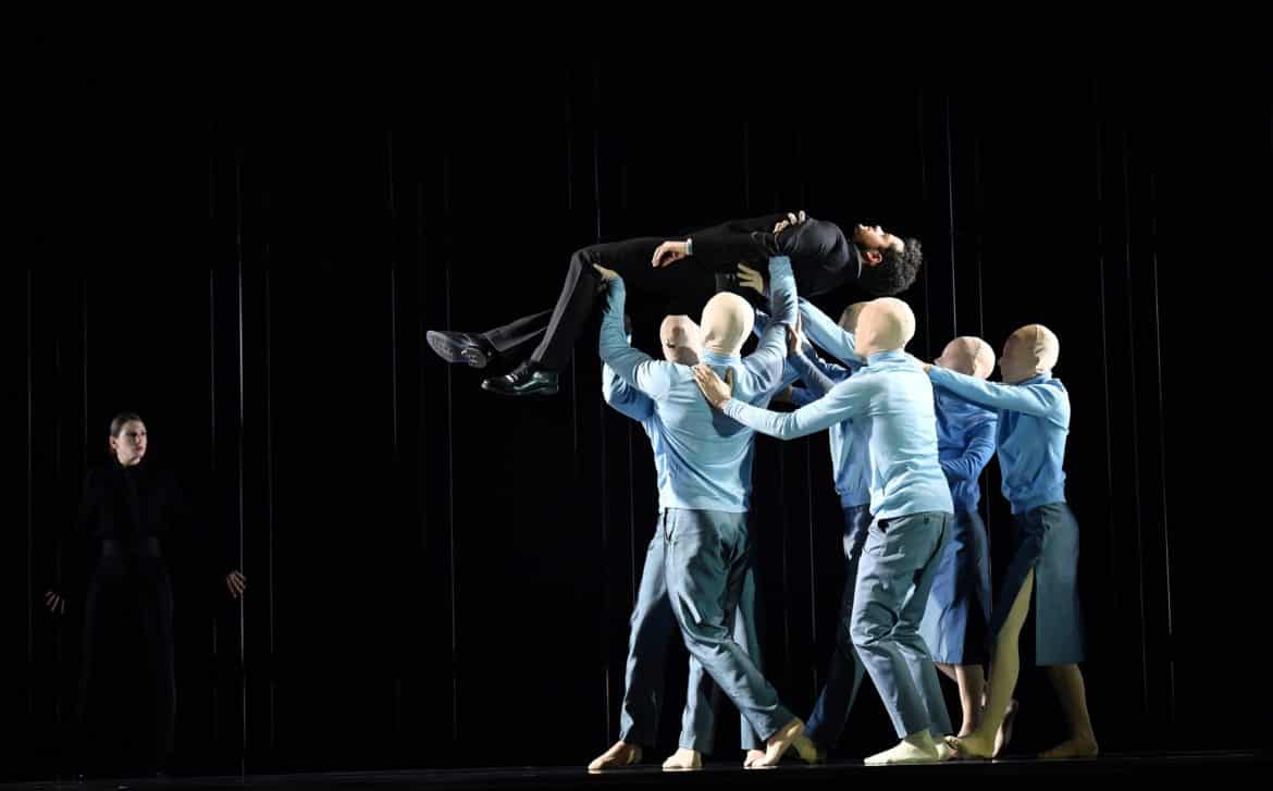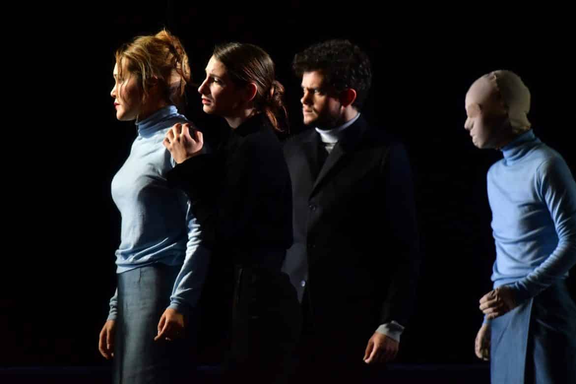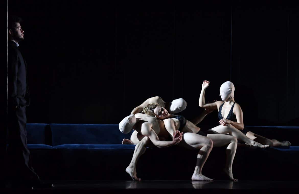 Raconté ainsi, la trame narrative pourrait paraître simpliste. Mais elle est épurée et comme  transfigurée par la mise en images qu’en propose Ted Huffman. Certains tableaux sont d’une poésie saisissante (le ballet symbolisant l’hésitation entre le plaisir et la désillusion ; la scène dans laquelle les personnages du drame, tous figés, regardent côté cour, éclairés par une source lumineuse invisible après que le Temps a demandé à la Beauté de regarder « au-delà du lourd rideau où se situe le futur » ; la disparition poignante, extrêmement lente, du Plaisir pendant le célèbre « Lascia la spina ») ; d’autres éclairent le propos du metteur en scène sans jamais apparaître lourdement didactiques, sans jamais contredire ni même forcer l’œuvre : un tapis roulant ramène constamment les mêmes éléments de décor (essentiellement un immense canapé), suggérant ainsi à la fois l’inéluctable marche du temps et l’absence absolue de progrès, de sens donné à l’existence. Le drame humain et personnel vécu par la protagoniste se double par ailleurs d’une indispensable dimension allégorique, indissociable du genre : la jeune femme est constamment accompagnée de « doubles », masculins ou féminins, dépourvus de visage, projections de sa propre personne à partir desquelles elle questionne et expérimente ce que la vie lui refuse (l’abandon aux plaisirs), tout aussi bien que figures vierges en lesquelles chaque spectateur peut se sentir libre de s’incarner.