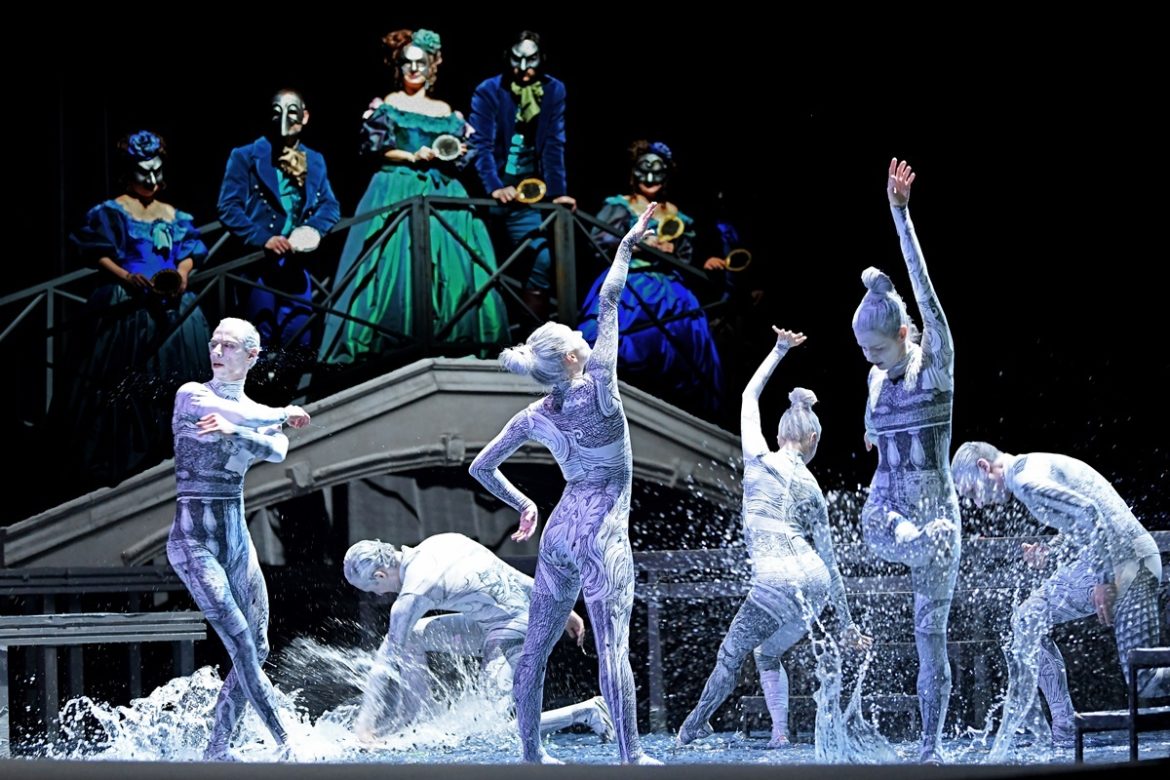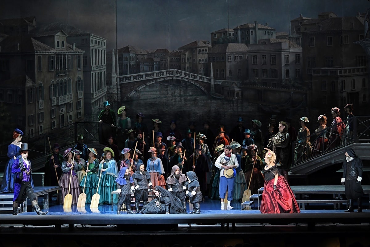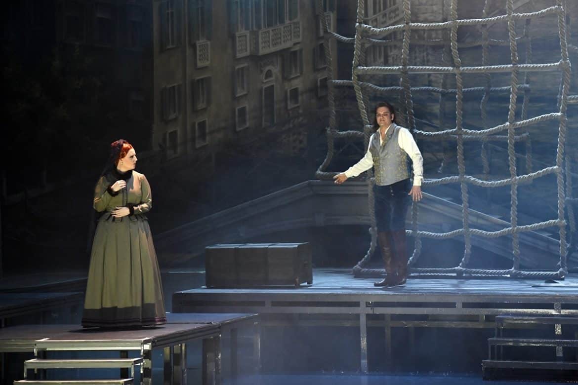 La mise en scène d’András Almási-Tóth fait alterner certains tableaux conventionnels et quelques idées heureuses, notamment au niveau de la scénographie, qui à plusieurs reprises propose un équivalent habile aux « écrans partagés » cinématographiques, la scène étant compartimentée en plusieurs zones permettant de rendre compte simultanément de plusieurs actions ou tableaux concomitants. Nous sommes en revanche moyennement convaincu par la réécriture (féministe ?) du dénouement, qui fait de Gioconda non pas la victime tragique du drame mais la meurtrière de Barnaba – à l’instar de la Carmen florentine de janvier 2018 (dans sa mise en scène de Leo Muscato), laquelle, on s’en souvient, abattait également Don José d’un coup de pistolet…