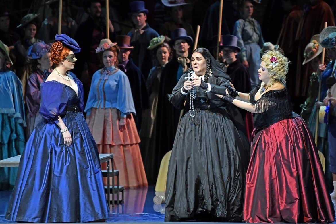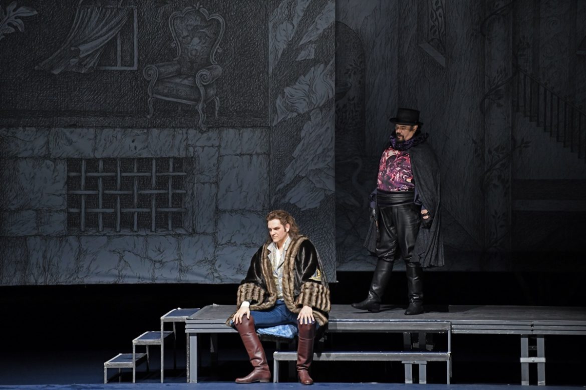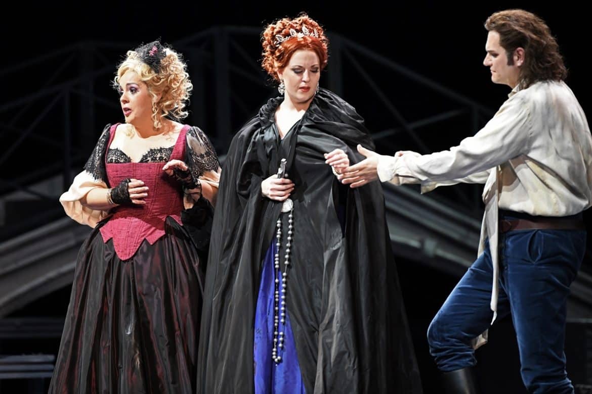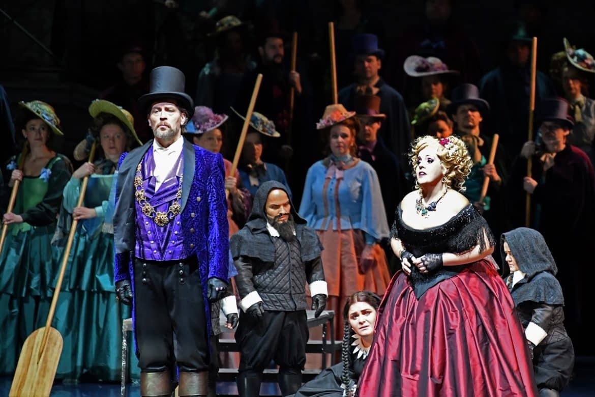 La mise en scène d’András Almási-Tóth fait alterner certains tableaux conventionnels et quelques idées heureuses, notamment au niveau de la scénographie, qui à plusieurs reprises propose un équivalent habile aux « écrans partagés » cinématographiques, la scène étant compartimentée en plusieurs zones permettant de rendre compte simultanément de plusieurs actions ou tableaux concomitants. Nous sommes en revanche moyennement convaincu par la réécriture (féministe ?) du dénouement, qui fait de Gioconda non pas la victime tragique du drame mais la meurtrière de Barnaba – à l’instar de la Carmen florentine de janvier 2018 (dans sa mise en scène de Leo Muscato), laquelle, on s’en souvient, abattait également Don José d’un coup de pistolet…