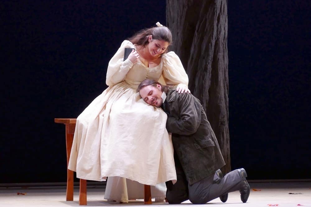 La distribution réunie par l’opéra de Marseille est au diapason d’un spectacle qui se veut modeste dans sa mise en œuvre mais ambitieux dans sa rigueur artistique. Dans les rôles principaux d’Onéguine et de Tatiana, Régis Mengus et Marie-Adeline Henry ont à faire valoir le physique et l’âge de leurs personnages en même temps qu’une jolie musicalité. Repérée à Nancy où José Cura donnait une master class en 2009, Marie-Adeline Henry a mûri son timbre rond de soprano et incarne aujourd’hui une Tatiana proche de l’idéal. Le temps de la représentation, elle réussit à faire évoluer son personnage de la rêverie adolescente au renoncement sacrificiel ; et lorsqu’elle s’abandonne contre l’épaule d’Onéguine pour susurrer « le bonheur est passé si près de nous », la jeune chanteuse rend définitivement crédible ce destin de femme broyé par les affres de la passion inaboutie. La voix elle-même accompagne l’évolution psychologique de Tatiana : claire et juvénile dans l’air de la lettre, elle s’ombre de bronze dans le tableau du bal pétersbourgeois et trouve dans le duo final des accents déchirants.