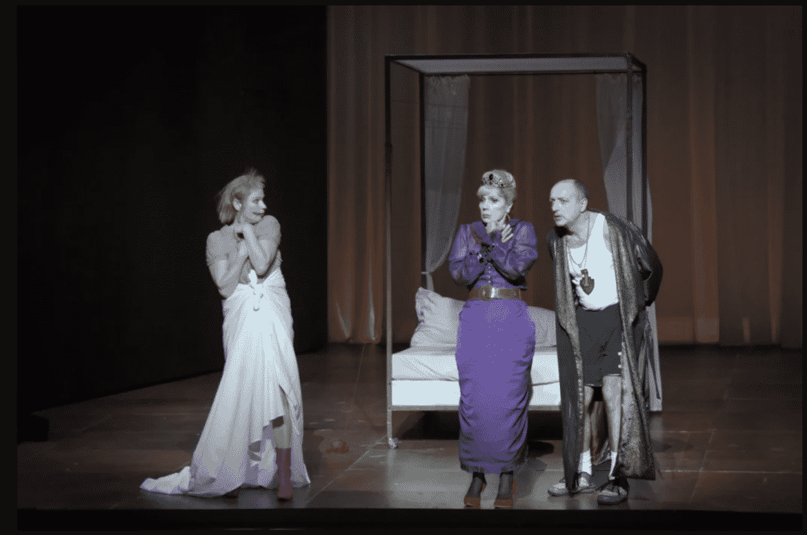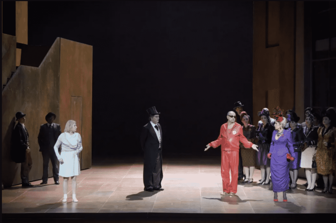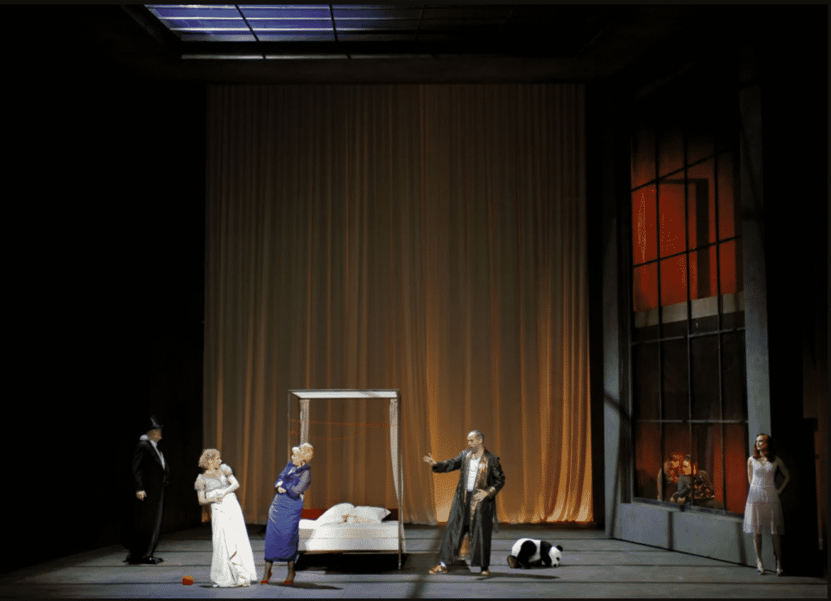 En onze ans, la mise en scène de Luc Bondy n’a rien perdu de sa beauté, de sa lisibilité ni de son efficacité, et la direction d’acteurs, malgré la disparition du metteur en scène il y a maintenant 5 ans, reste extrêmement travaillée, tous les chanteurs se révélant être d’excellents comédiens. Laurent Naouri notamment est parfait en roi vulgaire (vêtu d’un short ou d’un survêtement !), et il parvient parfaitement à traduire vocalement l’autorité mais aussi la cruauté et le cynisme du personnage.  Béatrice Uria-Monzon (malgré une voix qui a de nouveau tendance à bouger un peu et une diction parfois prise en défaut) est irrésistible de drôlerie en reine tantôt coincée, tantôt délurée. On ne reprochera guère à Julien Behr qu’un très léger déficit de puissance par rapport à ses partenaires. À ce détail près, son incarnation du Prince Philippe est pleinement satisfaisante et le chanteur rend aussi bien justice aux quelques épanchements lyriques du personnage qu’à ses accès de brutalité. Impeccable chambellan de Jean Teitgen, voix puissante, timbre de bronze, articulation limpide. Les autres rôles sont tous fort bien tenus, avec une mention spéciale à Guilhem Worms, qui fait ici ses débuts à l’Opéra de Paris, et dont la présence vocale et scénique donne un très beau relief au rôle de l’Innocent ; à Loïc Félix et Christophe Gay (Cyrille et Cyprien pleins d’humour et constamment compréhensibles) ; et à Antoinette Dennefeld, Isabelle très impliquée et dont la voix, bien projetée, retient l’attention.