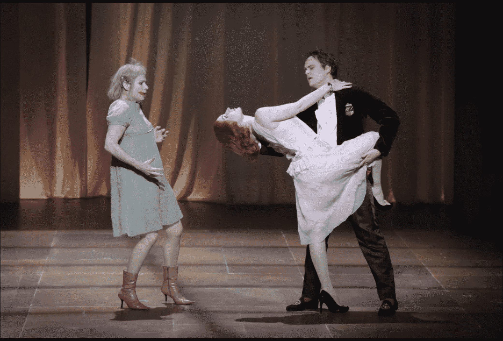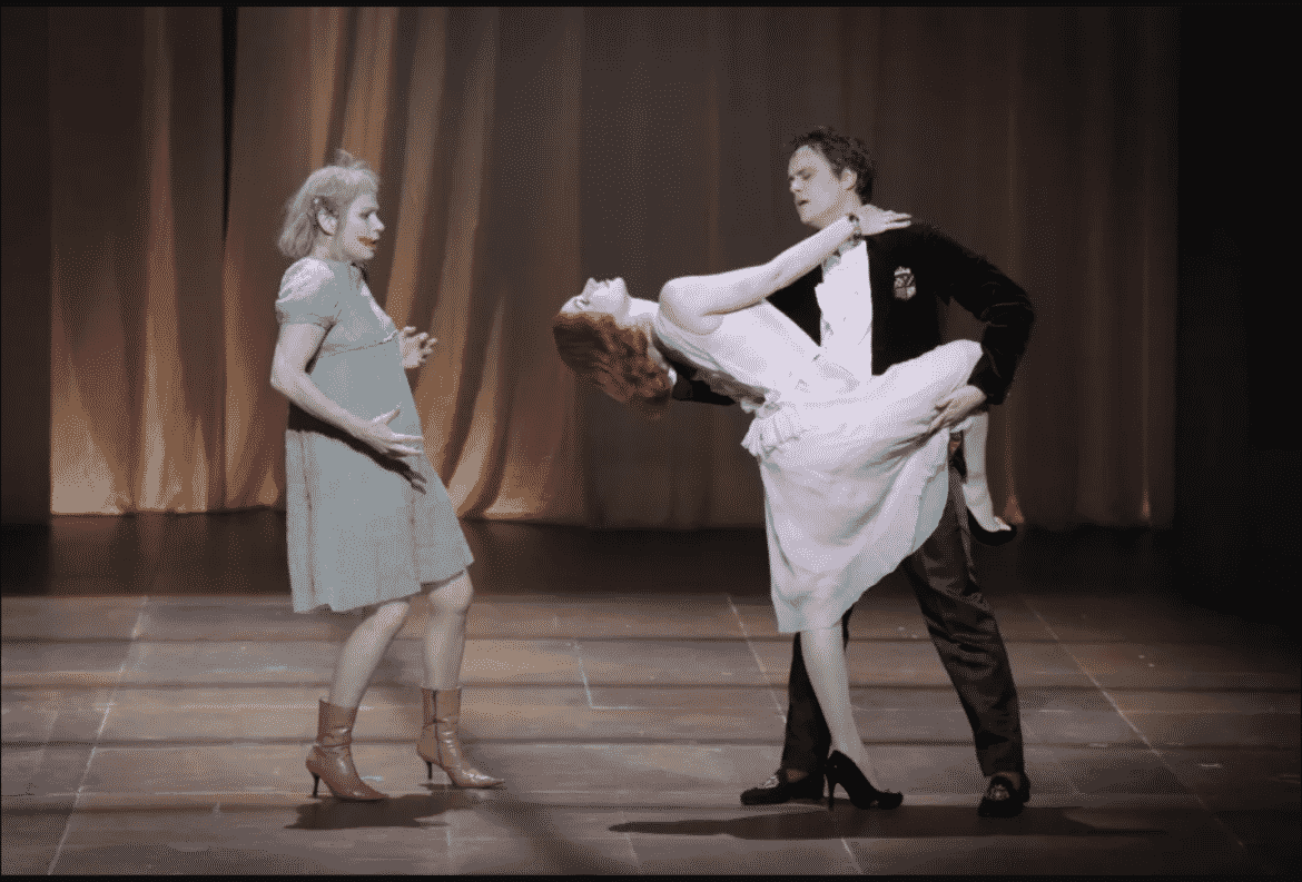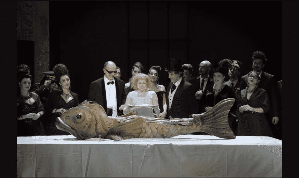 Et quel texte ! Le livret concocté par Luc Bondy et Marie-Louise Bischofberger, d’après la pièce homonyme de Witold Gombrowicz (pour ce qui est déjà sa quatrième adaptation à l’opéra) est un chef-d’œuvre d’humour noir, de cynisme, de cruauté : le sort de la pauvre Yvonne est on ne peut plus tragique : le Prince l’épouse par amusement et/ou par provocation vis-à-vis de la Cour ; Yvonne est rejetée par l’ensemble des courtisans puis par le Prince lui-même (la présence de la jeune femme, curieusement, a mis au jour toutes les pulsions violentes et malsaines renfermées au sein de chacun des personnages), et elle meurt en mangeant un poisson qu’on lui a servi en espérant qu’elle s’étrangle et s’étouffe avec les arêtes – ce qui ne manque pas d’arriver ! Remarquablement interprété par Dörte Lyssewski à l’allure hagarde et dégingandée, rappelant un peu la Yolande Moreau de l’époque des Deschiens, apathique, taciturne, vulgaire, laid, le personnage étonne autant qu’il agace, suscite le rire autant qu’il émeut. Bref, le spectateur s’interroge constamment sur le sens de l’action qu’on lui donne à voir, mais aussi sur la pertinence, le bien-fondé de ses propres réactions : ce n’est pas le moindre mérite du spectacle.