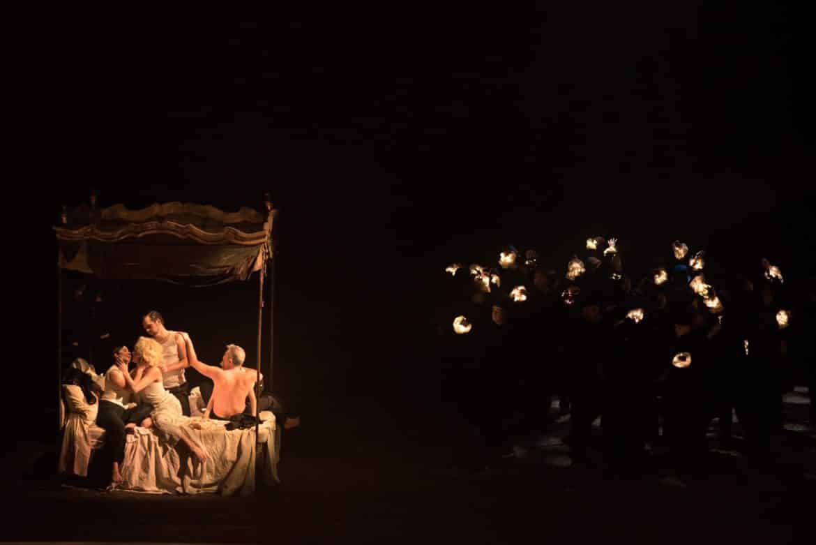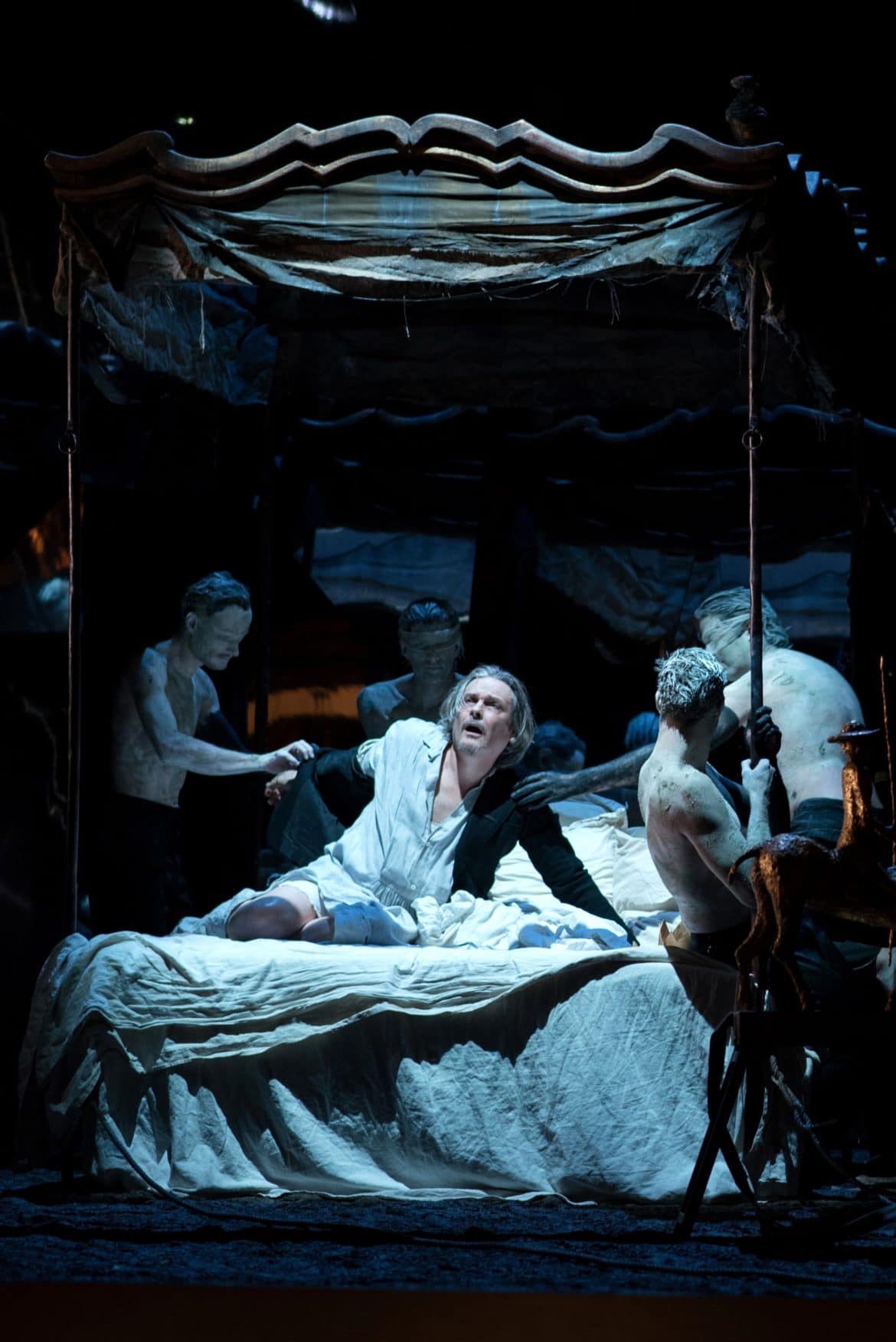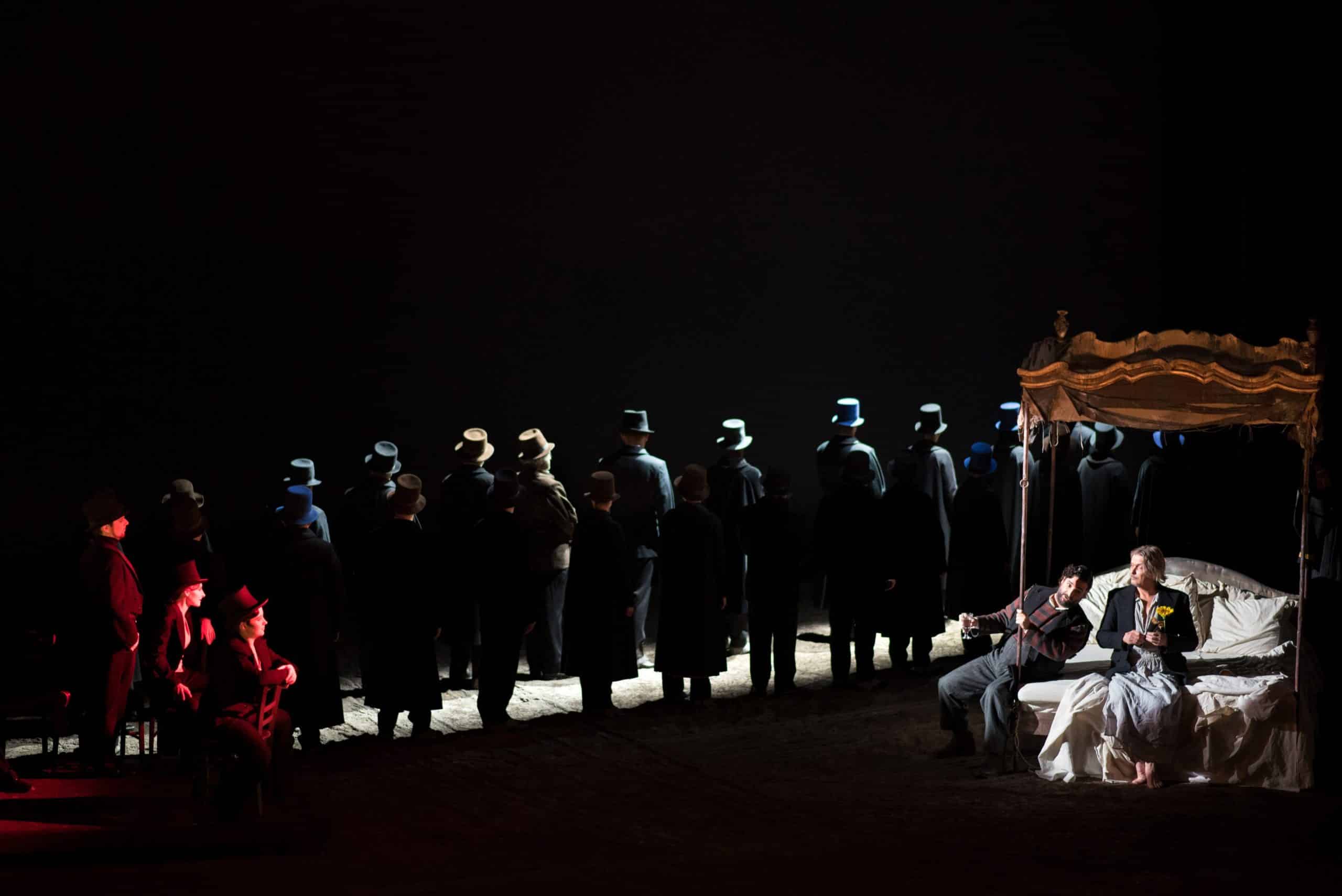 Louis Désiré semble avoir pris appui sur cette phrase par laquelle Sancho ouvre le dernier acte de l’opéra de Massenet pour construire sa mise en scène : Don Quichotte se meurt, et revit sous la forme de scènes rêvées, peut-être fantasmées, les épisodes de sa vie qui l’ont le plus marqué… Le procédé n’est pas nouveau (un certain Visconti ne l’avait-il pas déjà utilisé il y a quelque soixante-dix ans, pour une Traviata entrée dans l’histoire de l’Opéra ?), mais il est poétique et globalement très efficace. Certes, l’effervescence musicale de la première scène ne trouve pas son équivalent scénique dans le décor sobre, presque exclusivement constitué du grand lit dans lequel Don Quichotte agonise. Mais d’autres tableaux s’avèrent extrêmement touchants, tel celui au cours duquel le chevalier à la longue figure, au début du cinquième acte, affaissé sans force sur une chaise, contemple tristement une petite sculpture le représentant au temps de sa gloire au demeurant illusoire, campé sur Rossinante, sa lance à la main…