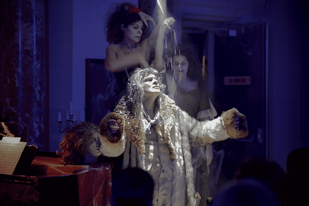 Le spectacle que met en scène Valérie Lesort relève du tour de chant typique de l’esprit du cabaret, où l’on joue aussi la comédie, mais dans lequel on trouve de nombreux clins d’œil qui créent une connivence avec le spectateur. Dès le lever de rideau, nous sommes plongés dans une ambiance angoissante. Quelle est donc cette mélodie qu’égrène la pianiste (Marine Thoreau La Salle) ?… Oui ! Il s’agit du générique de l’Exorciste de William Friedkin et le spectacle s’achèvera sur quelques pas de danse bien chaloupés avec « Thriller » de Michael Jackson, qui, pour l’occasion, est revenu d’entre les morts… La metteuse en scène fait aussi la part belle à la parodie. Ainsi, le début de ce Cabaret Horrifique s’ouvre-t-il également sur une réécriture pour le moins osée : prendre « l’Invitation au voyage » de Duparc en lui accolant les paroles de la « Salsa du démon » ! Il s’agit donc bien, pour Valérie Lesort, de nous convier à un voyage musical comme en témoigne la variété des nombreux extraits musicaux. On saute à la fois les époques et les genres et c’est pour ainsi dire toute la musique qui est représentée : opéra, lieder, chanson, comédie musicale. Les chanteurs Judith Fa et Lionel Peintre, grimés comme dans la famille Adams, nous offrent quelques beaux moments musicaux même si l’on peut trouver parfois des faiblesses vocales : des aigus qui craquent, une intonation qui, quelque fois, fléchit (notamment dans « Erlkönig » de Schubert). On peut néanmoins saluer la performance des deux chanteurs qui trouvent de très beaux accents dans les différents répertoires proposés : beau « Nosferatu » de Marie Paule Belle ou encore un « Grand Lustucru » très lyrique et poétique, chargé d’émotion (interprétés par Judith Fa), ainsi que beaucoup de pathétique dans l’air du Froid du King Arthur de Purcell où Lionel Peintre est éclairé par une lampe-torche tandis que tombent sur lui des flocons de neige. Dans ce spectacle, on ne tire pas sur la pianiste, mais on essaie de s’en débarrasser au moins à trois reprises : on l’étrangle et on l’égorge, on lui casse une bouteille sur la tête ou pire encore, on lui arrache le cœur.