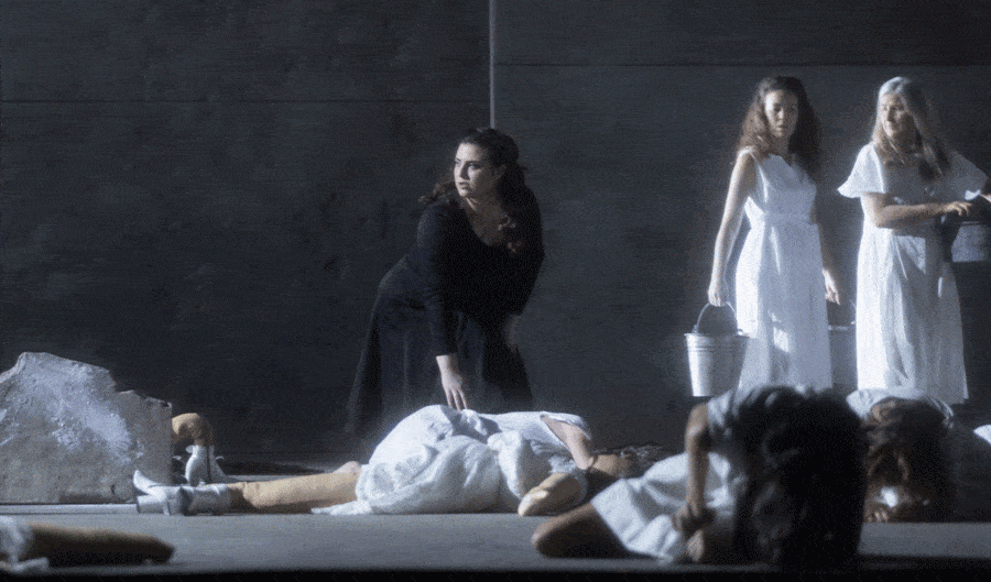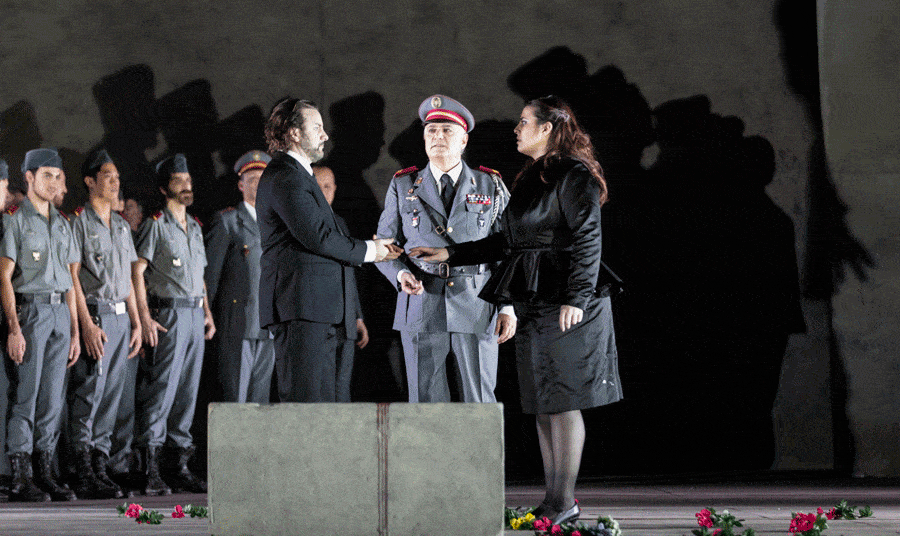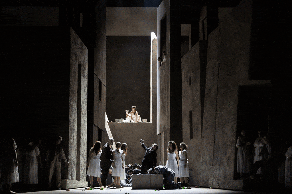 La Sicile, c’est la pierre. Non pas les vieilles pierres des ruines antiques, mais d’abord la pierre comme matériau de construction. Dans cette production des Vêpres siciliennes conçues à l’automne dernier pour l’Opéra de Rome, Valentina Carrasco nous montre les habitants de Palerme comme une foule d’ouvriers du bâtiment, foule d’aujourd’hui à en juger par ses habits – bermudas, jeans, T-shirts… Maculés par la poussière de ces pierres (même la duchesse Hélène en est un peu saupoudrée), ils ont bientôt l’idée de s’en servir contre l’envahisseur alors même qu’un bloc de pierre sert de billot aux exécutions sommaires. Les Français, eux, apparaissent d’abord vêtus d’uniformes d’une autre époque, et on se croirait plutôt dans les années 30 (le chapeau à voilette d’Hélène semble le confirmer), mais très vite ces militaires deviennent ceux que nous montrent les actualités sur les zones de conflit. Et comme le souligne à plusieurs reprises la mise en scène, leur comportement est celui des soudards en tout lieu et en tout temps : ils brutalisent, ils violentent, et leurs victimes sont avant tout, exclusivement même, semble-t-il, les femmes. Valentina Carrasco, également co-signataire de la chorégraphie du spectacle, se montre surtout inspirée dans le traitement des ballets : dans le décor très minéral de Richard Peduzzi, dont les éléments ne cessent d’aller et venir, la représentation ne sort guère d’une certaine convention, sauf quand arrivent ces moments où l’on ne chante plus, et où la metteuse en scène semble libérée de la contrainte du texte. Dès la tarentelle du deuxième acte, les soldats se mettent à lutiner une douzaine de jeunes femmes ; le livret prévoit qu’ils les enlèvent comme les Sabines mais elles finiront couchées à l’avant-scène, ensanglantées et en pleurs. Et lors du long Ballet des Saisons, ici intégralement exécuté, on voit d’abord les militaires danser avec des partenaires qui sont en fait des poupées de chiffon, auxquelles ils réserveront un sort comparable, tandis que les danseuses de chair miment les mauvais traitements en question ; les soldats partis, elles se relèveront, soigneront leurs compagnes inanimées, puis une fois lavées de leur souillure, en sous-vêtements, elles s’enverront des seaux d’eau à la tête dans une atmosphère de joyeuse complicité, digne de certaines publicités pour les serviettes hygiéniques ; on les verra ensuite enceintes, puis jouer avec des enfants, et la mystérieuse épouse de Montfort et mère d’Henri sera elle aussi présente sous les traits d’une figurante aux cheveux blancs. Plus tard, pendant la sicilienne d’Hélène, dont l’allégresse sonne forcément faux dans ce contexte, les danseurs reviennent sous l’aspect de groupes figés reconstituant quelques-unes des plus célèbres scènes de rapt de l’art occidental. Au quatrième acte, les tours imaginées par Peduzzi se transforment en bureaux de l’occupant, où l’on pratique la torture à tous les étages. Et comme prévisible, c’est caillassé que finira l’ennemi haï, lors des fameuses vêpres qui donnent son titre à l’œuvre.