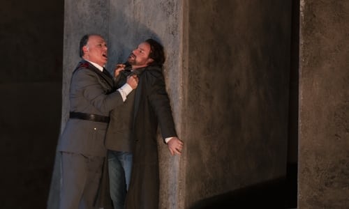 Roberta Mantegna surmonte la plupart des écueils du rôle, ce qu’il faut mettre à son crédit et qui ne surprend pas de la part d’une interprète dont l’agenda est très majoritairement occupé par Verdi, avec d’occasionnelles incursions chez Puccini, ou chez Donizetti. Le timbre est frais, puissance et virtuosité sont au rendez-vous, et l’on ne s’étonnera pas qu’une chanteuse dont la carrière se déroule principalement dans son pays natal et dans le répertoire national paraisse un peu moins à l’aise dans notre langue (les e, é et è, toujours problématiques pour les étrangers, mais aussi les nasales et, plus curieusement, les s ici un peu chuintés). Sur ce plan, John Osborn se montre parfaitement à l’aise, habitué qu’il est de personnages comme Raoul des Huguenots ou Jean du Prophète, ce qui révèle aussi son adéquation stylistique dans le rôle d’Henri, héritier direct des héros conçus par Meyerbeer. Une des raisons pour lesquelles ces Vêpres siciliennes sont si rarement à l’affiche est peut-être que le ténor doit combiner vaillance et aisance dans le suraigu. Très bonne surprise avec le Procida de Michele Pertusi : passé le récitatif d’introduction d’ « Et toi, Palerme », où le vibrato gêne un peu, la basse se montre tout à fait adéquate dans le rôle, alors que son récent Marcel des Huguenots à Genève avait pu susciter quelques inquiétudes quant à son état vocal. Roberto Frontali complète avec bonheur ce quatuor grâce à son expérience de baryton verdien, et dans un français tout à fait respectable.