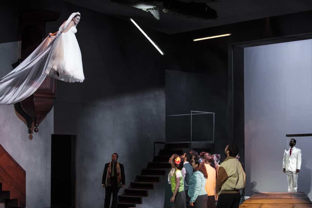 Que Berlioz, si respectueux des auteurs en général et de Shakespeare en particulier, ait à ce point dénaturé Beaucoup de bruit pour rien reste assez mystérieux… De cette comédie où le drame, voire la tragédie affleurent à plus d’une reprise, ne reste qu’une aimable bluette dont les effets comiques tantôt font mouche, tantôt font long feu – ce qui n’ôte rien à la valeur de la musique, particulièrement inspirée notamment pour les rôles féminins. C’est semble-t-il, un avis partagé par Richard Brunel, qui a tenté de réinsuffler à l’œuvre la part de drame dont Berlioz l’a privé, au prix d’arrangements assez nombreux (scènes coupées, dialogues réécrits ou ajoutés, numéros musicaux déplacés) et pour un résultat finalement assez peu convaincant. Au point qu’une question très simple se pose : si l’œuvre ne convient pas au metteur en scène – ce qui peut parfaitement s’entendre –, pourquoi accepter de la monter ? Richard Brunel reprend la péripétie (imaginée par Shakespeare) de la fausse trahison d’Héro et de son mariage avorté avec Claudio. Impossible cependant de garder cet épisode dans son entier (sauf à ajouter de très nombreuses scènes parlées) ; aussi le metteur en scène supprime-t-il la réconciliation finale de Claudio et de sa fiancée. On voit donc, lors du finale, s’opposer deux dénouements : un mariage heureux d’un côté (celui de Béatrice et Bénédict), une séparation irréversible de l’autre, Héro, dans une attitude très me too, refusant de pardonner à Claudio et de l’épouser, ce qui confère au finale une dimension très douce-amère, en contradiction avec la jubilation exprimée par la musique. Ajoutons que le décor assez sinistre (des murs et des plafonds éventrés, tantôt ceux d’une église, tantôt ceux d’un immeuble) ruine l’évocation à la fois poétique, sensuelle et raffinée des douces nuits siciliennes distillée par la musique de Berlioz…