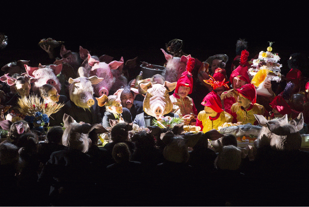 Quant au talentueux Barrie Kosky, est-il parvenu à conférer une colonne vertébrale, une urgence dramatique à cette œuvre lacunaire ? Oui, du moins en partie… L’œuvre étant fortement ancrée dans la culture russe (Moussorgski utilise dans sa partition de très nombreux thèmes issus de chansons ukrainiennes), le metteur en scène a eu le bon goût de ne pas céder à la tentation d’une transposition de l’intrigue dans le monde des finances, une classe d’école primaire ou une banlieue défavorisée. Les personnages portent des costumes typiquement slaves, ce qui n’engendre pas pour autant une vision folklorique désuète et plus ou moins ridicule, ni n’exclut un travail sur le jeu d’acteurs comme toujours remarquable avec ce metteur en scène. La nudité recherchée du plateau permet de beaux contrastes avec l’effervescence des scènes chorales, et notamment avec le banquet de La nuit du mont Chauve, envahi de porcs qui sont autant d’incarnations du démon. L’utilisation du rideau de scène n’est ni un tic, ni une facilité à laquelle on recourt pour changer le décor : elle permet de distinguer habilement les scènes oniriques du monde réel, ou encore d’opposer le monde de l’introspection de la sphère publique.