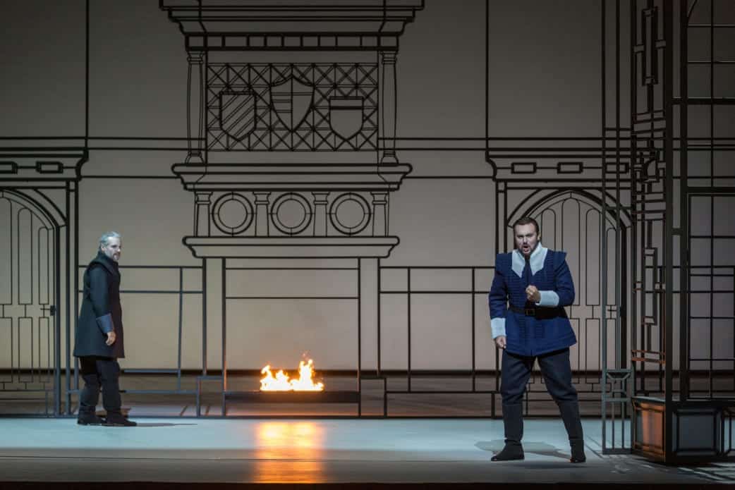 Est-ce grâce à l’excellence de l’exécution musicale ? Ou bien la direction d’acteurs, très précise et visiblement très travaillée a-t-elle été approfondie depuis la première série de représentations ? Toujours est-il que le spectacle nous a paru moins triste et plus intéressant qu’en 2013. Certes, le recours au plateau tournant vire au système et les couinements qu’il occasionne, surtout dans les moments de recueillement (l’introduction de la folie d’Elvire !) agacent un peu ; la façon de traiter les déplacements et la gestuelle du chœur (avec sautillements en cadence et brandissement mécanique des hallebardes) reste peu compréhensible et suscite toujours (malencontreusement) l’amusement du public ; les quelques projections (le visage d’Elvira, un ciel orageux au dernier acte) et les subtils éclairages de Joël Adam ne parviennent pas vraiment à atténuer l’impression de monotonie qui se dégage du spectacle, qui se déroule presque exclusivement dans des tons gris/gris-bleu. Mais enfin, encore une fois, le jeu des acteurs, précis et dense, convainc, et la lecture de l’œuvre, qui fait d’Elvira une femme d’emblée broyée par des événements politiques entrant en pleine contradiction avec l’aventure amoureuse qu’elle essaie de construire (elle n’y survivra pas, terrassée par l’émotion lors du chœur de réjouissances qui clôt l’œuvre) est plausible et cohérente.