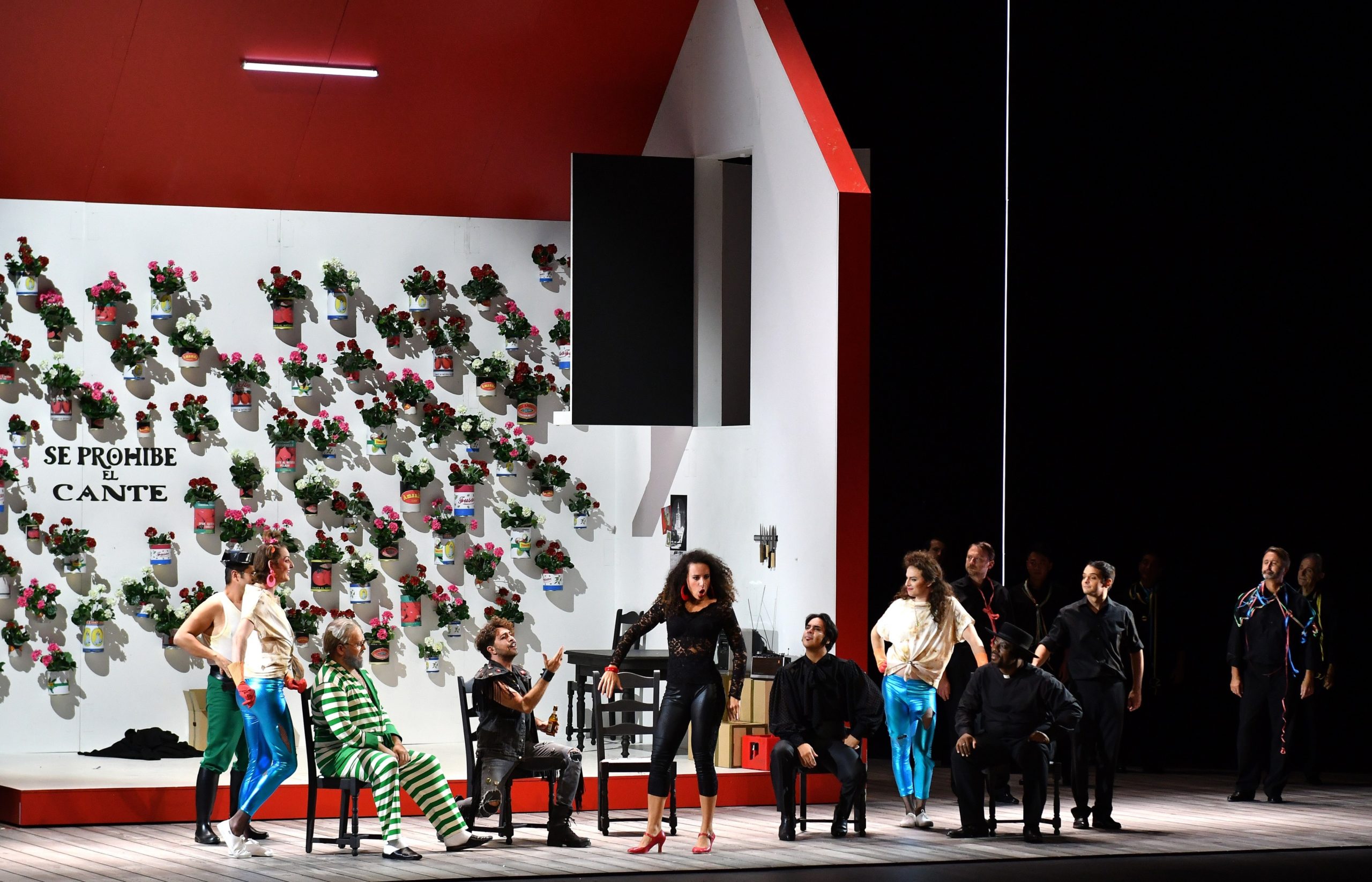 Parmi les archétypes ibériques, le référent corrida devient un marqueur comique de la mise en scène pour mieux figurer les jeux de cette comédie d’intrigue : appâter, berner, combattre, enlever, etc. Ainsi, les passes de muleta du comte Almaviva face à son adversaire (Bartolo / taureau) amusent le public. En sus, la culture flamenca vient hispaniser les scènes collectives : frapper dans les mains, virevolter ou frapper le sol des pieds, rassembler les protagonistes frontalement sur des chaises alignées (final du 2e acte). Ce réalisme, parfois mâtiné de trivialité (uriner dans la bouteille de bière, se tordre de coliques), ne vient-il pas alors gâcher le comique de la réactualisation ? Enfin, lorsque Figaro, ordonnateur des intrigues dans l’opéra, ici star de musiques actuelles, emballe le public, le metteur en scène ne s’arrête pas là. Il réalise également un focus sur Berta, vieille servante de second plan dans le livret. Le pari de lui octroyer le rôle de « maîtresse des cérémonies, archétype du serviteur pauvre, marginal, mais au charisme de star (programme de salle) » semble un peu « perché » lorsque les citations des Bonnes de Jean Genet s’affichent  sur le plateau …  En contournant les représentations genrées, c’est au contre-ténor Ray Chavez que revient ce rôle de Berta (d’ordinaire distribué à une contralto), que la production dote de deux prestations supplémentaires. La première est un tour de chant au lever de rideau du 2e acte, faisant appel à une bande son. L’adjonction d’un tango chanté de zarzuela est le second supplément, intégré après l’authentique récitatif que Rossini consacre à Berta (2e acte). Ce tango propulse le spectateur vers La Gran via de F. Chueca et Valverde, fameuse zarzuela madrilène, relancée dans les années 80 par la grande mezzo espagnole Teresa Berganza.