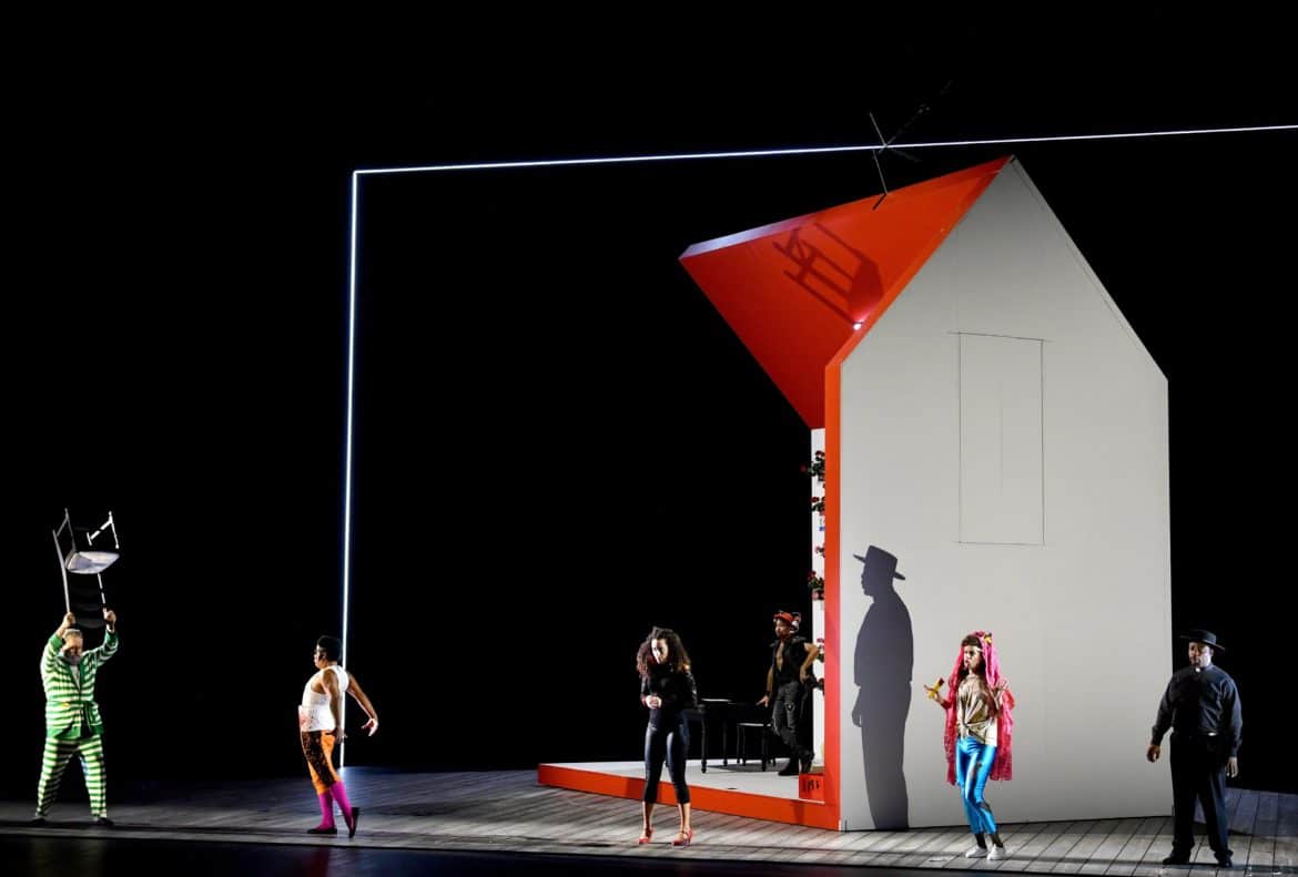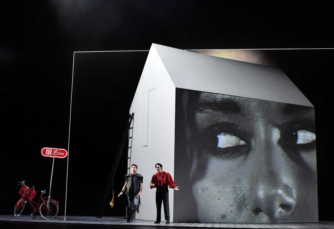 Pour relocaliser avec humour le milieu sévillan de l’opera buffa, l’univers imaginé par Rafael Villalobos plonge dans les révolutions politiques et culturelles de l’Espagne des XXe et XXIe siècles. Le jeune metteur en scène sévillan, déjà primé aux Opera  Awards de Londres, mêle d’une part les archétypes du fascisme franquiste, d’autre part ceux de la Movida qui a libéré les mœurs dès la période de transition démocratique. Pour l’un, le chœur exclusivement masculin est représenté aux bottes du pouvoir politique et du patriarcal, ce chœur qui figure soit les musiciens du Comte, ici transformés en aficionados, soit la garde (gardia civil) qui libère complaisamment le noble sur son seul titre. Pour l’autre (la Movida), l’univers visuel du spectacle y souscrit pleinement. L’influence des médias du cinéma et  de la BD underground (enseignes lumineuses) inspire les décors signés d’Emanuele Sinisi. Sur le vaste plateau de l’Opéra Berlioz, l’unique dispositif scénique d’un cube blanc en 3d, posé au centre du plateau, est ingénieux. En effet, sa rotation (rapide) permet de camper le recto blanc  – l’extérieur urbain de Séville, les ombres –  et son verso – l’intérieur de la maison de Bartolo, figé entre pots fleuris et petit autel dédié à la Vierge. Ce cube blanc devient écran géant de cinéma lorsque des projections s’affichent  sur ses différentes parois (vidéos de La Maleta films). Au fil de l’intrigue surgit le visage pulpeux de Rosine (1er acte), ou bien les nuages et éclairs de l’orage (2e acte), sans oublier l’emblématique tour de la Giralda suivie de portraits populaires  pendant l’ouverture symphonique.