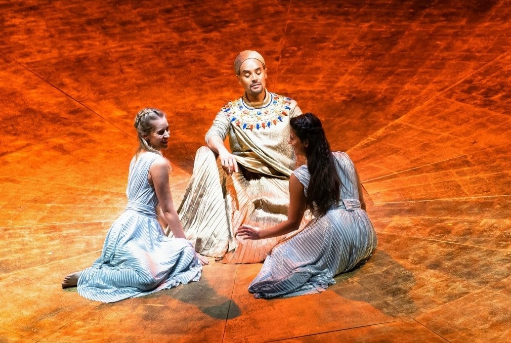 À Nice, le spectacle fut réglé par Lucinda Childs, secondée par Étienne Guiol et Bruno de Lavenère. La metteuse en scène et chorégraphe, aujourd’hui âgée de 80 ans, a réussi le tour de force de diriger les répétitions depuis New York via internet – en pleine nuit pour elle, en raison du décalage horaire ! Elle assure également le rôle du narrateur, habituellement dévolu à un homme. La scénographie de Bruno de Lavenère (qui signe les décors et les costumes du spectacle) impressionne : les personnages évoluent sur un grand disque couleur de feu, et un oculus surplombe la scène, permettant la rétroprojection de vidéos comportant quelques hiéroglyphes, seuls signes directement empruntés à l’Égypte ancienne. Étienne Guiol, responsable des vidéos, a quant à lui filmé le ballet en amont du spectacle, en variant les plans et les points de vue. La projection de ce ballet offre ainsi à l’œil une beauté kaléidoscopique, en écho, voire en symbiose avec les impressions suscitées par la musique.