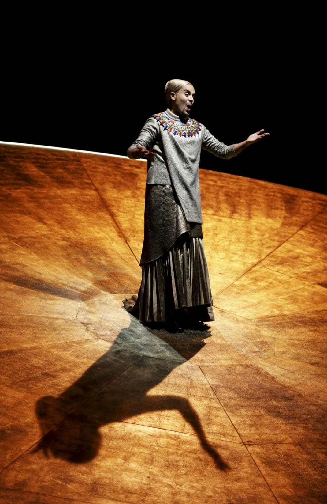 Pour preuve de l’importance de l’introspection que permet l’intelligence des choix de matériaux et Philip Glass, je voudrais me pencher sur les différences notables entre les interprètes qui ont tenu le rôle-titre dans le clou de l’œuvre : l’Hymne au Soleil, dont la ligne mélodique épurée permet l’expression directe de l’âme et du vécu. Je précise qu’il est très dommage, dans notre culture de l’écrit et de la praticité, que l’on ne respecte pas la volonté de Philip Glass qui est que cet hymne devait être chanté dans la langue de l’auditoire, philosophiquement centre et essence même de l’opéra. Chanter cet Hymne en français à Nice aurait été fondamental, on espère que cela sera le cas pour la reprise en 2021, d’ores et déjà annoncée pour pallier l’annulation des représentations publiques suite à la crise sanitaire. Le choix par Philip Glass du timbre de contre-ténor pour Akhnaten est évidemment une référence à l’âge baroque où les voix de castrats symbolisent la divinité, tout comme le cartouche des noms des Pharaons la signalait également. Aussi pour les producteurs, les voix sont toutes choisies amples et lyriques afin de rivaliser avec l’orchestre.