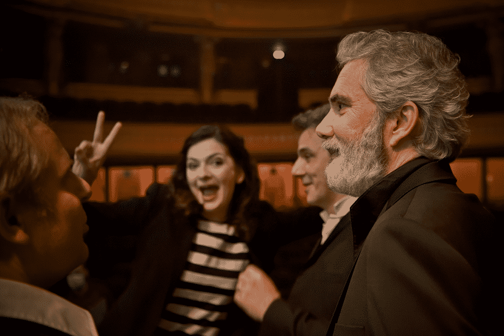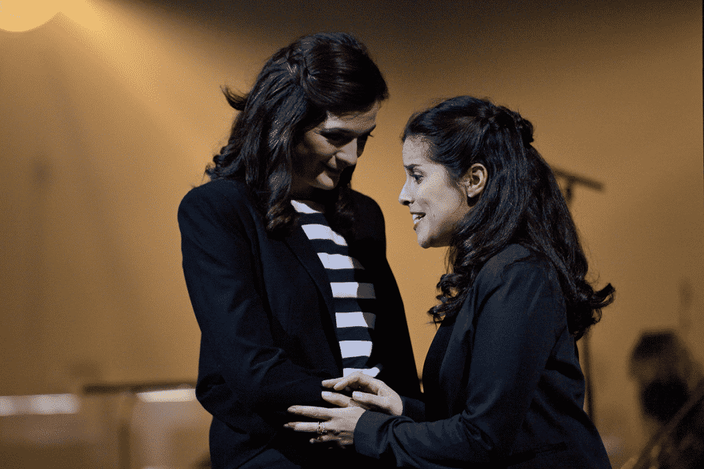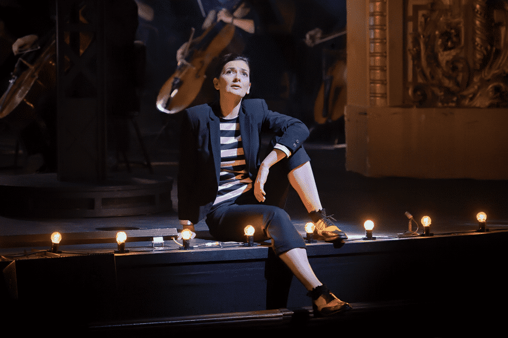 En effet, la construction de l’univers visuel autour de la sélection de 12 œuvres semble « cousu-main » par les deux concepteurs complices. Pour le premier univers, la quasi absence de décor, autre que le plateau et les loges d’avant-scène, nous place au cœur de l’écrin de la salle Favart. Dans cet espace intime, la mise en espace est simple et naturelle. Le rebord de scène devient une assise pour les protagonistes, la loge surplombant le plateau abrite les amours de Juliette et  de Roméo, ou bien se transforme en sortie lestement enjambée …  Seul un pylône d’acier, en premier plan de scène, permet à Fantasio de décrocher la lune dans sa ballade, ou encore à Lakmé et sa suivante Malika de s’abriter fraternellement. Ni paillettes ni strass, ni démonstration extravertie de jeux scéniques ne viennent  rompre la douce tonalité tour à tour élégiaque, tendre, piquante. En effet, quelques extraits franchement comiques ou spirituels sont distillés durant la soirée. Issus de La Vie parisienne et de La Belle Hélène, ils s’avèrent propices à alléger l’ambiance et, si possible, à tourner en dérision notre  propre actualité sociale. De rares costumes (issus de productions antérieures) silhouettent quelques artistes lyriques, qui l’étudiant Sparck (Fantasio), qui le valet Frantz des Contes d’Hoffmann, qui la juvénile Juliette Capulet en blanc vaporeux, sans oublier le chapeau à trois pointes de l’impertinent Fantasio. Toutefois, hormis l’indémodable marinière, la tenue noire est homogène : elle ravale au même rang de troupe les solistes, choristes et musiciens d’orchestre dans des lumières tamisées, parfois étoilées. Le rougeoiement étant réservé à l’emblématique Carmen !