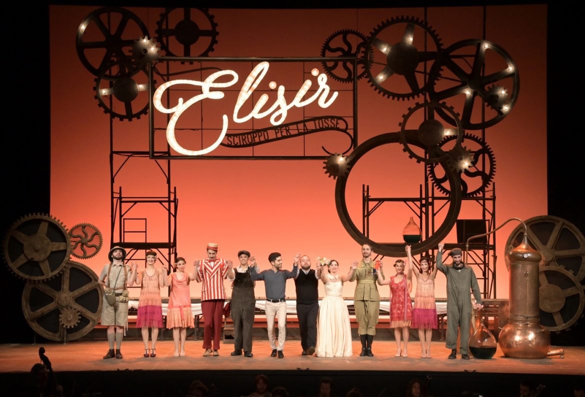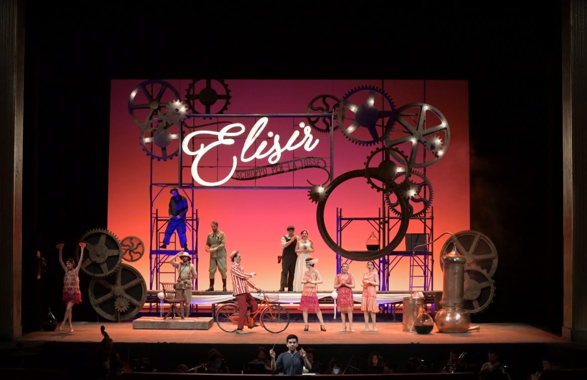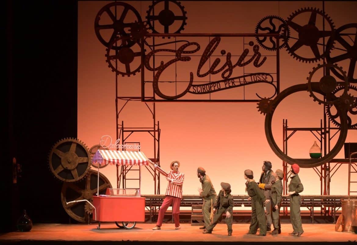 Dirigé par Marc Leroy-Calatayud, l’Elixir d’Amour de Donizetti est donné dans une version française d’Henri Tresbel à destination du jeune public au Théâtre des Champs-Elysées. Il sera diffusé sur la plateforme éducative de France Télévision « Lumni » à partir du début du mois de mars, si ce n’est un peu avant. Grâce au travail d’artiste du metteur en scène Manuel Renga et du scénographe Aurelio Colombo, chaque scène est à la fois un divertissement et un tableau. Les spectateurs sont plongés dans un univers doux et sucré qui n’est pas sans rappeler celui de Charlie et la chocolaterie de Roald Dahl. Le spectacle fera l’objet d’un DVD qui sera commercialisé dans le cours de l’année.