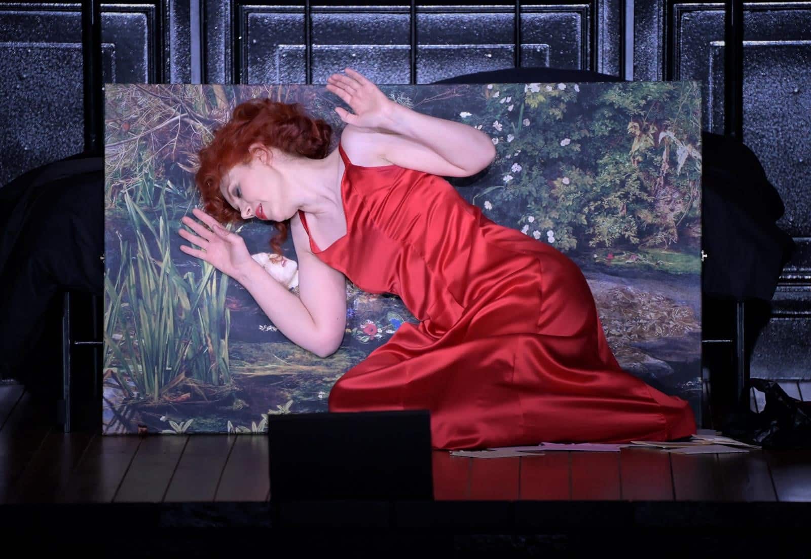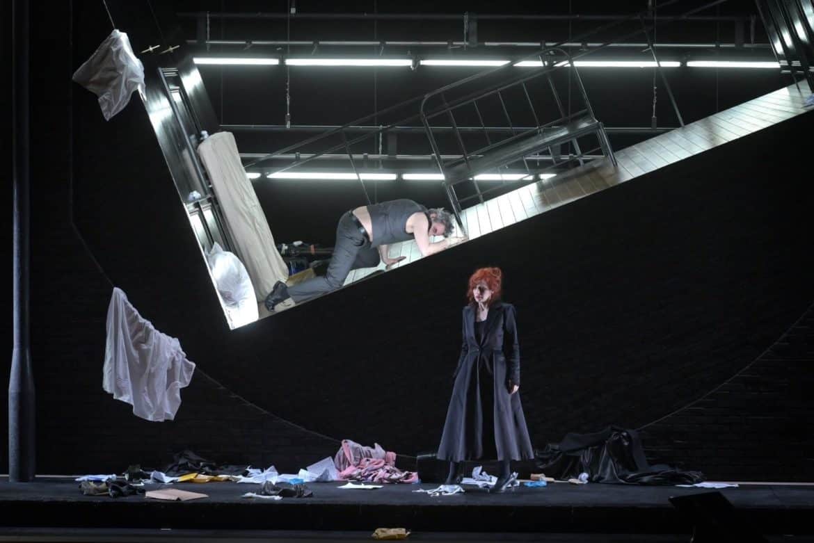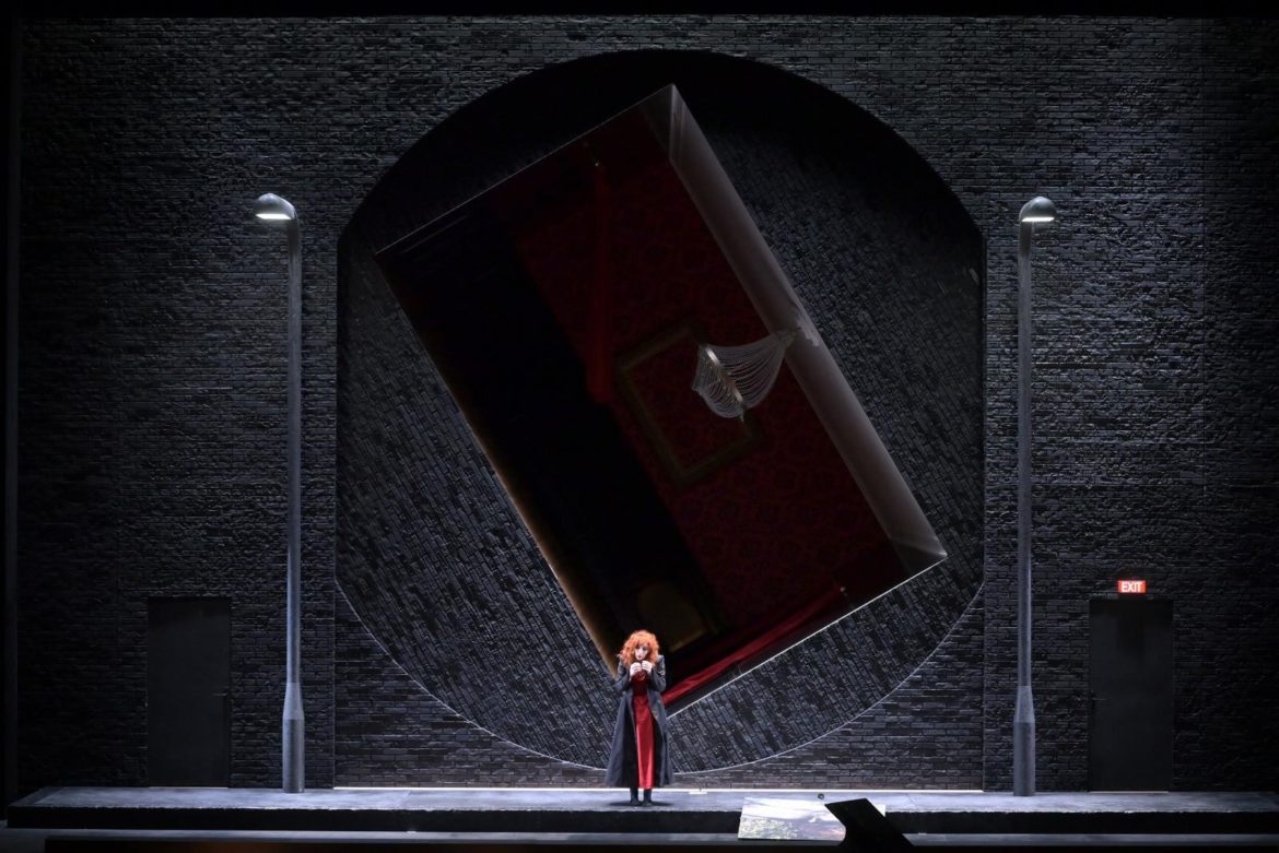 Si, dans une configuration qui lui donne une place plus ample pour des raisons essentiellement sanitaires, en sacrifiant une partie du parterre, l’Orchestre national Bordeaux Aquitaine, sous la baguette attentive de Jérémie Rhorer, ponctue la palpitation dramatique sans se laisser trop griser par des effluves de couleurs et de textures qui puisent dans la grammaire expressive fondamentale de Poulenc – on reconnaîtra des phrasés du Dialogue des carmélites : les deux œuvres affirment en fin de compte une parenté dans la tension entre grâce et fatum. La scénographie de Pierre-André Weitz, animée par Olivier Py, tend vers une sorte d’exhaustivité littérale des détails et anecdotes du texte, à l’exemple de l’intervention du chien. Le dispositif n’en reste pas moins habile, avec sa chambre mobile greffée sur un cadran évoquant les rondes encoches numériques des téléphones antiques. Les éclairages parfois psychédéliques de Bertrand Killy accompagnent les sinuosités du délire au gré des rotations de l’espace intime ballottant la décoration intime en même temps que l’héroïne. Encadré de deux turgescences en forme de lampadaire, l’écrin anthracite prend également l’allure d’une façade d’immeuble, devant lequel se tient occasionnellement la femme abandonnée, partie avec pour tout viatique un tableau au dessin rappelant Ophelia de Millais, soulignant ainsi une dialectique entre l’intérieur et l’extérieur, autant réaliste que symbolique, dans un évident souci de n’oublier aucune des faces de cette Voix humaine.