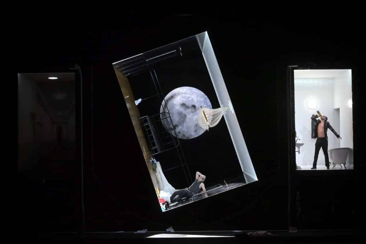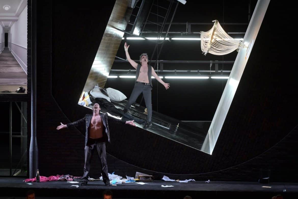 Au bourgeois ordonnancement de la chambre de la première partie succède le désordre sale d’un triptyque domestique, allant de l’antichambre en perspective à l’intimité crue de la salle de bains, habillé de paillettes souillées et d’âpres néons. On retrouve l’attention au verbe de Patricia Petibon dans les répliques de Elle. Jean-Sébastien Bou, qui avait tenu le rôle-titre dans le premier opéra de Thierry Escaich, Claude, détaille avec un engagement indéniable les turpitudes du héros, tant dans une déclamation robuste et précise, que dans la carrure d’un chant timbré. Quant au méphistophélique Autre de Cyrille Dubois, il dégage une vénéneuse perversité, parfois aux confins de la tessiture dans un rôle pas moins écrasant que celui de sa victime, Lui. À défaut de compter avec certitude Point d’orgue parmi les créations majeures de l’opéra contemporain, l’exercice de style permet au moins de saluer le remarquable travail des interprètes musicaux.