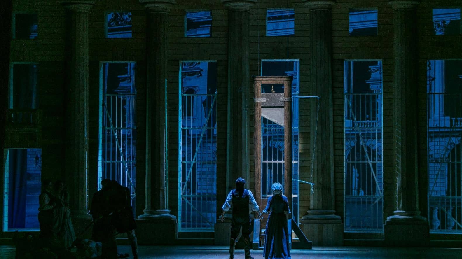 Est-ce parce que l’arrière-plan historique de l’œuvre, avec l’évocation des Merveilleuses, des Girondins, de Robespierre, Marat, Fouquier-Tinville, les échos musicaux de la Carmagnole, du Ça ira ou de la Marseillaise, est trop prégnant ? Les mises en scène, aujourd’hui pourtant si friandes des transpositions les plus inattendues, restent en tout cas toujours sagement ancrées dans le contexte de la Révolution française tel que décrit par le livret (été 1789 pour le premier acte, 1794 pour les trois autres). Celle proposée par Nikos Petropoulos pour l’Opéra national de Grèce ne déroge pas à la règle : tout y est, des bonnets phrygiens aux extravagants chapeaux des Merveilleuses, des piques sur lesquelles sont plantées les têtes des guillotinés aux pantalons à rayures portés par les « sans-culottes ». Le spectacle se déroule sans faute de goût mais sans grande imagination non plus, se contentant d’une sage mise en images du livret. Voilà en tout cas qui satisfera pleinement les partisans de la tradition.