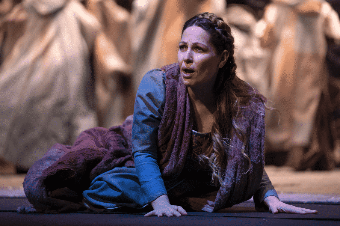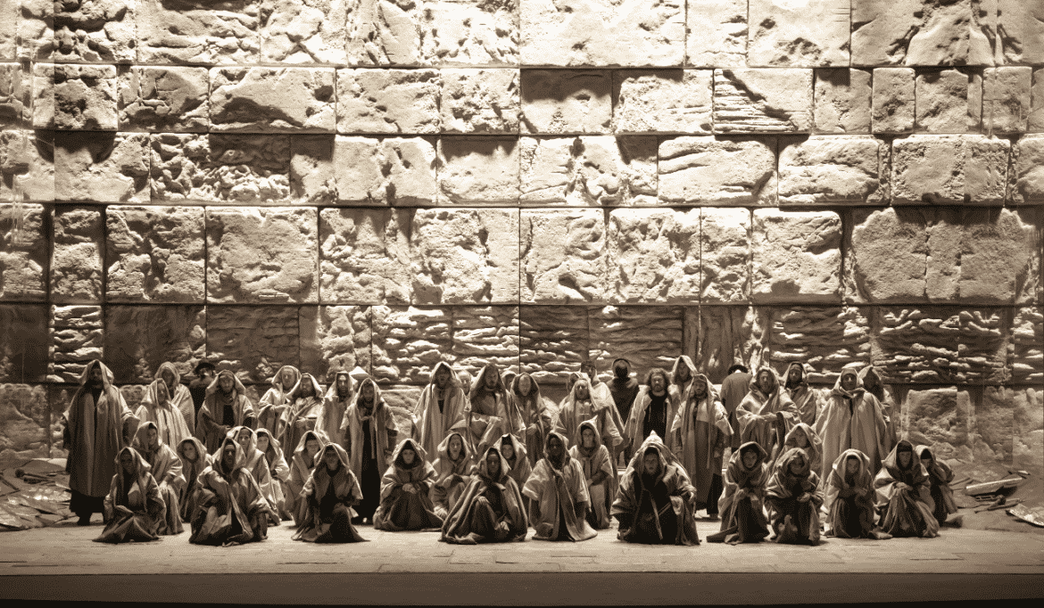 Crée au Teatro Regio de Parme en 2003, la mise en scène originale de Lamberto Puggelli, réalisée ici par Grazia Pulvirenti, essaie de garder pour ligne de crête le caractère intemporel des malheurs de la guerre, souvent créés par l’intolérance religieuse. Intelligemment illustrée par des projections pouvant, dans une même scène, faire apparaître l’intérieur majestueux d’une cathédrale et des détails de Guernica puis, ailleurs, le pont d’un navire surpeuplé de réfugiés, la mise en scène ne tire cependant pas suffisamment profit de ces projections, limitant le plus souvent le jeu des acteurs à quelques attitudes trop standardisées. Le dernier acte, situé dans le désert près de Jérusalem, est selon nous le plus réussi avec sa belle projection du mur des lamentations, nimbé d’une superbe lumière, qui, hier comme aujourd’hui, continue d’être un point névralgique de la géopolitique dans cette région. Du coup, les combats médiévaux auxquels se livre une équipe importante de figurants donnent soudain à la scène et à la musique de bataille toute son ampleur intemporelle.