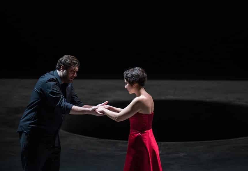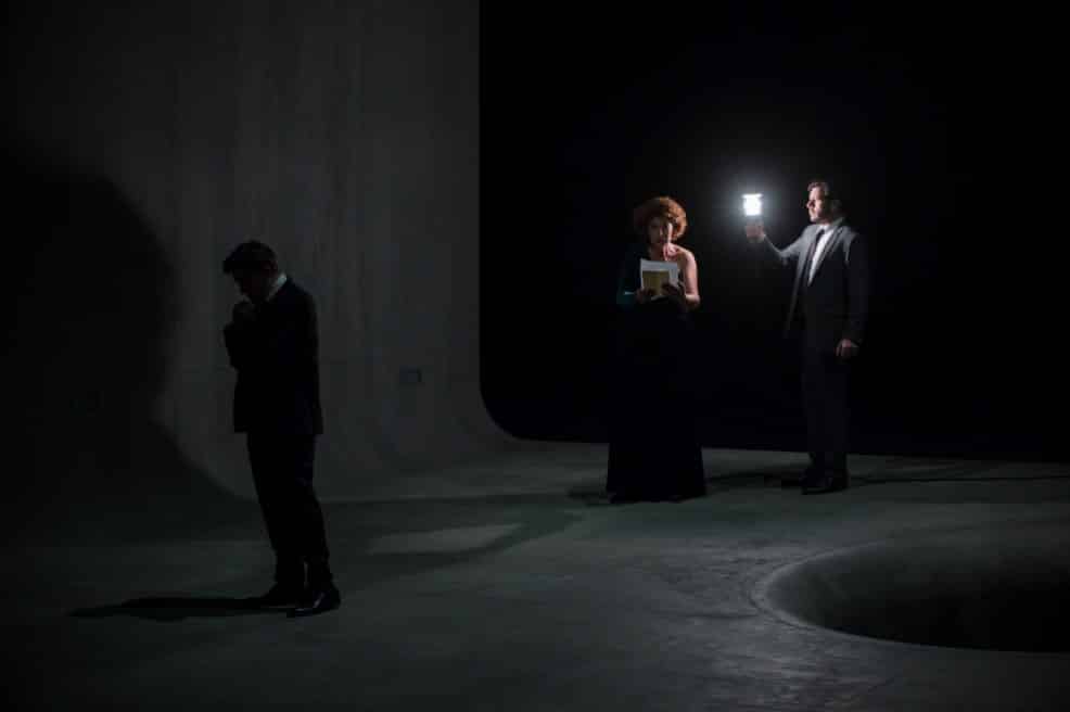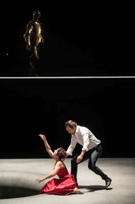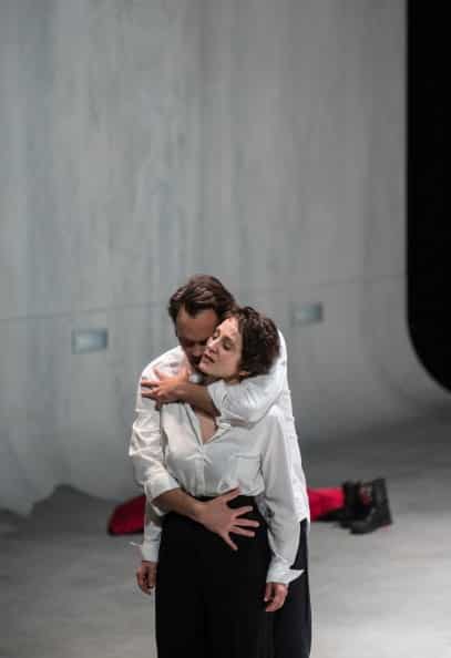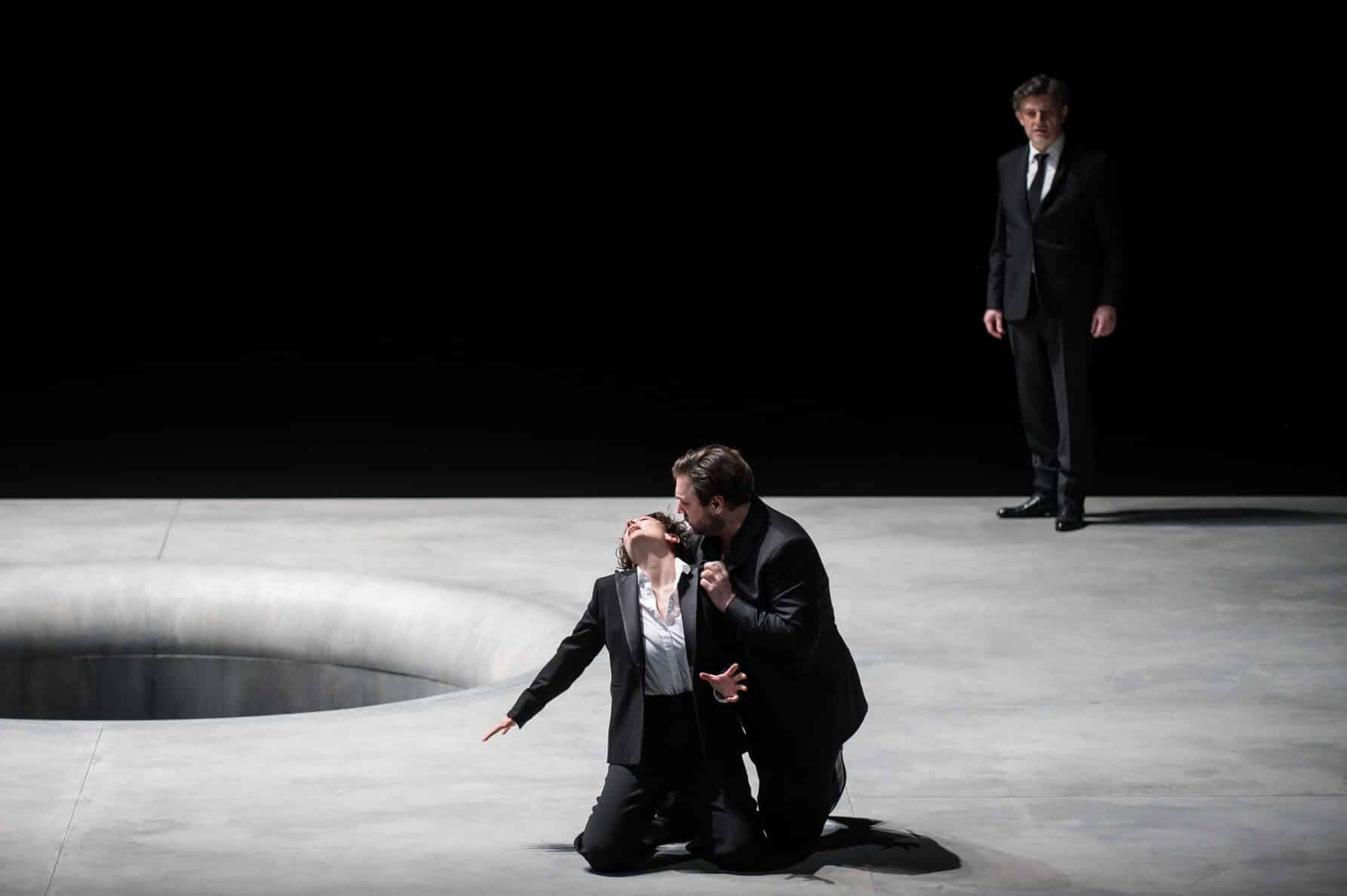 Cette nouvelle production est, à tout point de vue, une très belle réussite. Visuellement, le spectacle proposé par Daniel Jeanneteau est très fort. À rebours de l’actuelle tendance consistant à plaquer sur les œuvres un discours qui lui est plus ou moins étranger et à sommer le spectateur d’y adhérer, au risque parfois de le laisser parfaitement indifférent à ce qui se passe sur scène – ou pire, de l’irriter ! –, Daniel Jeanneteau, à l’instar d’un Bob Wilson mais avec des moyens et dans une esthétique très différents, n’impose rien mais suggère, ouvre des pistes, révèle les possibles de l’œuvre tout en en cristallisant la teneur poétique et dramatique. Deux grands murs gris de part et d’autre d’un sol lui aussi gris béton, le plateau étant percé d’un immense trou – dans lequel Pelléas disparaîtra au moment de sa mort – figurant aussi bien l’étang du premier acte que la fontaine du parc, le fond de la scène disparaissant dans une obscurité complète : l’on pouvait craindre que la scénographie se révèle trop austère sur la durée et engendre une certaine lassitude au fil des cinq actes. Elle permet en fait, outre de très poétiques apparitions et disparitions de personnages (tel ce chevalier en armure, seule allusion au contexte médiéval de l’intrigue, qui traverse lentement la scène au début du second acte et dont la silhouette disparaît lorsque Mélisande perd l’anneau de Golaud), de focaliser l’attention sur les relations entre les personnages et le jeu des acteurs (les interprètes s’avérant tous être d’excellents comédiens). Le personnage de Mélisande est particulièrement intéressant : mal fagotée au premier acte, avec une coupe de cheveux à la garçonne (la si féminine Vannina Santoni en devient méconnaissable !) et vêtue d’un simple pantalon et d’un sweat à capuche, le personnage est dans un premier temps quasi asexué : tout se passe comme si les personnages masculins (Arkel inclus) allaient projeter sur elle une féminité et une sensualité exacerbées, qui correspondent en fait fort mal à la vraie nature du personnage et que Mélisande semble porter malgré elle, comme ces habits dont on l’affuble au deuxième acte (une robe rouge, des chaussures élégantes) mais dans lesquels elle se sent très mal à l’aise – au point de s’en dévêtir au profit d’un pantalon noir et d’un chemisier blanc qui finissent par faire de la jeune femme un quasi double de Pelléas.