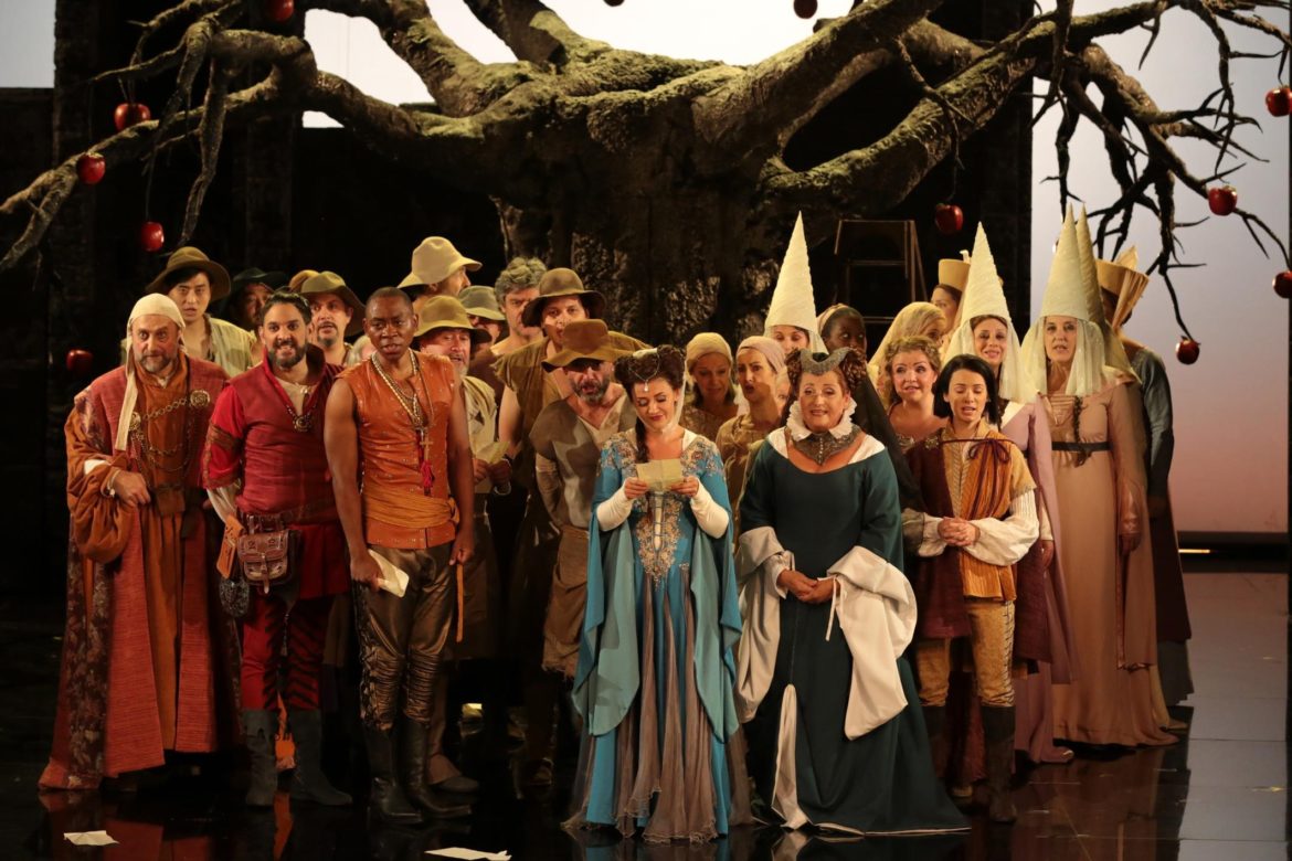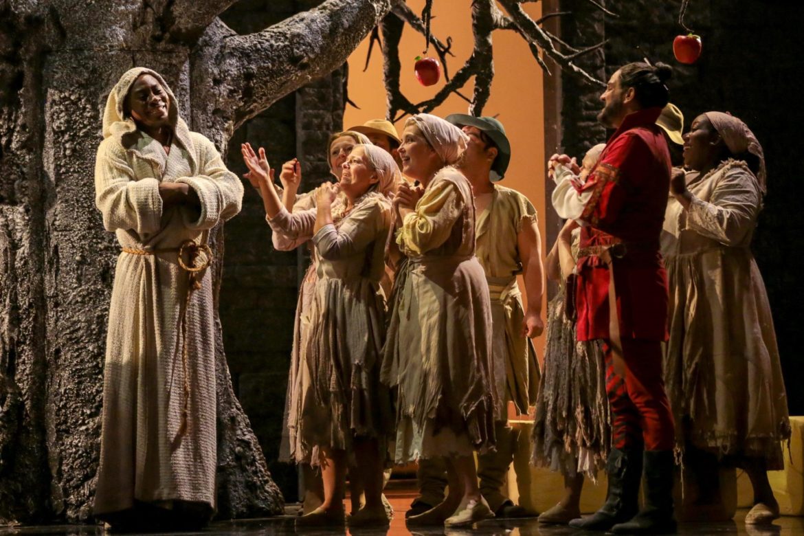 Au centre d’un dispositif associant quelques pans de murailles sur lesquels veillent la silhouette d’un clocher, le décor du 1er acte fait la part belle à un gigantesque pommier dont le tronc abrite l’ermitage du Comte Ory. Comment ne pas penser au générique de la série des années 2000 Desperate Housewives qui mettait elle aussi en scène l’ennui de plusieurs femme confrontées à leur désir et à la vacuité de leur existence ? Abordée sous cet angle, la partition du Comte Ory se révèle d’une étonnante modernité, ce que souligne d’ailleurs les éléments de chorégraphie contemporaine que s’approprient les chanteurs et qui permettent à Patrick Kabongo de laisser entrapercevoir la silhouette du rappeur macho sous la défroque de Tartuffe.