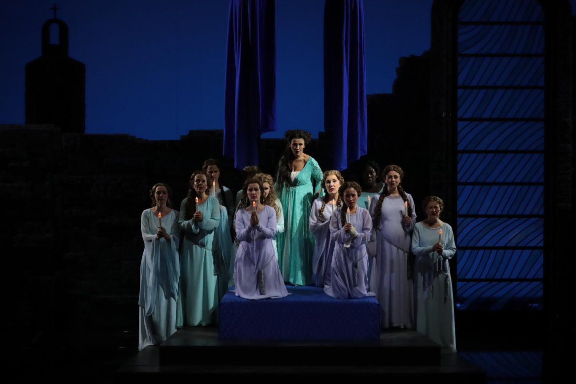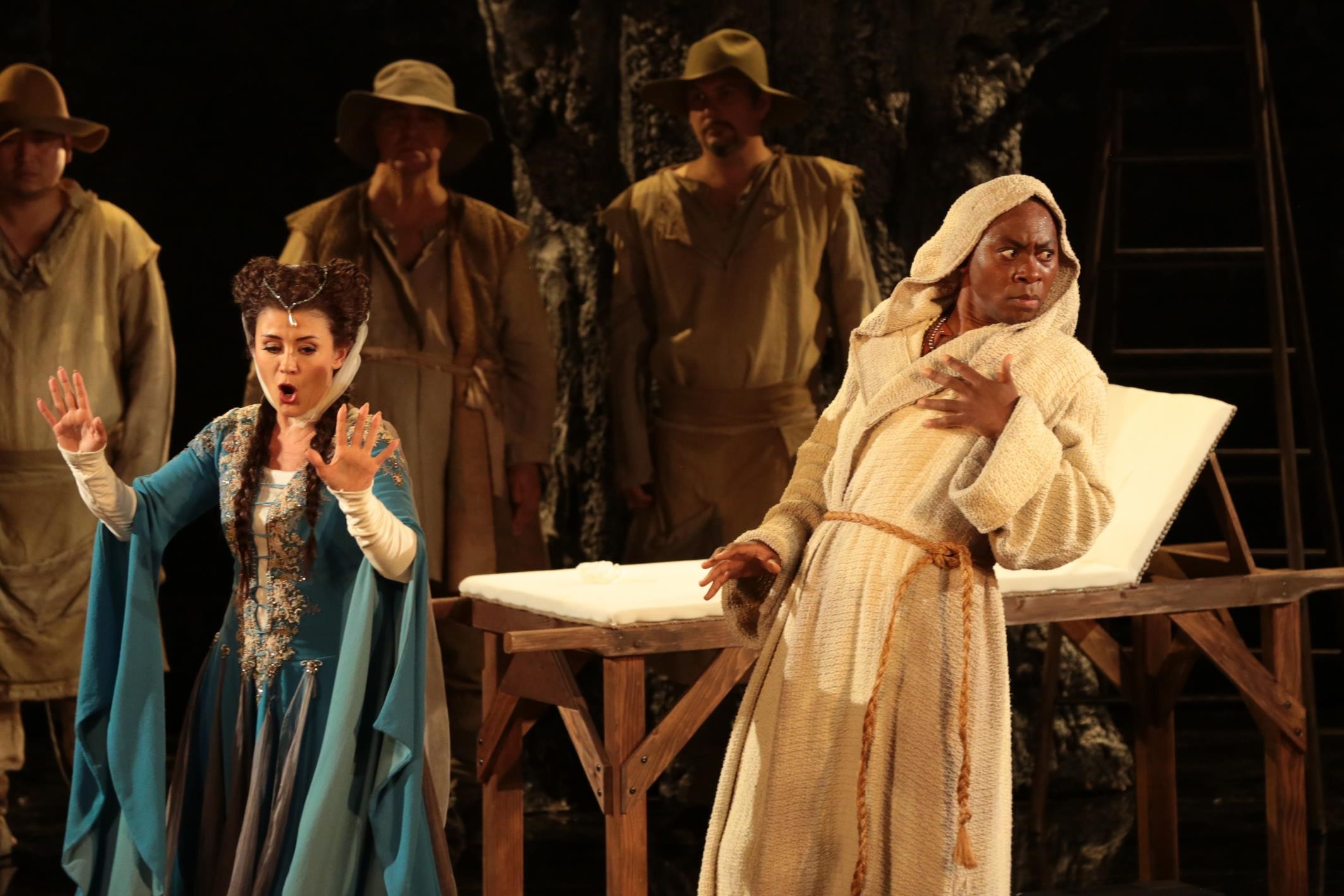 Assistée de la costumière Giaovanna Fiorentini, la metteuse en scène Sylvie Laligne fait le choix d’ancrer le spectacle dans un Moyen-Age de fantaisie : poulaines et hennins rattachent l’esthétique du spectacle au goût troubadour des années 1820 qui virent la composition de la partition mais sans pour autant céder à la facilité d’une production historisante. Le Moyen-Age de Sylvie Laligne regarde plutôt du côté des pochades des Monty Python et de l’esprit de la troupe de Jérôme Deschamps et, même lorsqu’une grande toile peinte descend des cintres pour évoquer le château de Formoutiers, son académisme est tempéré par les chevaux de bois du Gouverneur et d’Isolier qui apportent simultanément un second degré rafraichissant.