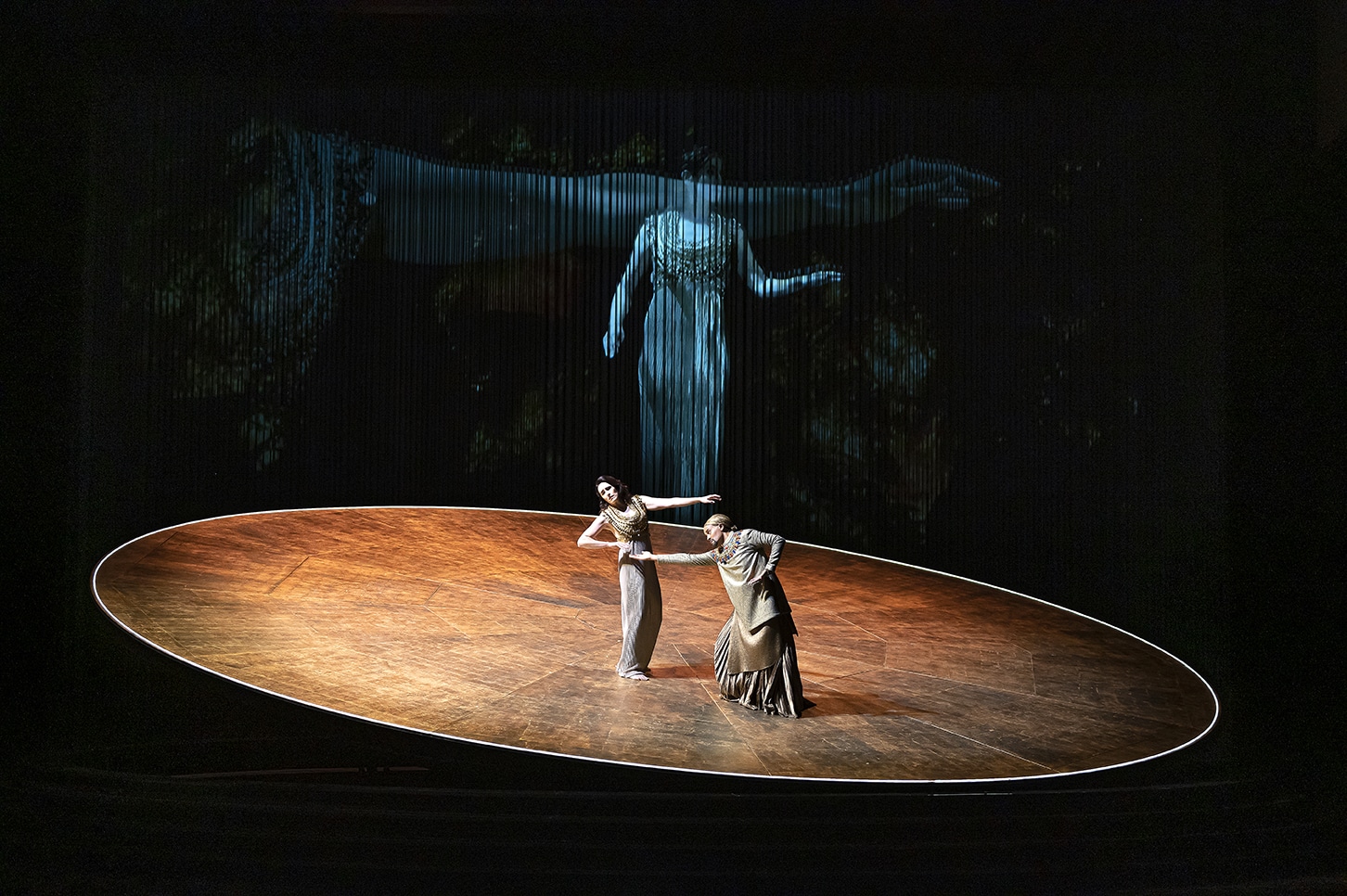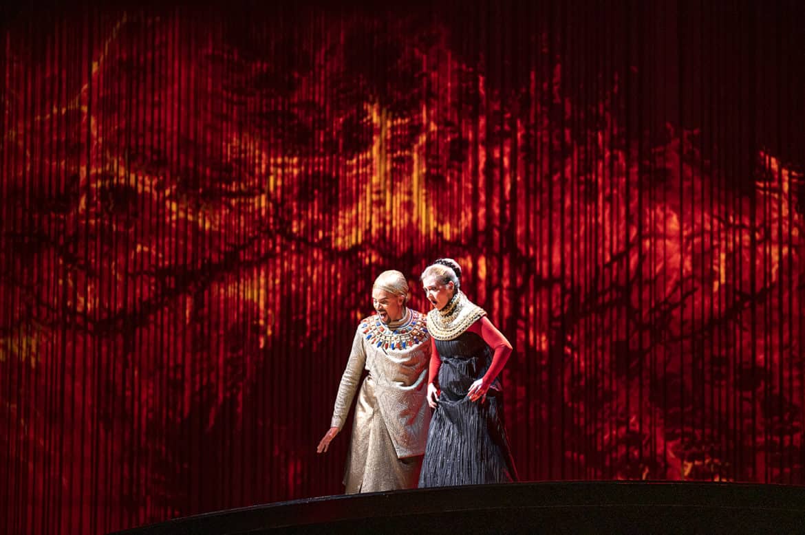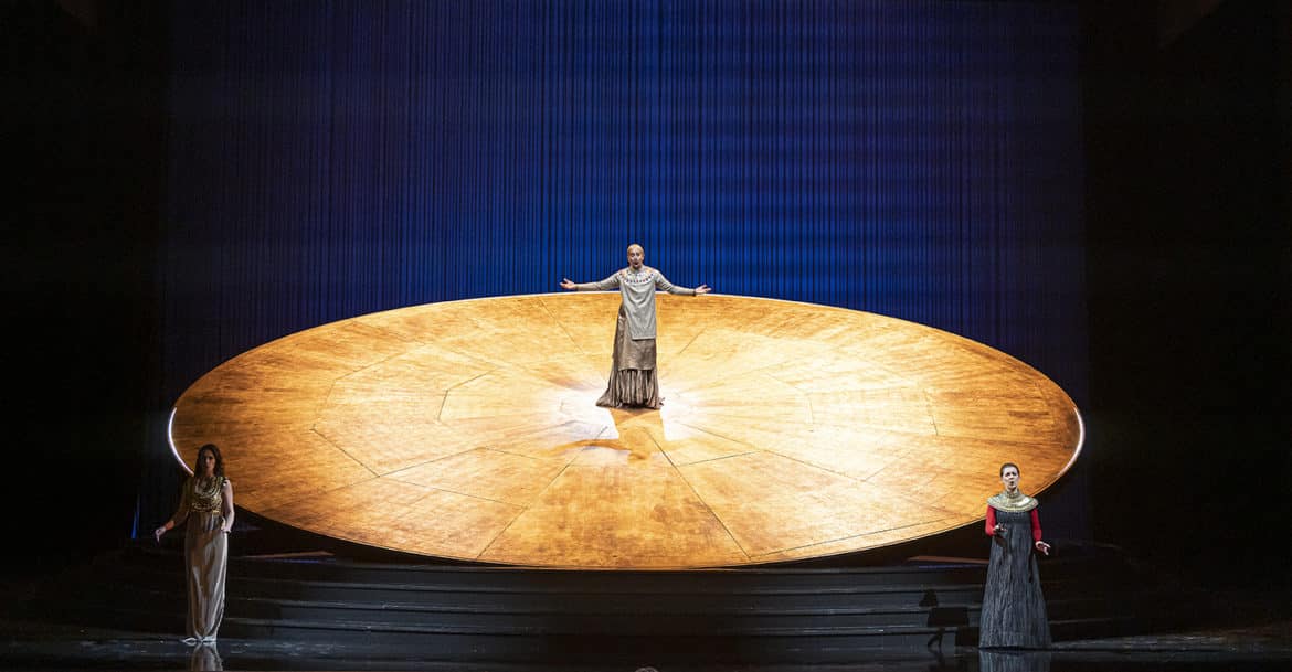 Tout d’abord parce que Lucinda Childs, émouvante personnalité du monde chorégraphique avant-gardiste nord-américain, compagne de route de Glass et Bob Wilson, et Bruno de Lavenère, son scénographe (également en charge des costumes) se sont intelligemment fondus dans l’esthétique du livret d’un ouvrage qui procède par touches successives pour aborder dans sa globalité la fascinante histoire du pharaon Amenhotep IV devenu Akhenaton. Ici, aucun risque de se retrouver dans une production kitsch d’Aïda ! Sous-tendue par les lumières de David Debrinay et une vidéographie magistrale signée Etienne Guiol, aux réminiscences directement sorties du cinéma SF et pouvant projeter cité en construction ou statue d’Amenhotep IV s’effritant lentement, la mise en scène utilise certains symboles incontournables, comme cette représentation du disque solaire, à la fois diurne et nocturne, qui occupe la plus grande partie du plateau : c’est au gré de ses inclinaisons/élévations, rapides ou méditatives, que se déroule l’action chantée et dansée comme c’est le cas lors du ballet, à l’esthétique particulièrement soignée, célébrant la construction de la nouvelle capitale ou dans le magnifique octuor, chanté par la famille réunie du pharaon. On ne peut s’empêcher soudain de penser à l’esthétique d’un Wieland Wagner pour le « nouveau Bayreuth » et, bien évidemment, aux influences du théâtre japonais, si présentes dans l’esthétique de l’école minimaliste. Du très grand spectacle.