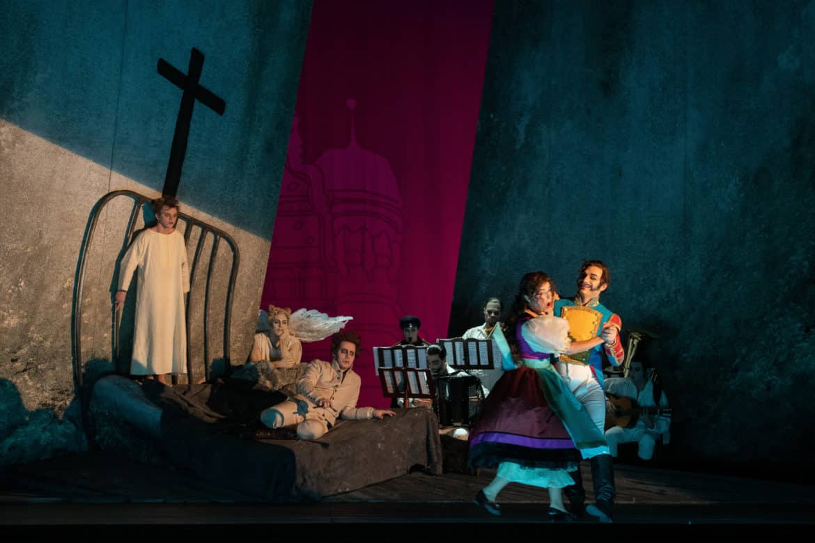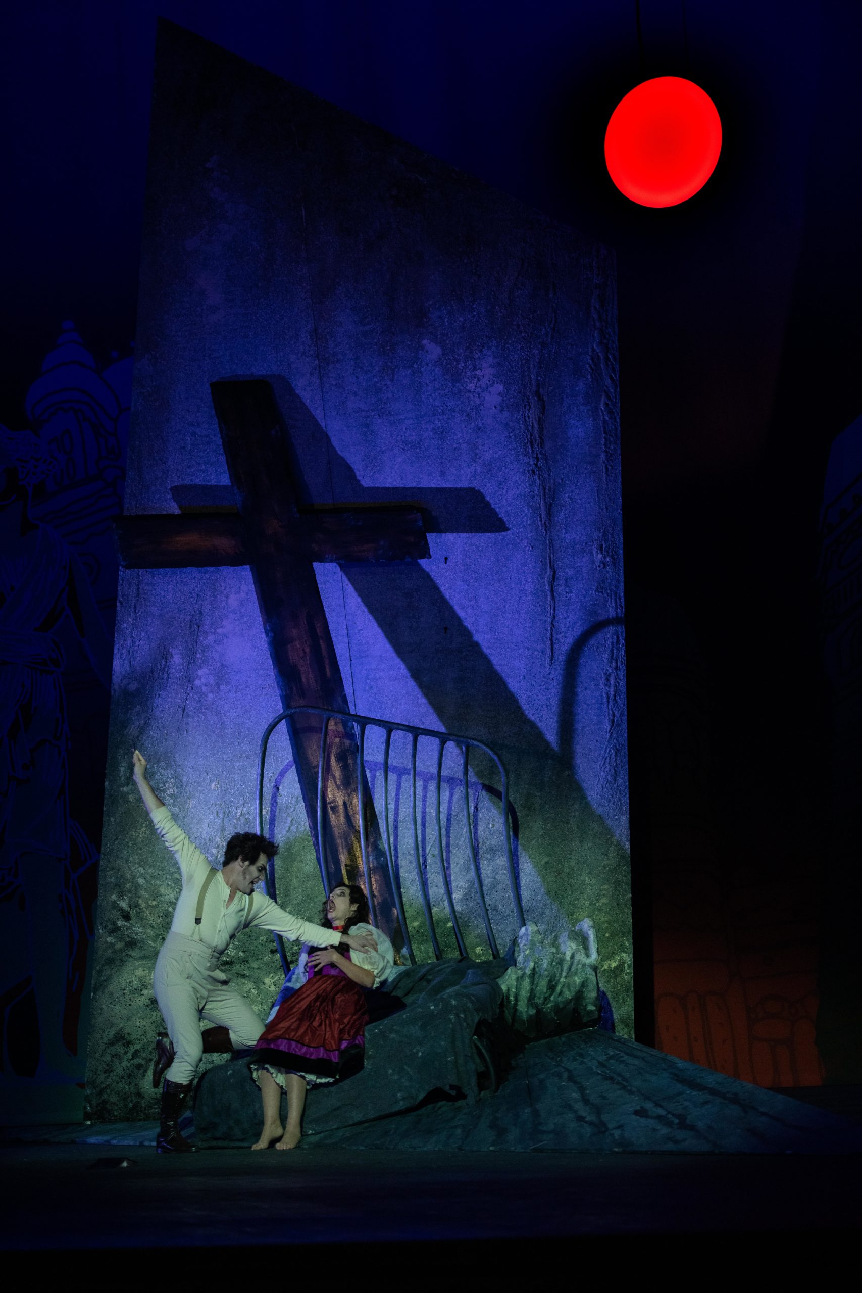 Michel Fau en met beaucoup dans ses mises en scène. Nous verrons donc aussi ici et là un rapport qu’on suppose freudien à la mythologie et un goût prononcé pour la plomberie humaine que nous n’avions pas perçu dans le livret original. Wozzeck ne tousse plus dans la rue, il pisse. Le petit n’est plus en sueur mais est constipé. Le Capitaine sera paralysé du bas mais surtout de l’entrejambe et les femmes sont chaudes, très chaudes… Bref tout passe par la culotte et pourquoi pas ? Et par Dieu aussi comme semble le suggérer ce crucifix aux tailles changeantes et impressionnantes. Allusion certaine à l’identification de plus en prégnante de Marie, la compagne de Wozzeck, à Marie-Madeleine et sûrement au poids de la religion sur ces destins brisés. Difficile ainsi d’échapper au côté naturaliste de Wozzeck, Zola n’aurait pas fait mieux.