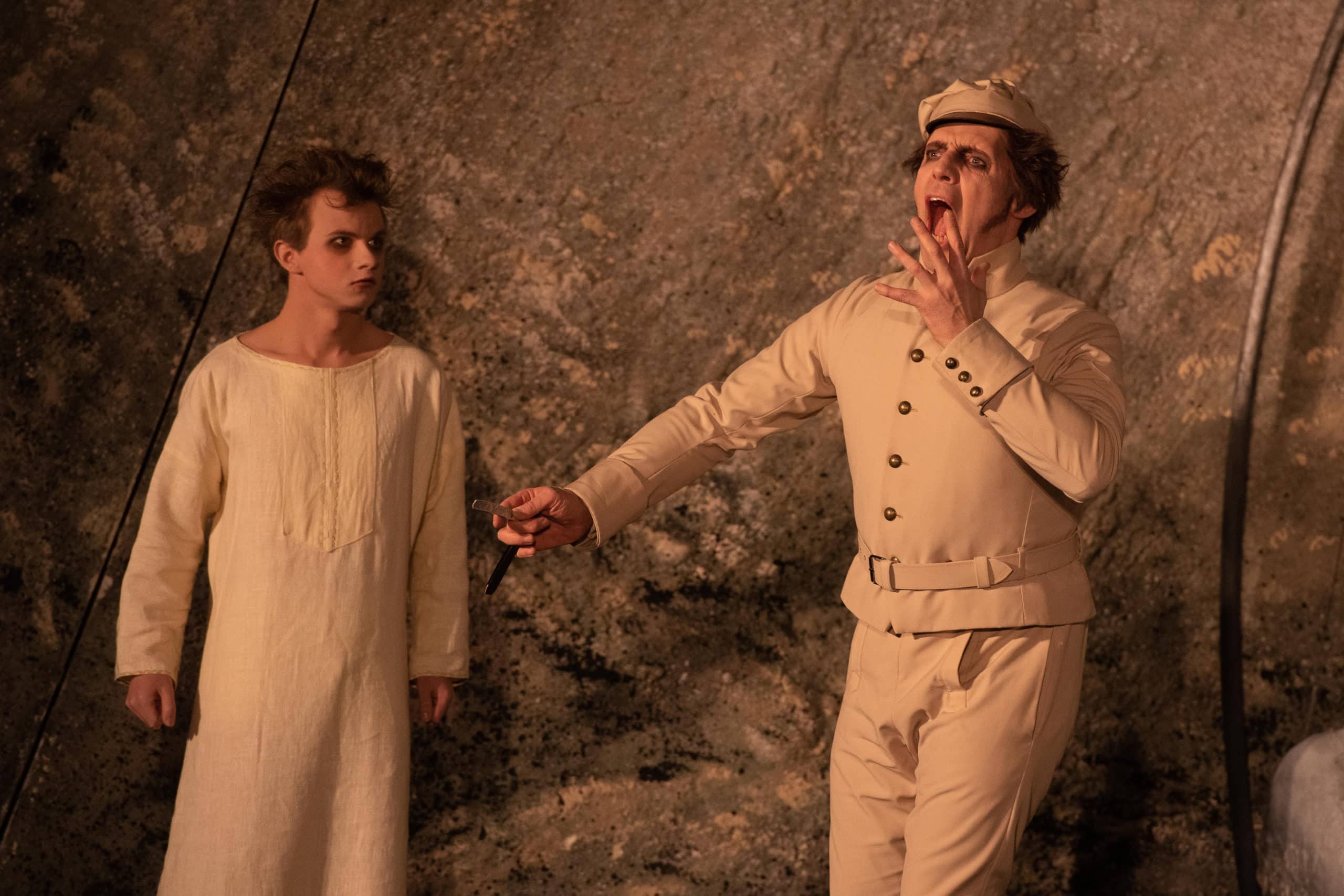 Il y a effectivement beaucoup plus à entendre sur scène où les acteurs-chanteurs sont incroyables d’investissement et de maîtrise vocale. Berg n’a nullement renoncé aux moyens du bel canto dans son opéra qu’on assimile souvent trop rapidement au Sprechgesang, cette « déclamation rythmée », traitement « mélodramatique » de la voix. Wozzeck se chante donc même s’il reste un challenge vocal pour tous les rôles et ne peut jamais se dissocier totalement du théâtre. Ce sont des personnages qu’on interprète et pas des rôles qu’on chante, et même s’il y en a de plus grands que d’autres, il n’en a pas de petits. Krisofer Lundin est un idiot étrange et inquiétant et les ouvriers de Matthieu Toulouse et Guillaume Andrieux endossent leurs costumes loufoques avec talent. La Margret d’Anaïk Morel cache à peine sous une belle rondeur vocale un regard accusateur perçant et une sensualité intrigante. Thomas Bettinger est un Andres à l’humanité qui détonne dans ce monde de fous, surtout face au Capitaine et au Docteur de Wolfgang Ablinger-Sperrhacke et de Falk Struckmann. Ces deux-là sont d’un paternalisme malsain et effrayant. Personnalités incernables, leur folie est un abime sans fond. Nikolai Schukoff compose un Tambour-Majour trivial et phallocrate à souhait.