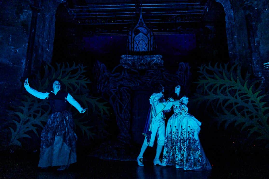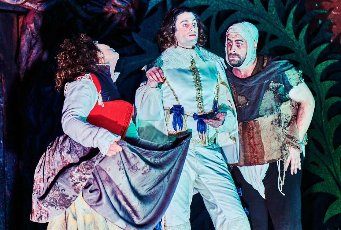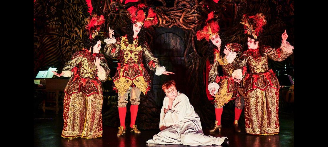 Ce même climat contamine la pastorale où, malgré la richesse et la beauté des costumes de Christian Lacroix, le maquillage outrancier et les plumes des deux couples de Bergers ne fait que prolonger l’impression de cauchemar. Le programme mis à la disposition du public ne précise ni l’identité des personnages ni quel chanteur assure quel rôle aussi il est difficile de féliciter nommément Climène et Cloris, Tircis et Philène pour leur prestation. Gaétan Jarry dirige avec entrain et souplesse une partition pleine de charme et de vivacité depuis son clavecin. Dommage que les musiciens de son Ensemble Marguerite Louise, placés en fond de scène et sans doute sonorisés, couvrent parfois les chanteurs. Hélas, de ballet, point. Si les acteurs de la comédie viennent prêter leur voix au dernier ensemble qui rassemble le parti de l’Amour et celui de Bacchus, il manque au spectacle ce dernier intermède de ballet qui aurait pu en faire un final splendide. Qu’importe, vu la noirceur affichée de la comédie, ces réjouissances chorégraphiques auraient semblé bien incongrues.