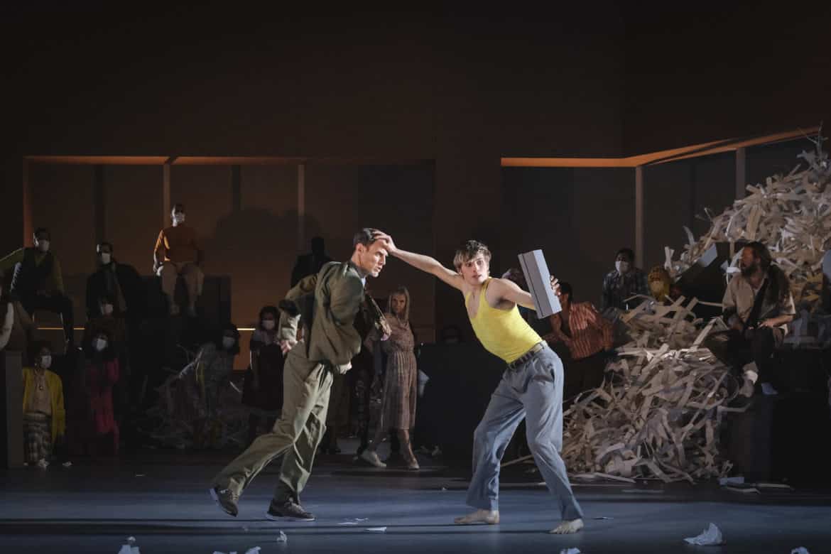 Deux heures et demie durant, malgré les efforts déployés par l’ensemble des interprètes, la scène prise d’assaut par une quarantaine de chanteurs, chanteuses, danseurs (interminable ballet de l’Acte II, dont la signification continue de m’échapper…) paraît tout à la fois surchargée de mouvements et bizarrement désinvestie. C’est d’autant plus dommage que Tuomas Katajala et Cody Quattlebaum sont parfaitement à l’aise dans leur incarnation et dans leur chant. Il en va de même pour la colorature Marie-Eve Munger qui, en éloquent Rossignol, se couvre de gloire dans le faux duo d’amour avec Bonespoir qui ouvre l’acte II, scène sublime de subtilité dramatique et d’hédonisme sonore. Dommage aussi pour le chœur, dont les interventions inspirées – qu’elles soient comiquement bruitistes ou d’une solennité poignante, comme dans le « Gross ist Zeus, mächtig ist er !» final – comptent pour beaucoup dans la réussite musicale de la soirée.