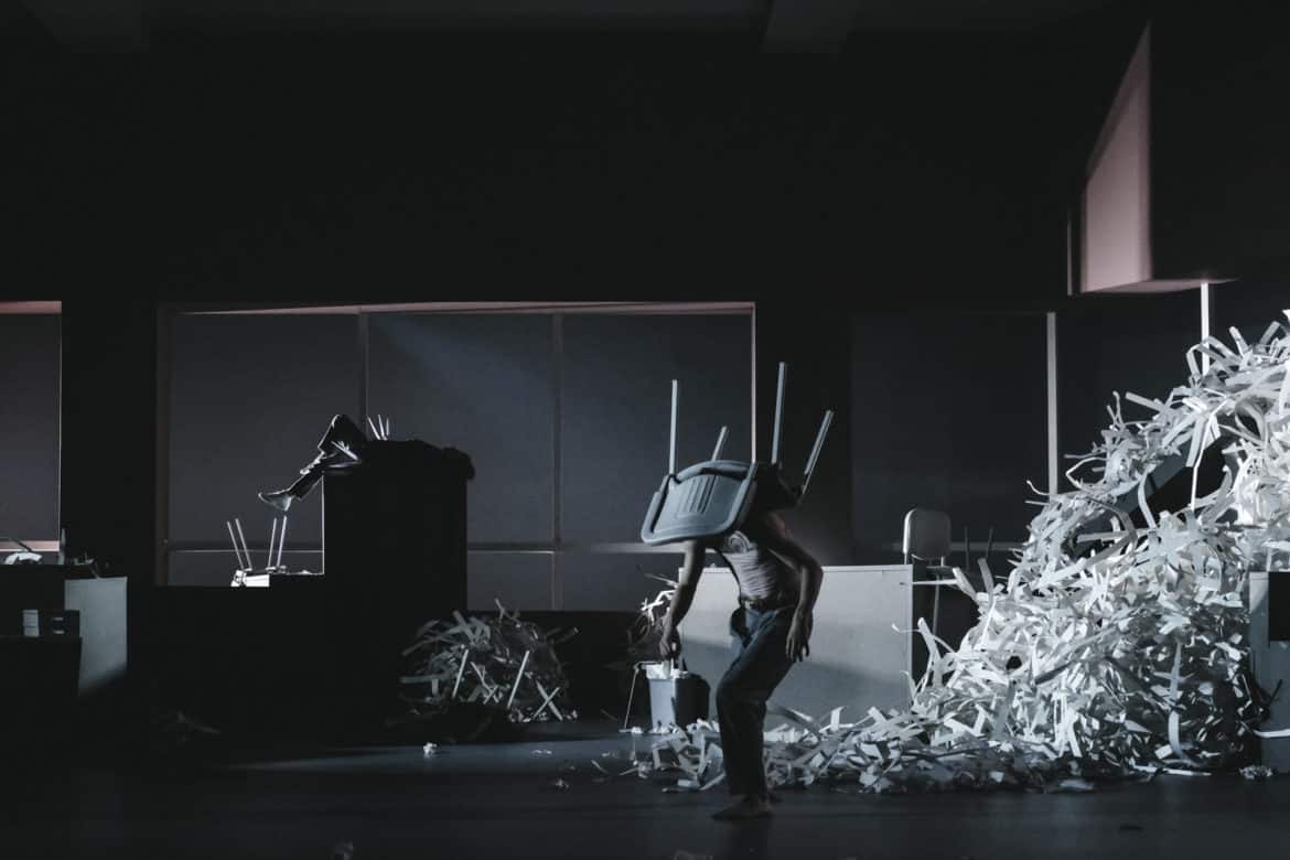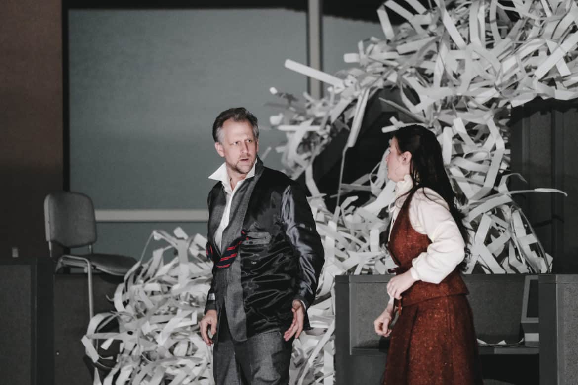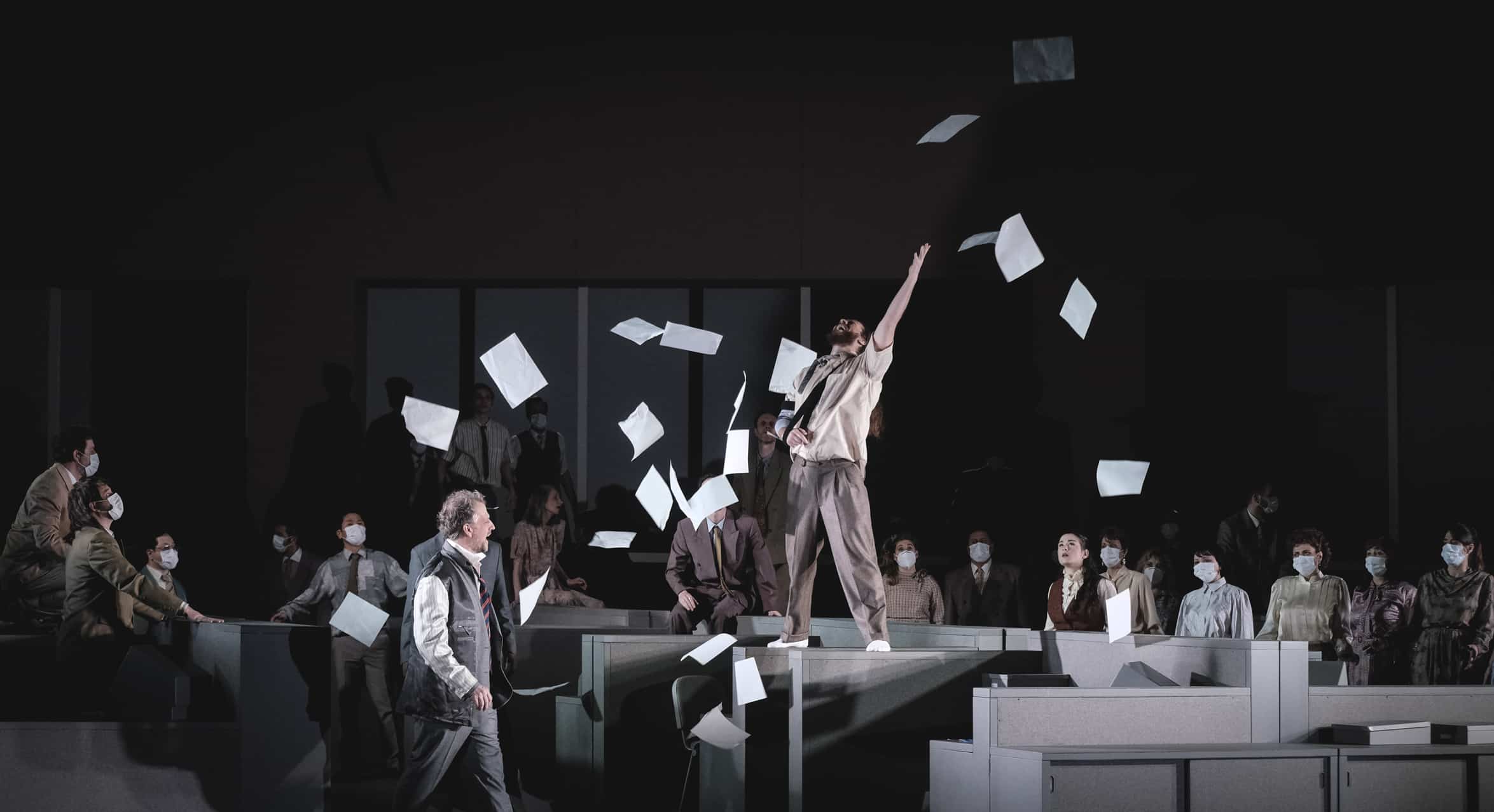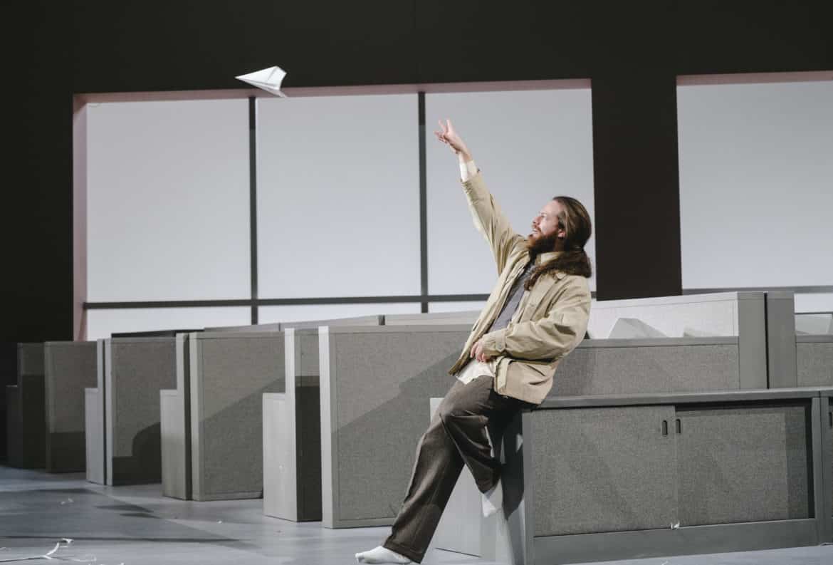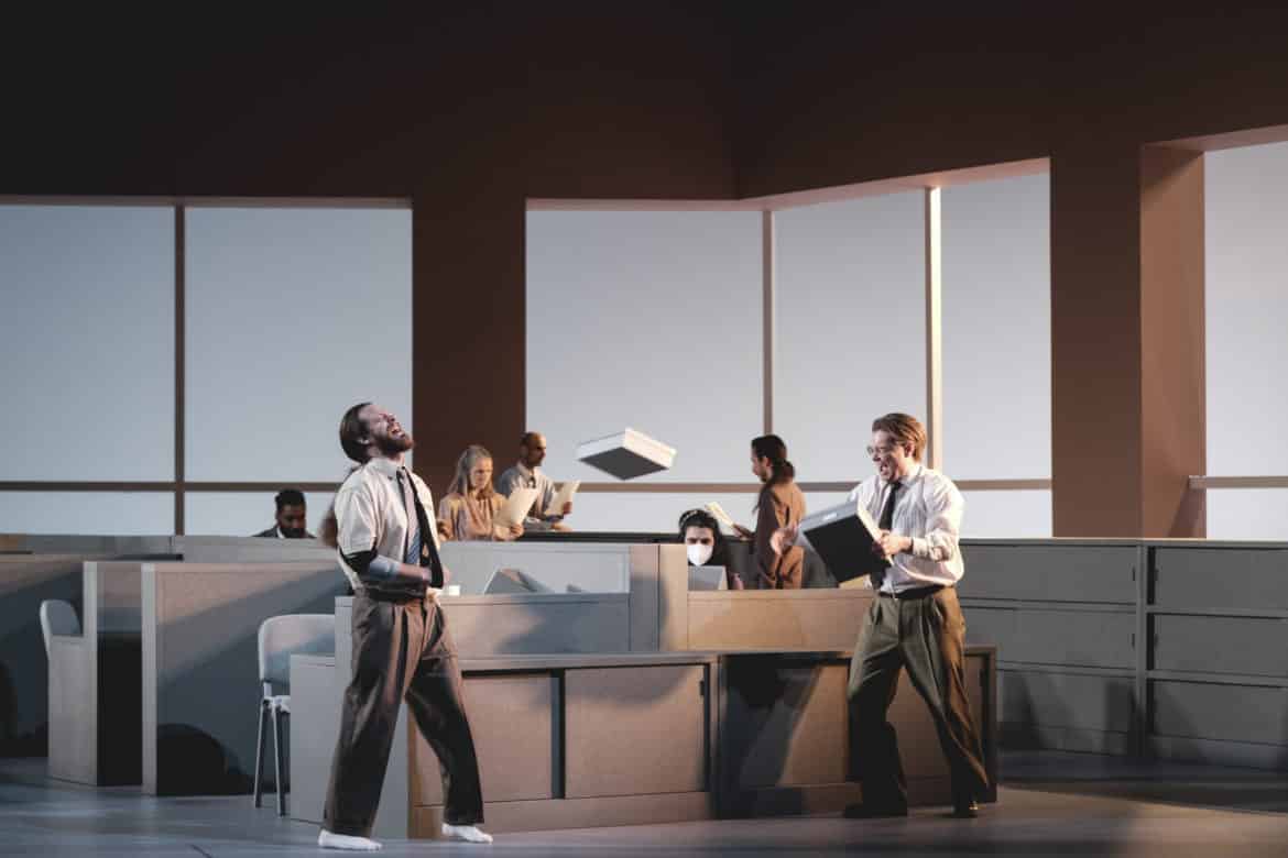 Cette trame fabuleuse, au sens étymologique du terme, avait inspiré voilà un peu plus d’un an à Frank Castorf une mise en scène baroque, bordélique et colorée pour l’Opéra de Munich avec écrans vidéos, échafaudages métalliques, conteneurs de docks, sous l’égide goguenarde d’Alfred Hitchcock et d’Emir Kusturica. Un DVD Arthaus documente une production de Darko Tresnjak pour l’opéra de Los Angeles (2009), apparemment très littérale avec débauche de plumes bigarrées et temples de carton pâte. À Strasbourg, hier, Ted Huffman a choisi de prendre le contre-pied de ces illustrations en campant l’action des Oiseaux… dans le décor monochrome d’une entreprise anonyme. En somme, de l’open space plutôt que le ciel infini. Nulle trace de volatile dans ces cubicles où le temps passe au rythme des clics de souris, mais des employés ternes et tristes. Parmi eux, comme l’explique le metteur en scène dans sa note d’intention, nos deux antihéros invitent leurs collègues à s’échapper de ce quotidien aliénant pour rejoindre le monde imaginaire des oiseaux. Tout l’opéra ne serait donc qu’une sorte de session de team building et le finale un banal retour au réel, avec fin de récréation sonnée par Zeus – il est vrai qu’à le voir, costumé-cravaté, convoquer un à un les vents déchaînant la tempête, on se représente davantage un chef de service faisant l’appel avant une réunion de travail…