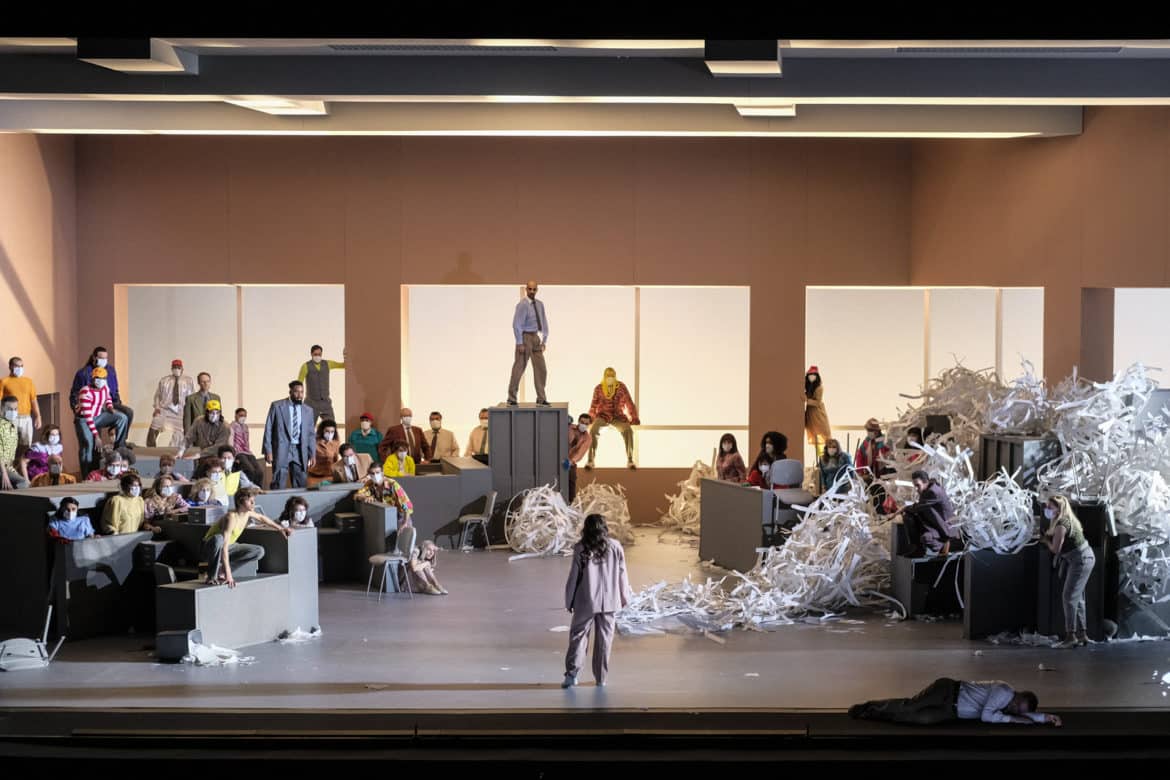 Cette mise en image, si elle peut se défendre sur le papier, passe difficilement sur les planches.  Dès lors, la question se pose : lorsqu’on souhaite faire découvrir au public une œuvre méconnue, n’y a-t-il pas un contresens, ou un risque inconsidéré, à s’en écarter aussi radicalement ? Pour rester dans le même registre corporate : quand Michael Haneke transpose Don Giovanni dans une tour de la Défense, il peut se le permettre car tout le monde connaît l’opéra de Mozart (bon, d’accord, et aussi parce que c’est Michael Haneke…). En attendant que Les Oiseaux soit programmé dans les théâtres lyriques du monde entier et son argument connu de tous les mélomanes, n’était-il pas prématuré d’en proposer, déjà, une relecture ?