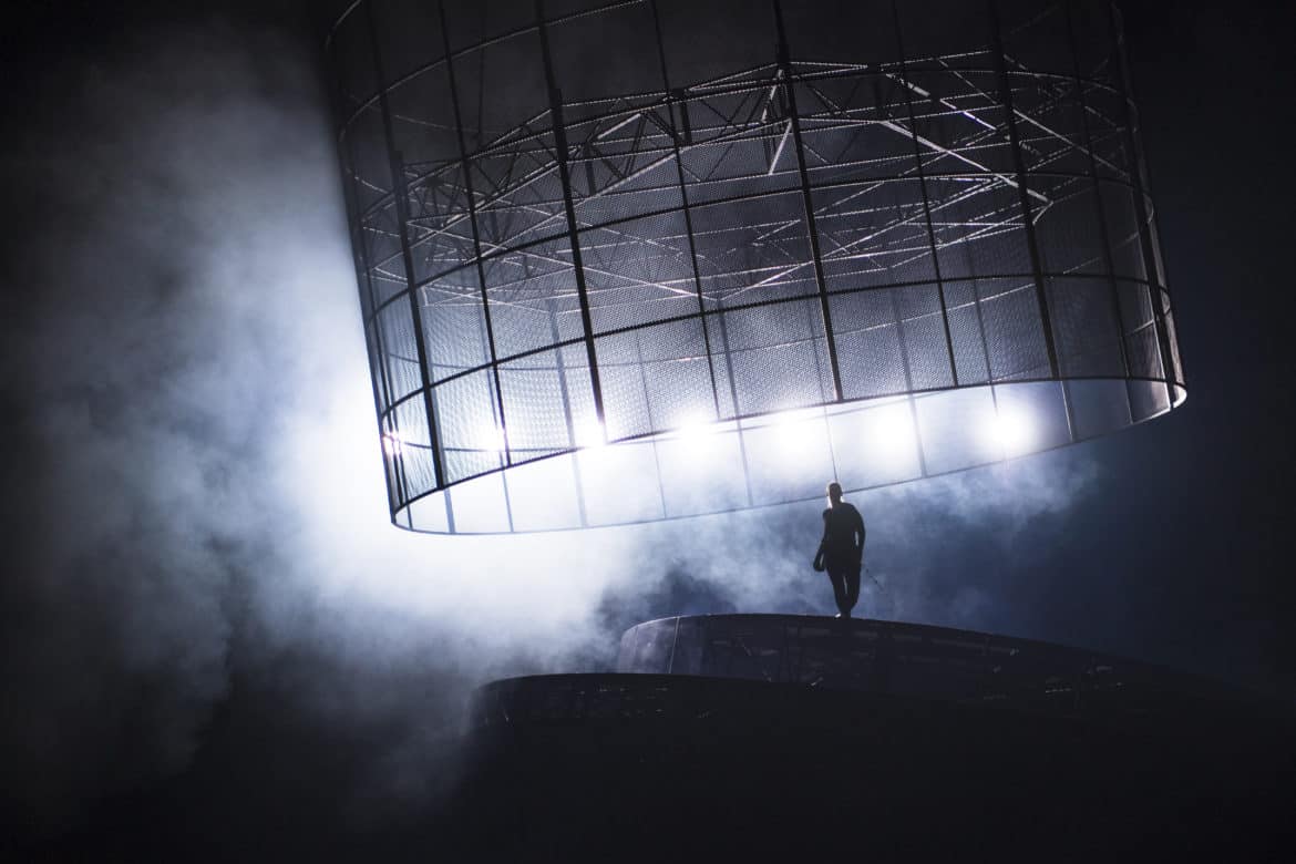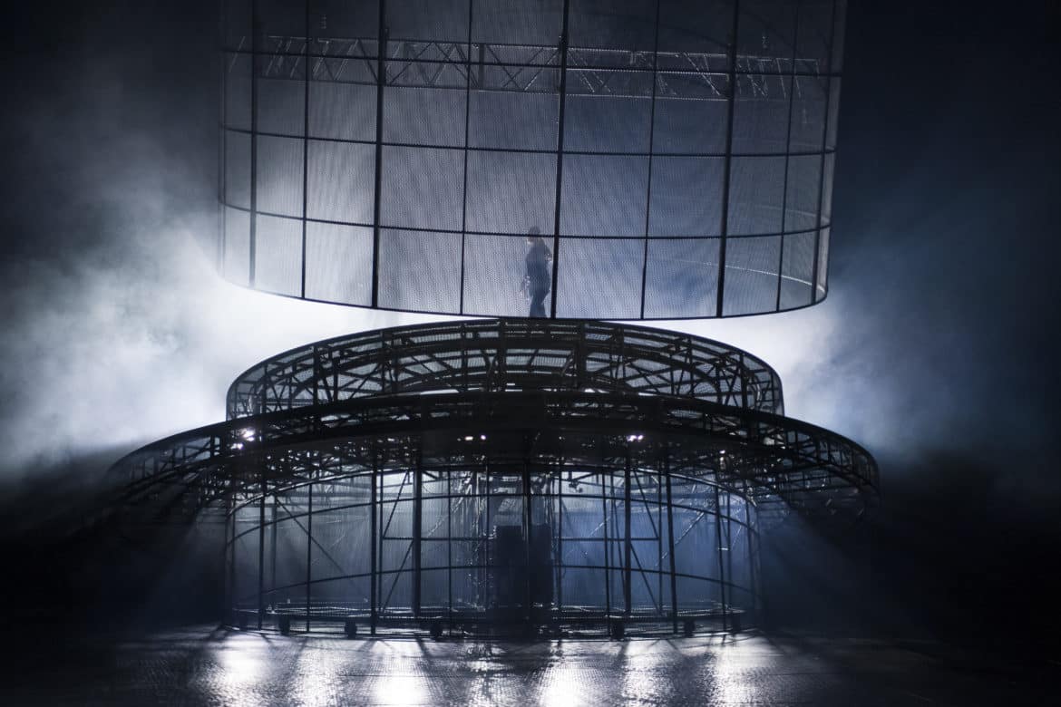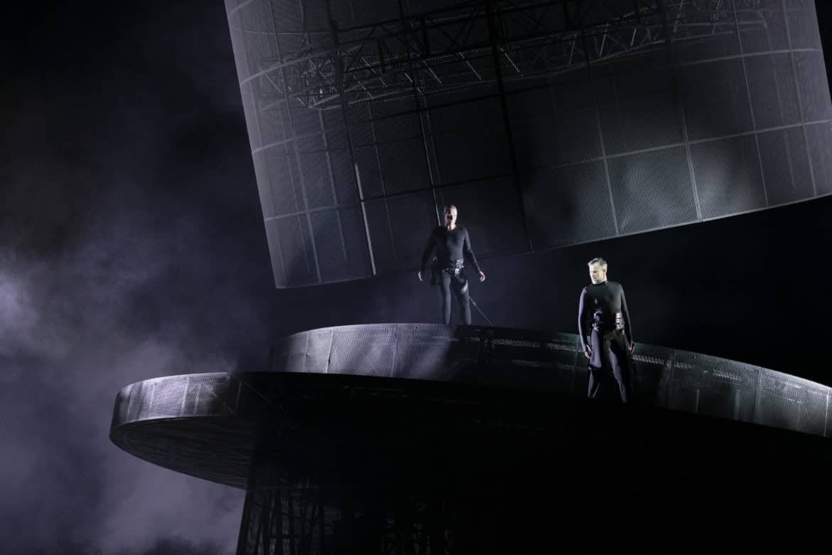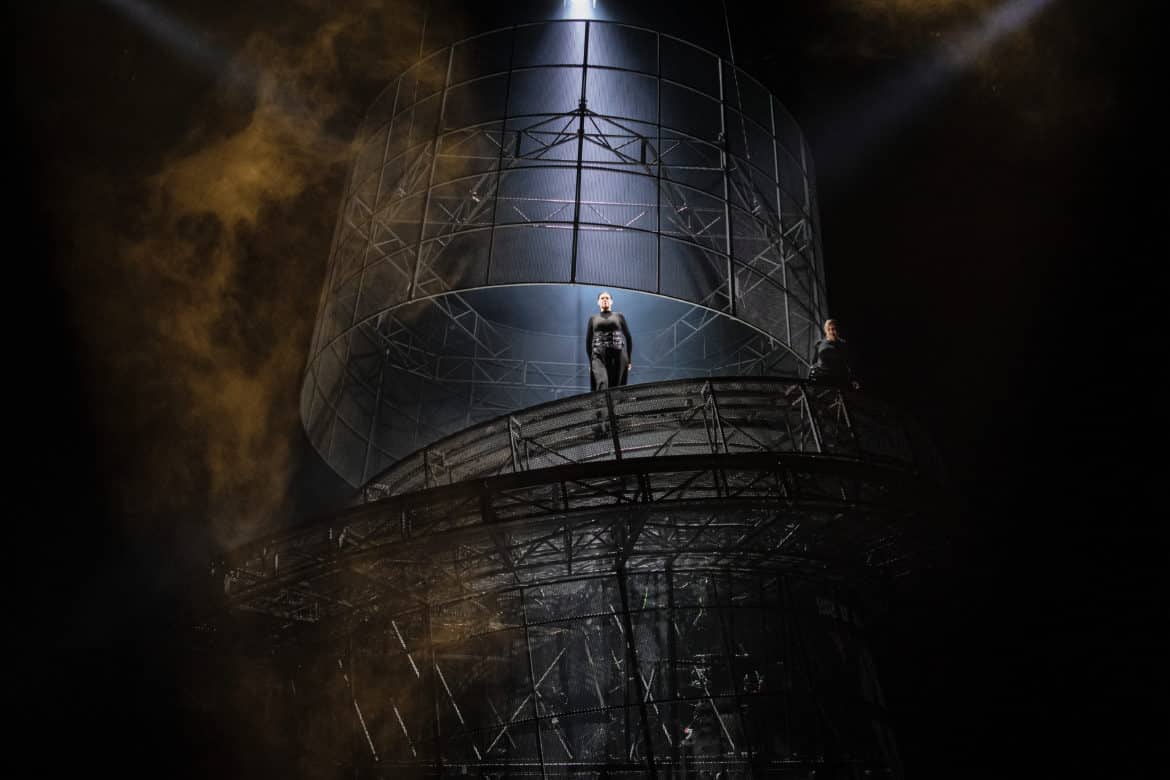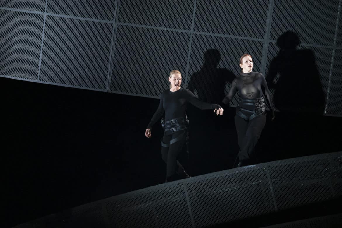 Le metteur en scène allemand se frotte pour la première fois à l’opéra mais pas à Elektra qu’il connaît bien. Il reprend et adapte au Grand Théâtre de Genève sa mise en scène de la pièce de théâtre de Hugo von Hofmannsthal créée en 2018 à Munich. Le procédé n’est pas nouveau comme en témoigne le récent Roméo et Juliette de Gounod à l’Opéra Comique. Le dispositif scénique est monumental et impressionnant, gigantesque palais de métal, mi-tour de prison mi-machine d’exécution aux rouages mouvants. Sur d’énormes plateaux tournants, des plates-formes élévatrices ou des tapis roulants, les chanteurs marchent, harnachés et encordés, scandant en rythme leurs désespoirs, leur vengeance et leurs violences.