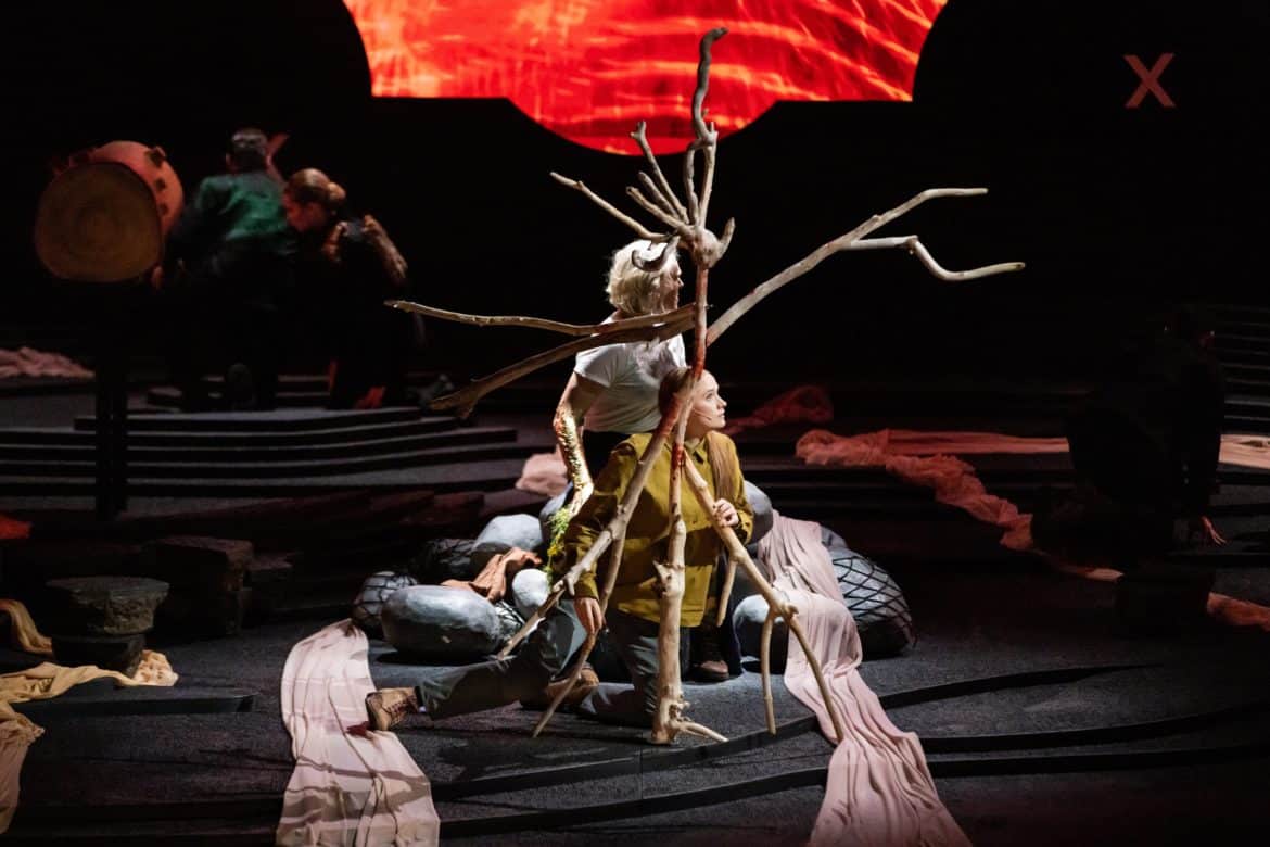 La dramaturgie musicale s’organise autour du concept de métamorphose avec une audace hors du commun que nous saluons pour le premier opus lyrique de Sivan Eldar. « La terre est un palimpseste » s’exclame le chœur de la Forêt (scène 12). L’imaginaire de la compositrice se raccorde également au palimpseste de tous ses devanciers (opéras de J. Peri, F. Cavalli, C.W. Gluck, R. Strauss) sur la thématique de métamorphose. Elle mobilise trois strates, comme autant de ramifications du monde végétal, mais sans tentative d’illustrer les 15 tableaux. La strate électroacoustique, conçue dans les studios de l’IRACM, est performée par le réalisateur d’informatique musicale Augustin Muller selon une spatialisation immersive : plus de 60 capteurs rampant et ramifiés (sous les sièges du parterre de l’Opéra-Comédie) englobent le spectateur dans une expérience sensorielle envoutante. La seconde strate enchevêtre ses textures acoustiques (une douzaine d’instruments en fosse, en sus du synthétiseur) à celle électro, tandis que la composante vocale des 3 solistes et du chœur est finement sonorisée pour mieux fusionner. La coordination du chef d’orchestre Maxime Pascal (directeur et chef du Balcon) est d’une efficacité sidérante, ménageant les équilibres du continuum sonore et la déflagration de deux climax paroxystiques (scènes 7, 11), approchant les Couleurs de la nuit de F. Bayle.  Outre les sons de synthèse, on perçoit des alliances de timbre (notamment les piccolos suggérant le feu, le scintillement de glockenspiel, le boisé du souffle flûtistique), aussi inventives que celles déployées par B. Britten dans l’inquiétant Tour d’écrou.