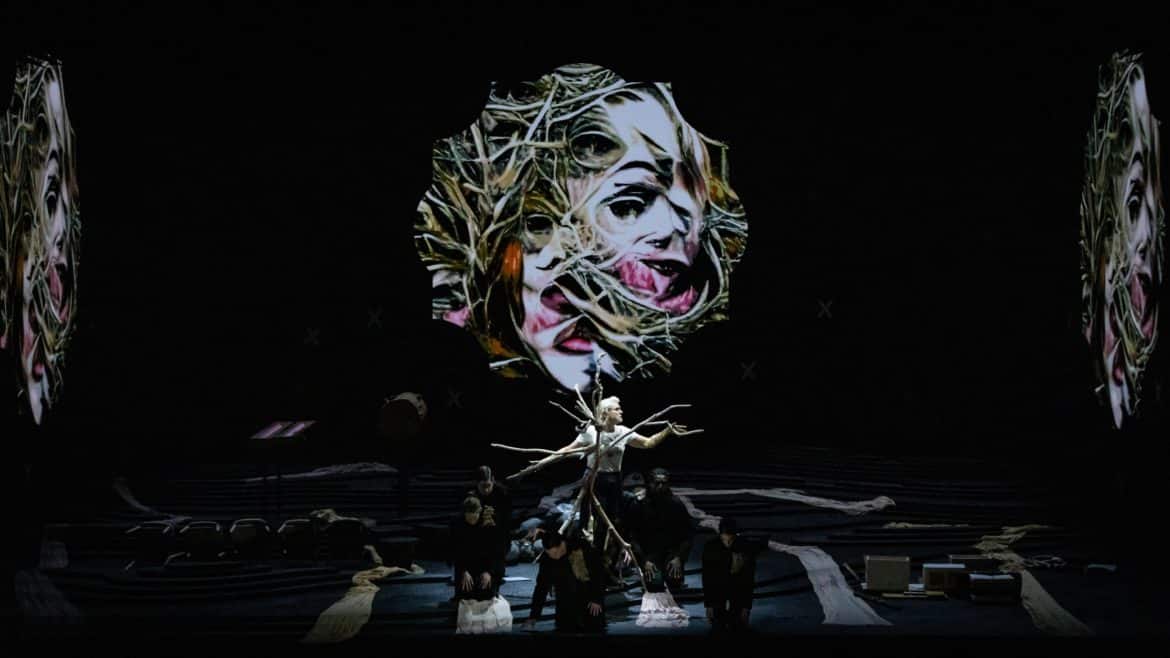 Donner à voir et entendre la métamorphose de la Femme en Arbre ? Lorsque Le Bernin le traduisait dans une statuaire virtuose (Apollo e Dafne), la metteure en scène Silvia Costa et son équipe italienne des arts de la scène construisent un espace scénique d’une esthétique raffinée, dans lequel évoluent des êtres vêtus en habit quotidien et actuel. Le plateau souvent obscur est bien le lieu de la catastrophe climatique (livret influencé par les études scientifiques et anthropologiques actuelles), cependant éclairé par 3 fenêtres en forme de cadre rococo. Celles-ci enchâssent un écran LED qui diffuse des formes mouvantes de la forêt (1re vague des scènes), puis des déformations de souche ou de champignon de plus en plus anxiogènes (scènes 8 à 15), grâce aux procédés d’Intelligence artificielle maniés par le vidéaste Francesco d’Abbraccio. Les lumières (Andrea Sanson) évoquent les milieux reliés aux protagonistes – l’eau régénératrice pour la Femme, la terre et la matière bois pour l’Homme-exploitant forestier, le Feu pour l’étudiante amoureuse.
