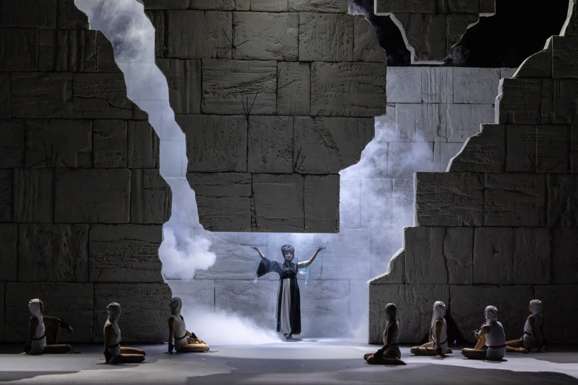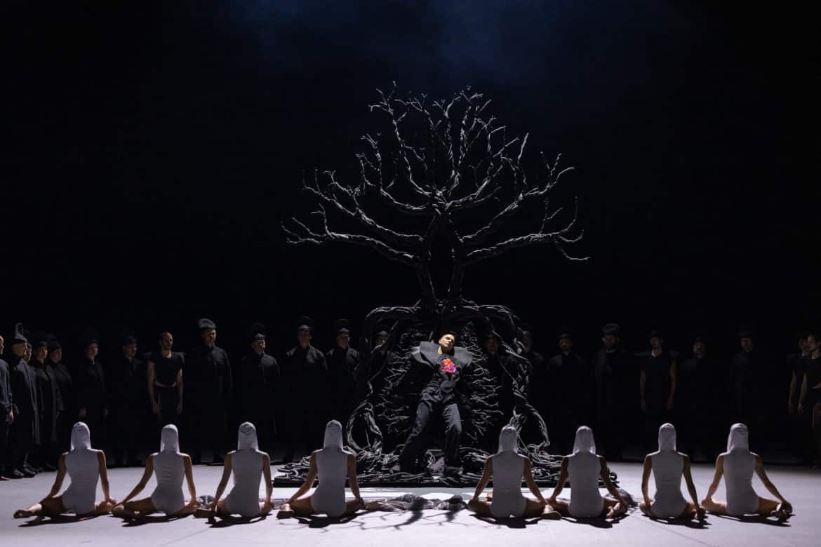 À rebours de lectures qui laissent davantage de place aux fastes, le propos est ici recentré sur l’intimité du drame des amours contrariées, dans une épure classique plus proche des anti-lieux raciniens que des pittoresques baroques. La scénographie décantée de Prune Nourry, en noir et blanc, sous les modulations lumineuses d’Eric Soyer qui prennent à l’occasion des bleutés oniriques galbant l’espace avec une évidente sensibilité, contribue à cette austérité, prégnante surtout dans les deux premiers actes, que ne précédent qu’un réarrangement par Leonardo Garcia Alarcon d’un extrait du Prologue, entre le Temps et Flore, « Les voilà ces humains », et de l’Ouverture – après une réorchestration baroque adaptant l’hymne ukrainien en guise de préambule circonstancié, avec le discours du directeur de Grand-Théâtre, Aviel Cahn. Au III, la pierre blanche jérusalémite se creuse de branches et de racines, dans de très belles nervures développant la métaphore de l’arbre, devenir d’Atys, jusque dans l’ultime scène, où à un arbre de cordes pastichant quelque Homme de Vitruve remontant vers les cintres est suspendu l’objet cultuel du corps défunt. Les variations calotines des costumes dessinés par Jeanne Vicérial participent de la réduction des rituels de Cybèle à leur quintessence dramaturgique.