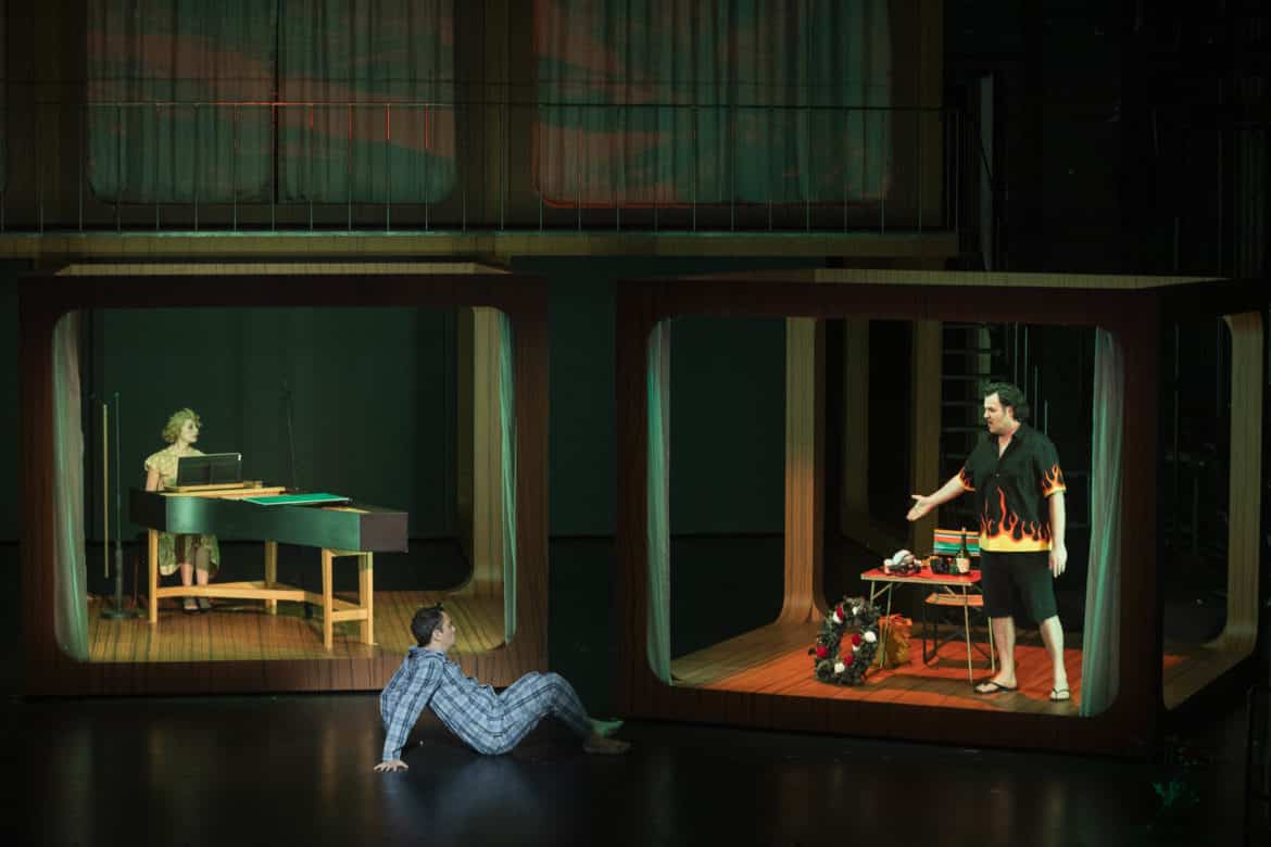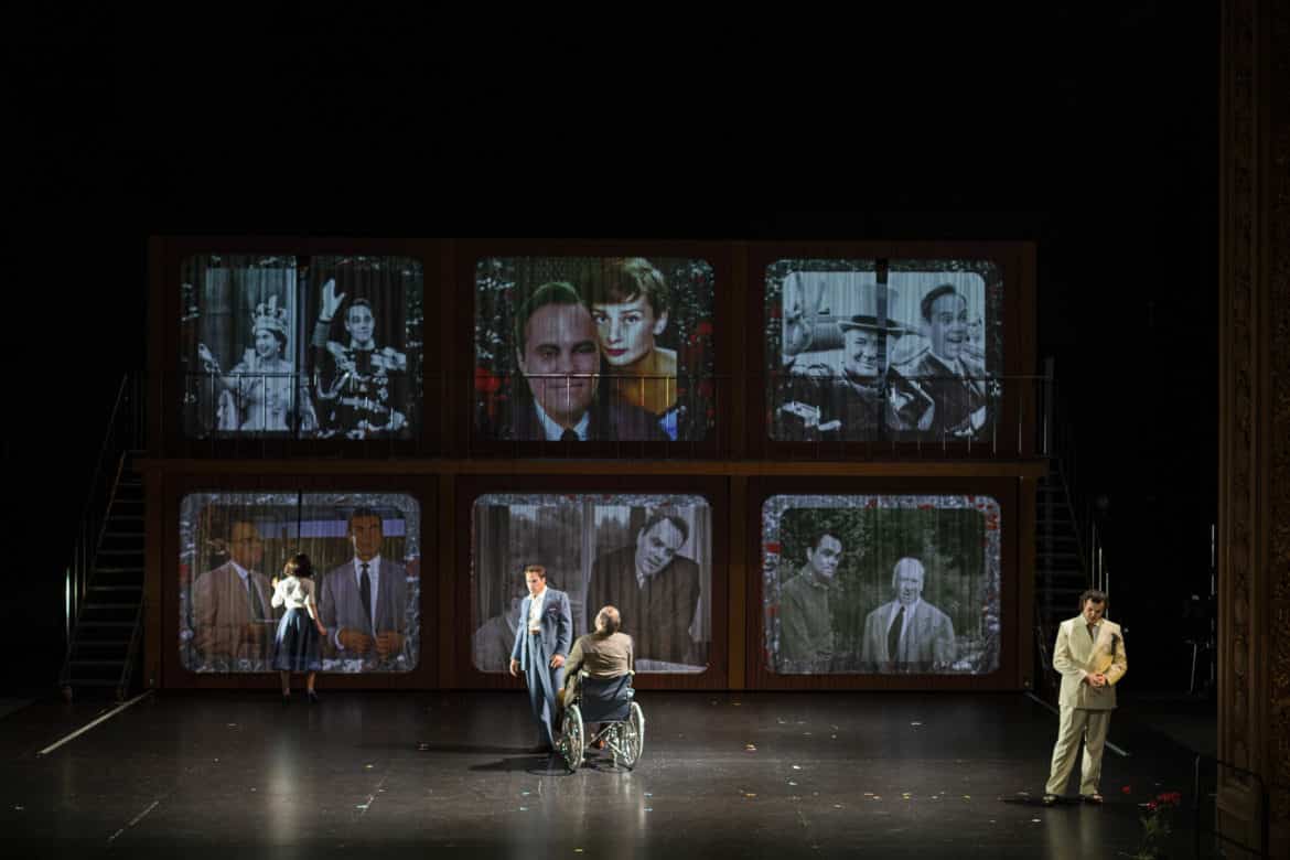 The Rake’s Progress vu par Mathieu Bauer, c’est l’opéra de l’avoir et pas de l’être, le mariage pas vraiment improbable entre « To be or not to be » et La dolce vita. Le metteur en scène place le spectateur face à six impressionnants modules, six immenses téléviseurs qui nous vendent le rêve des années 50 au travers de fenêtres ouvertes sur un monde de consommation et d’apparences mais aussi miroirs des aspirations des protagonistes et lieux intimes des péripéties rencontrées par Tom Rakewell et qui le conduiront à la folie. Ce dispositif scénique permet aussi de donner cohésion et cohérence à la multitude des tableaux mis en musique par Igor Stravinski. La direction d’acteur inventive articule ainsi avec talent musique et rythme, chant et image et compose une partition visuelle singulière et terriblement efficace, un montage théâtral à la hauteur des collages musicaux, sublimes plagiats, d’Igor Stravinsky.