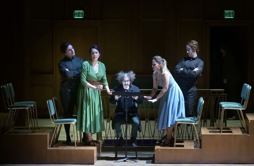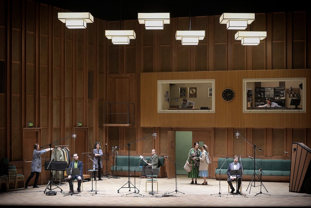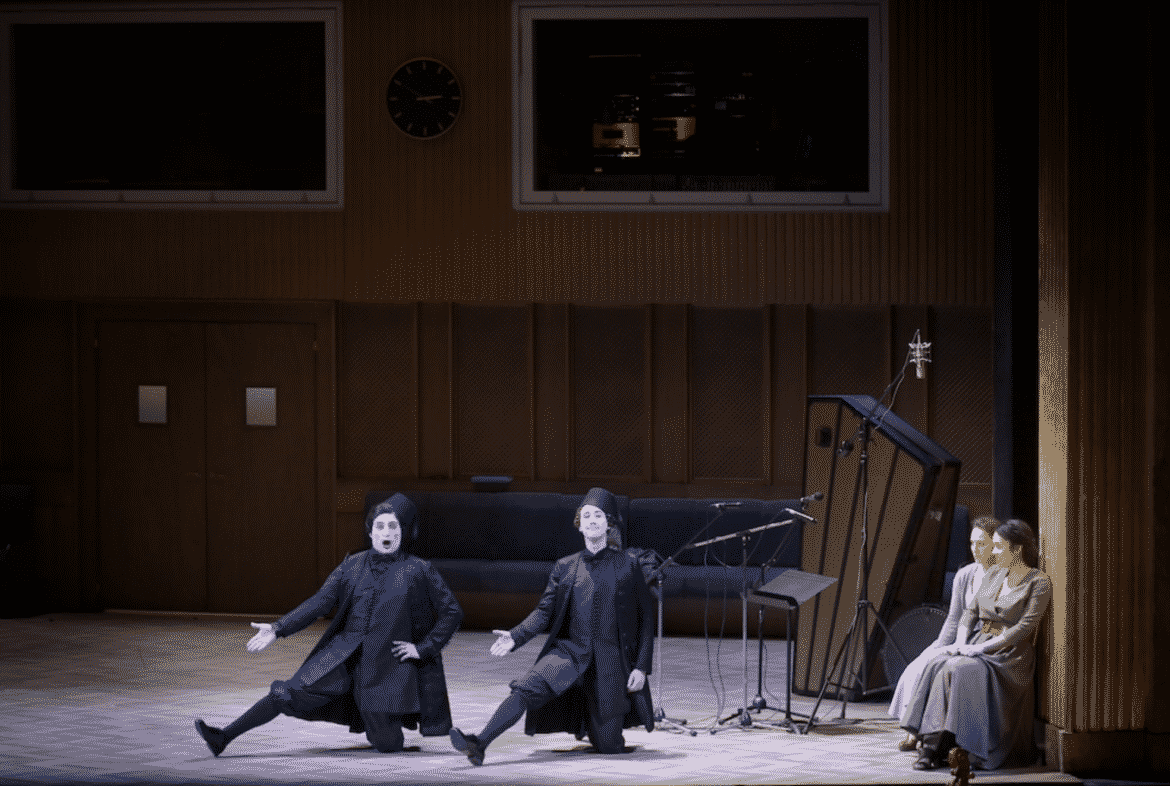 De fait, cette nouvelle production de Così fan tutte souffre d’un réel déséquilibre entre la qualité des prestations vocales et musicales et la proposition scénique confuse. Laurent Pelly précise dans sa note d’intention (rarement bon signe d’avoir besoin de s’y référer pour clarifier le propos du metteur en scène) qu’il voulait montrer comment des artistes participant à une session d’enregistrement de l’opéra de Mozart pouvaient se laisser peu à peu envahir par leur personnage. Idée séduisante, au fond (même si elle pourrait se plaquer sur n’importe quel autre opéra), comme paraît d’emblée séduisant ce décor de studio d’enregistrement « inspiré d’un immense studio qui existe réellement à Berlin » (ah. Et ?). Les tenues des protagonistes laissent deviner une vague décennie 1950, et l’on verrait pour un peu la silhouette de Walter Legge se profiler dans le box vitré qui surplombe la salle (dans cette transposition, le rôle du directeur artistique semble échoir à Don Alfonso, « aux manettes » de cette machination). Mais l’idée peine malheureusement à se matérialiser de façon convaincante, au point que le second acte semble y renoncer tout à fait, reléguant dans l’ombre l’encombrant fatras de micros, pupitres, empilement de chaises – tout juste s’offrent-ils un come-back dans le finale, comme pour justifier in extremis la proposition scénique…